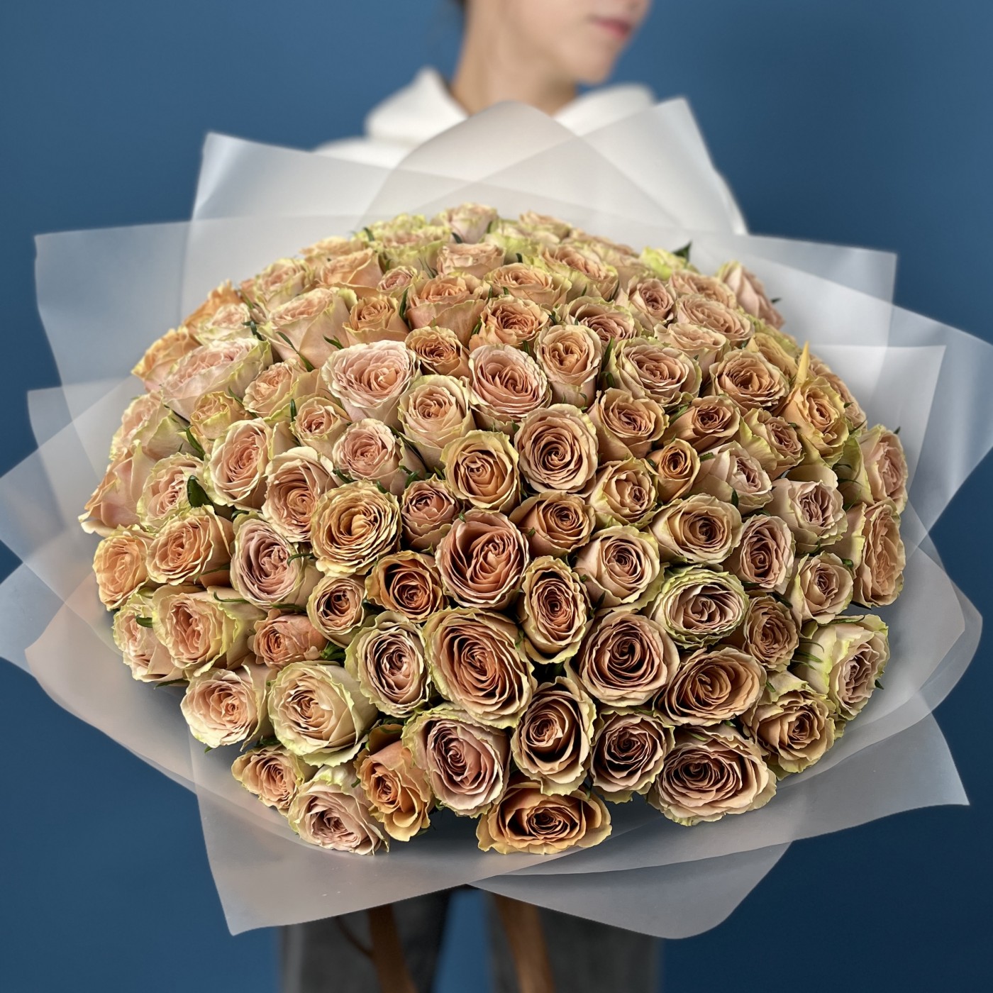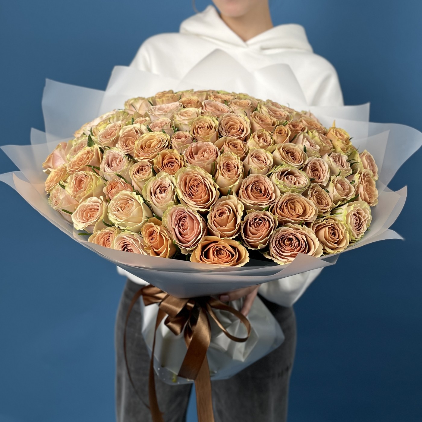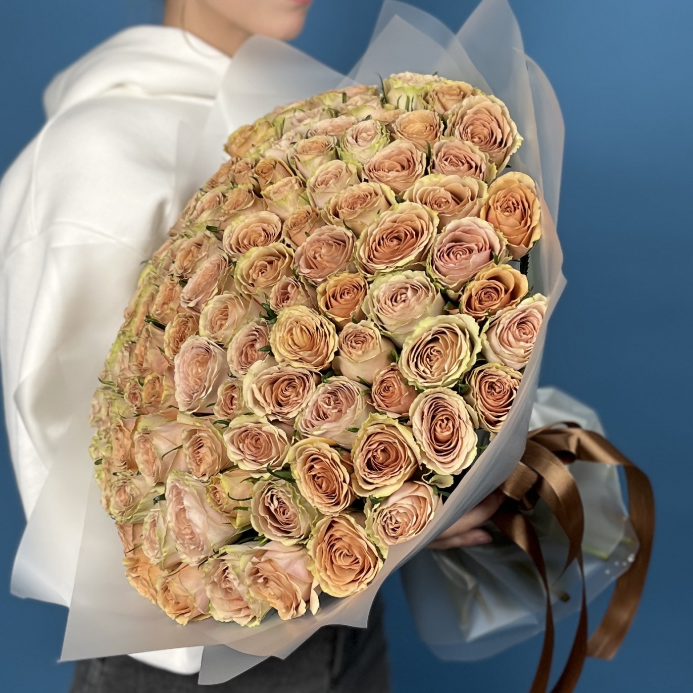 Огромный и эффектный букет из 101 розы сорта Тедди высотой 40 см. Нежные зелено-персиковые оттенки создают теплую и уютную атмосферу, делая этот букет поистине роскошным подарком или центральным украшением торжества. Символ нежности, заботы и изящества.