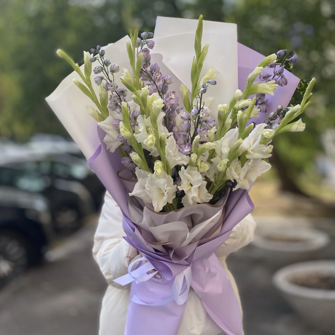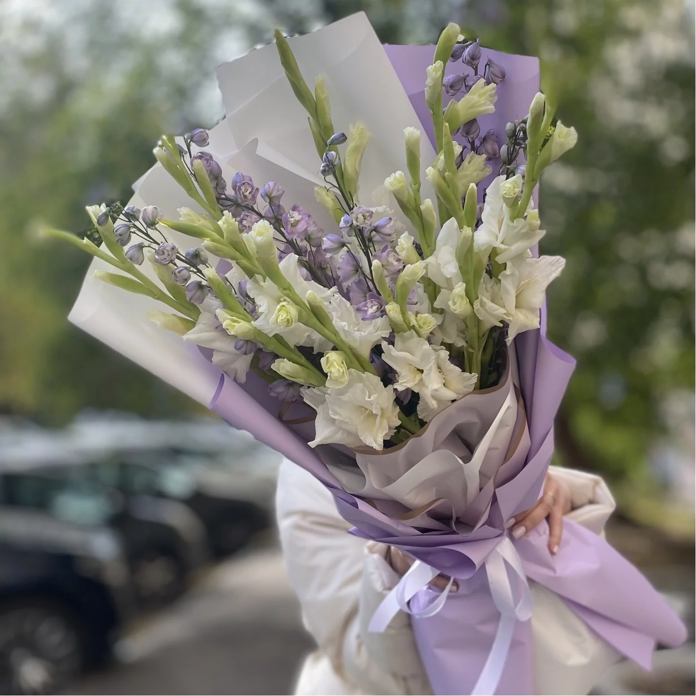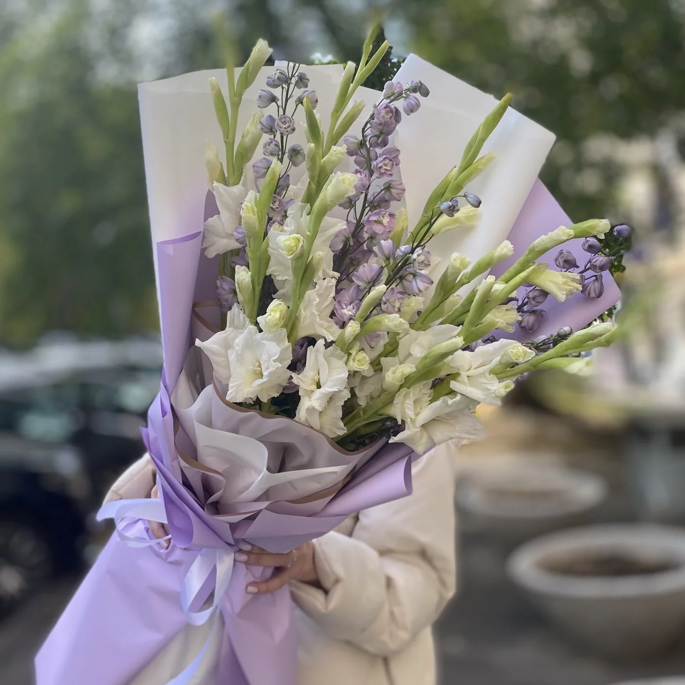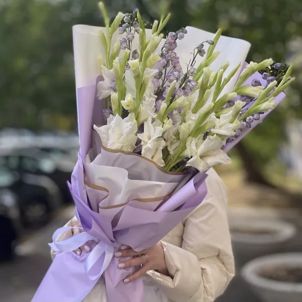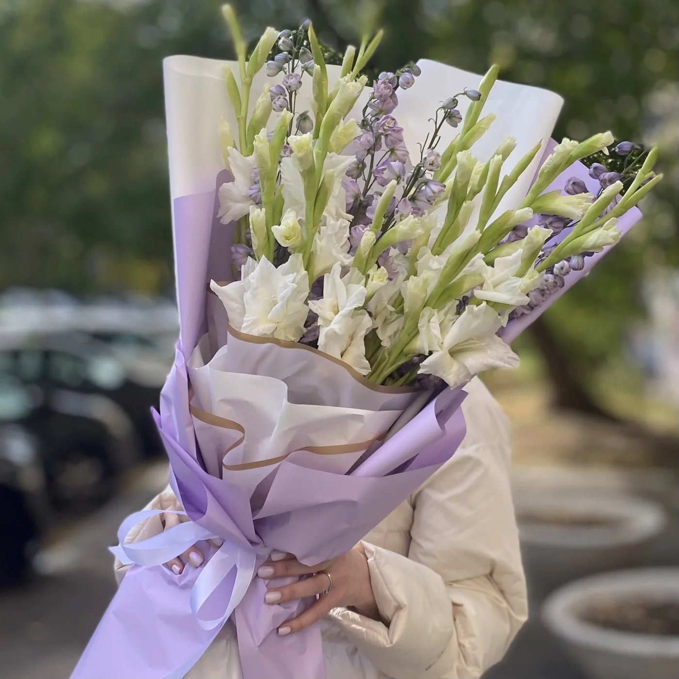 Букет из 11 белых гладиолусов в сочетании с лавандовым дельфиниумом в красивой корейской упаковке. Гладиолусы – самые роскошные осенние цветы, которые не оставят равнодушным никого и смогут порадовать Вашего получателя. Гладиолусы уместно преподнести в качестве подарка уважаемому коллеге, партнеру по бизнесу.