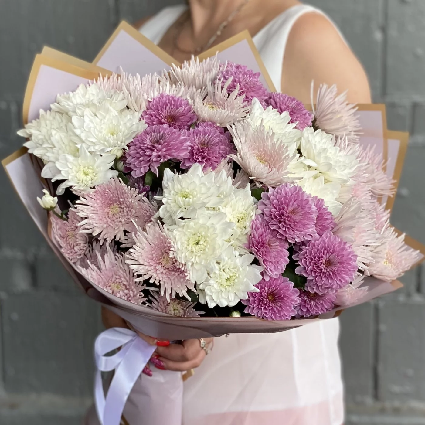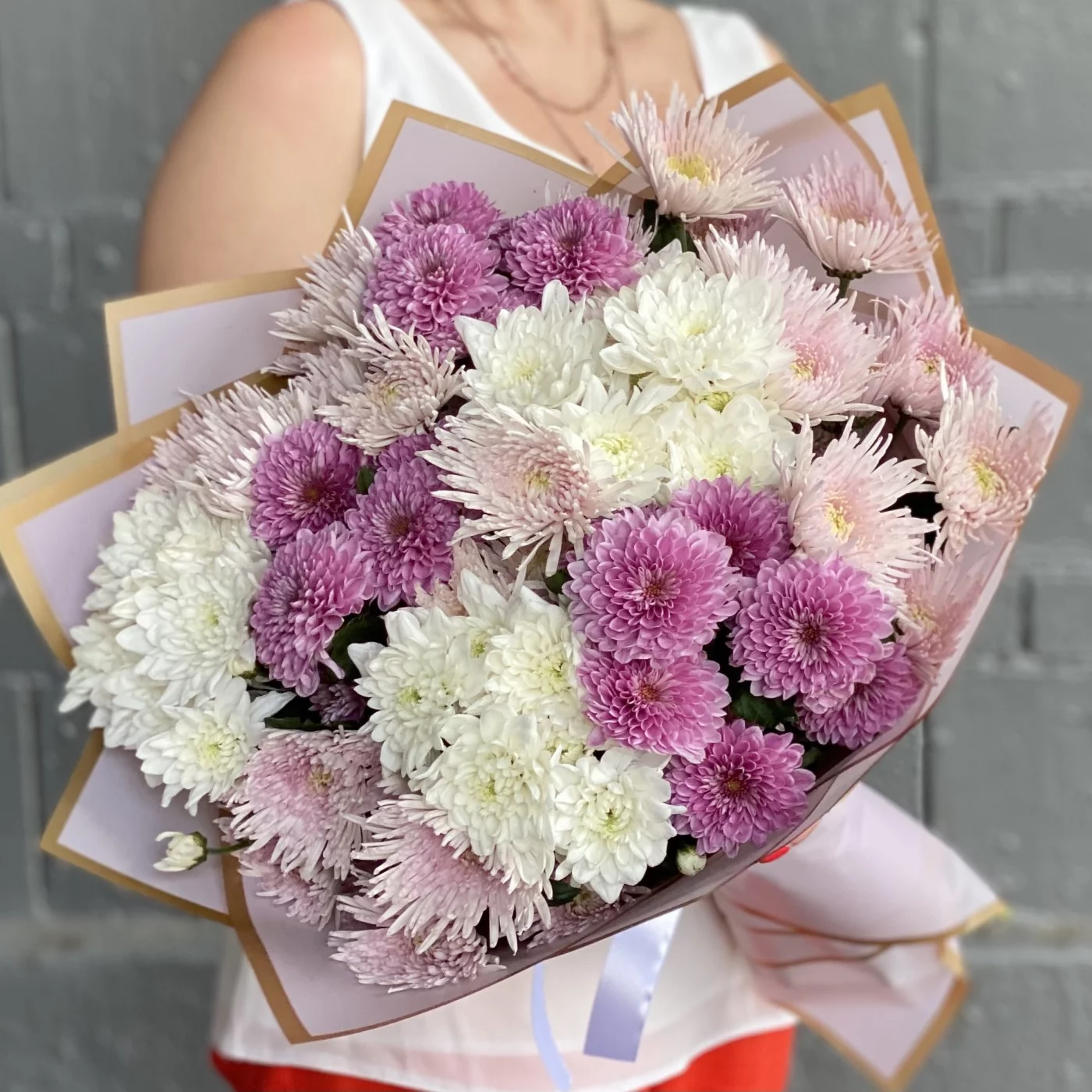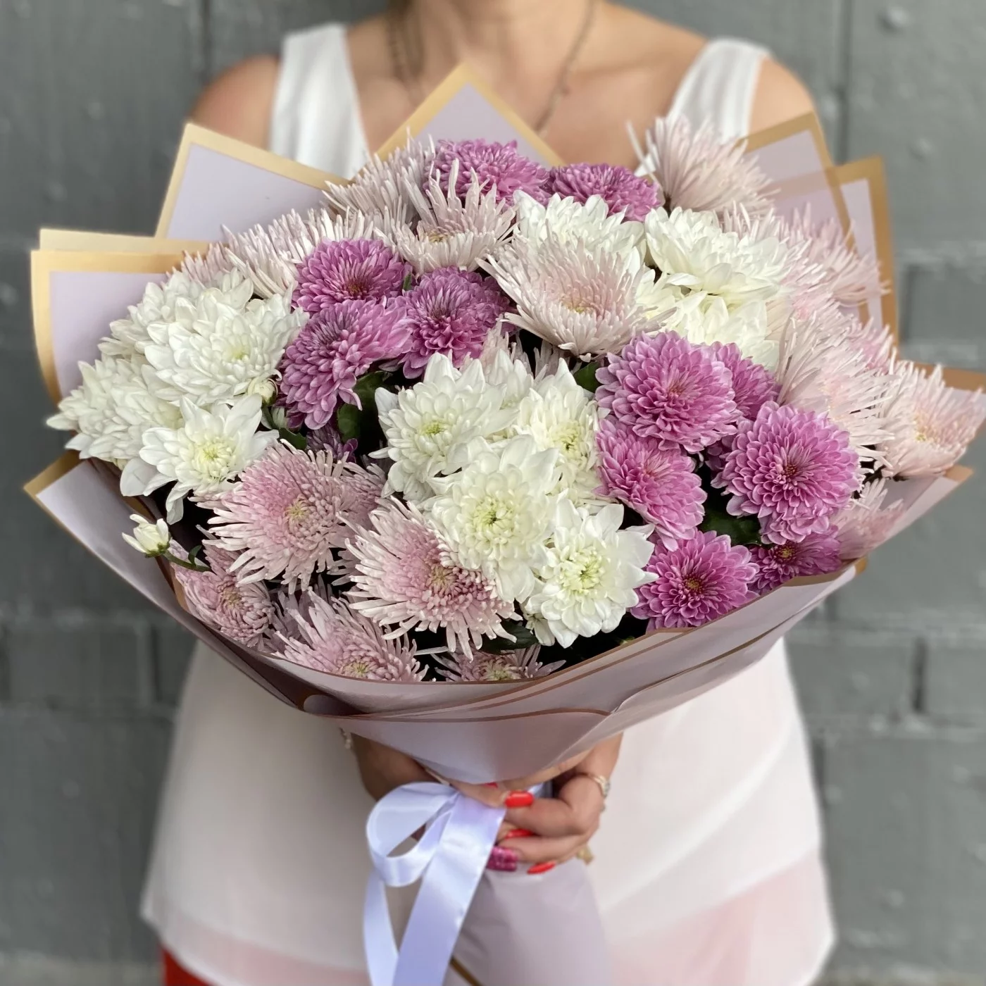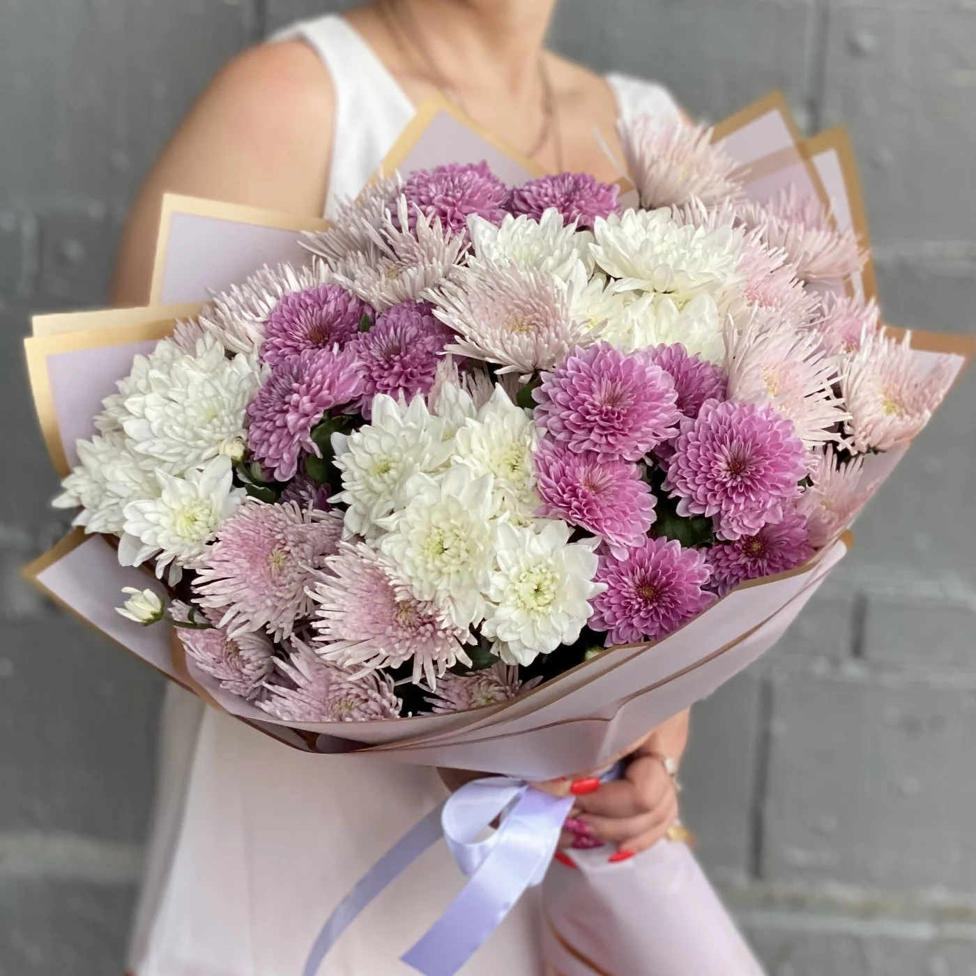 Микс из 11 сиреневых, розовых и белых кустовых хризантем. Букет дополнен стильной корейской упаковкой в тон букета.