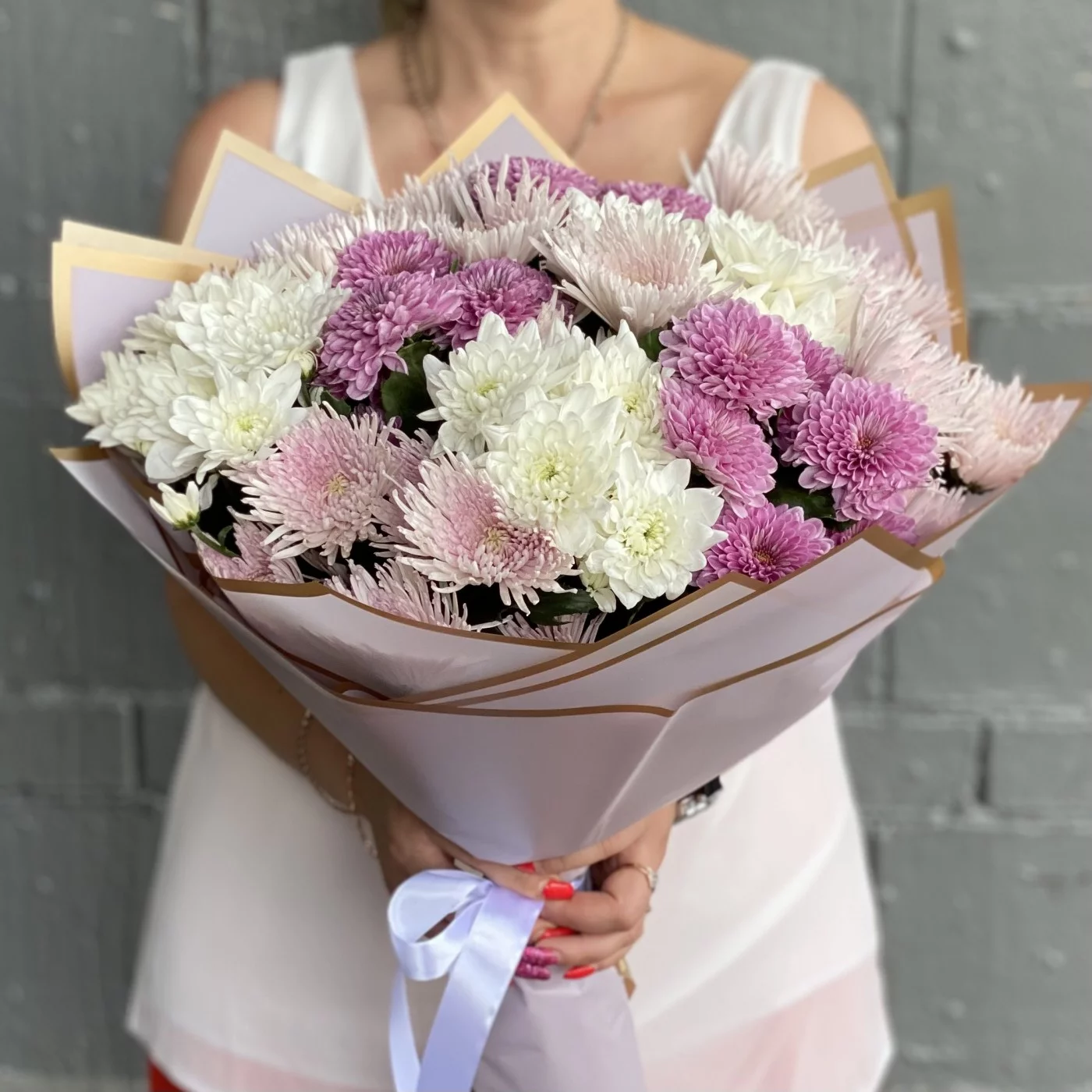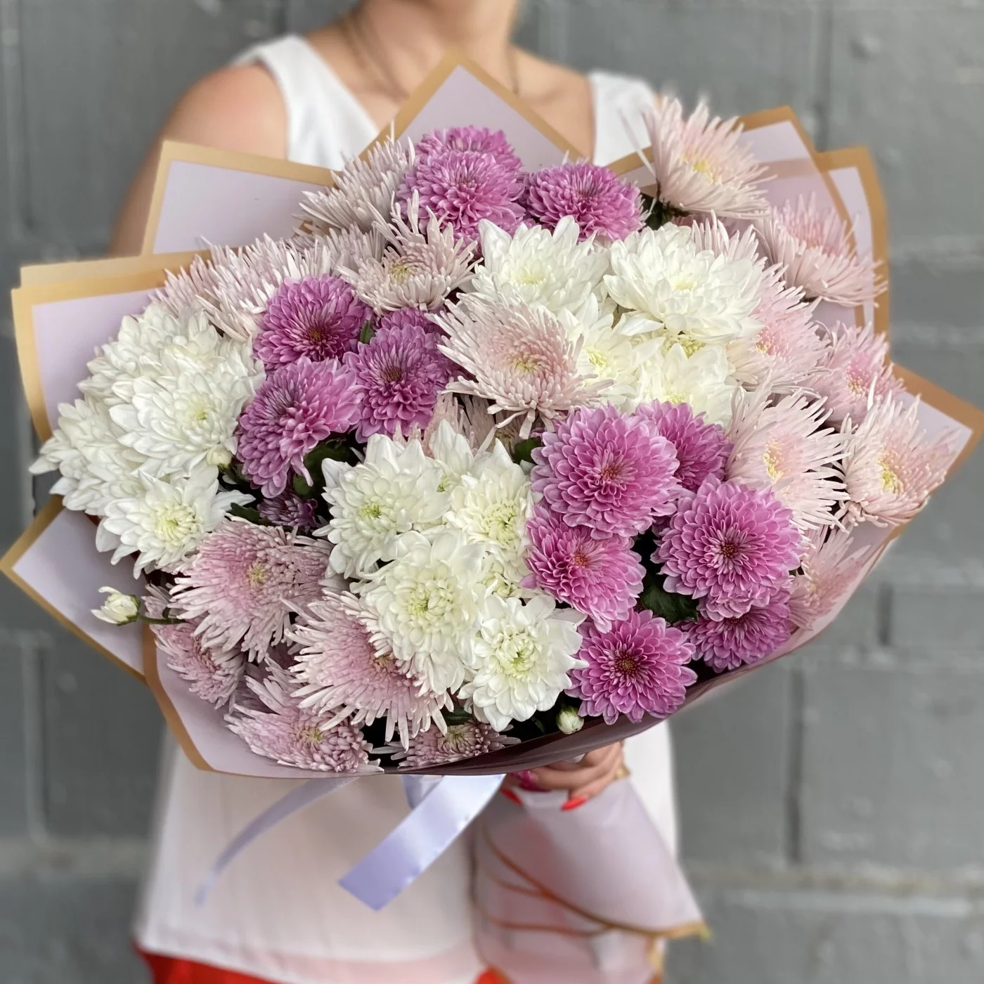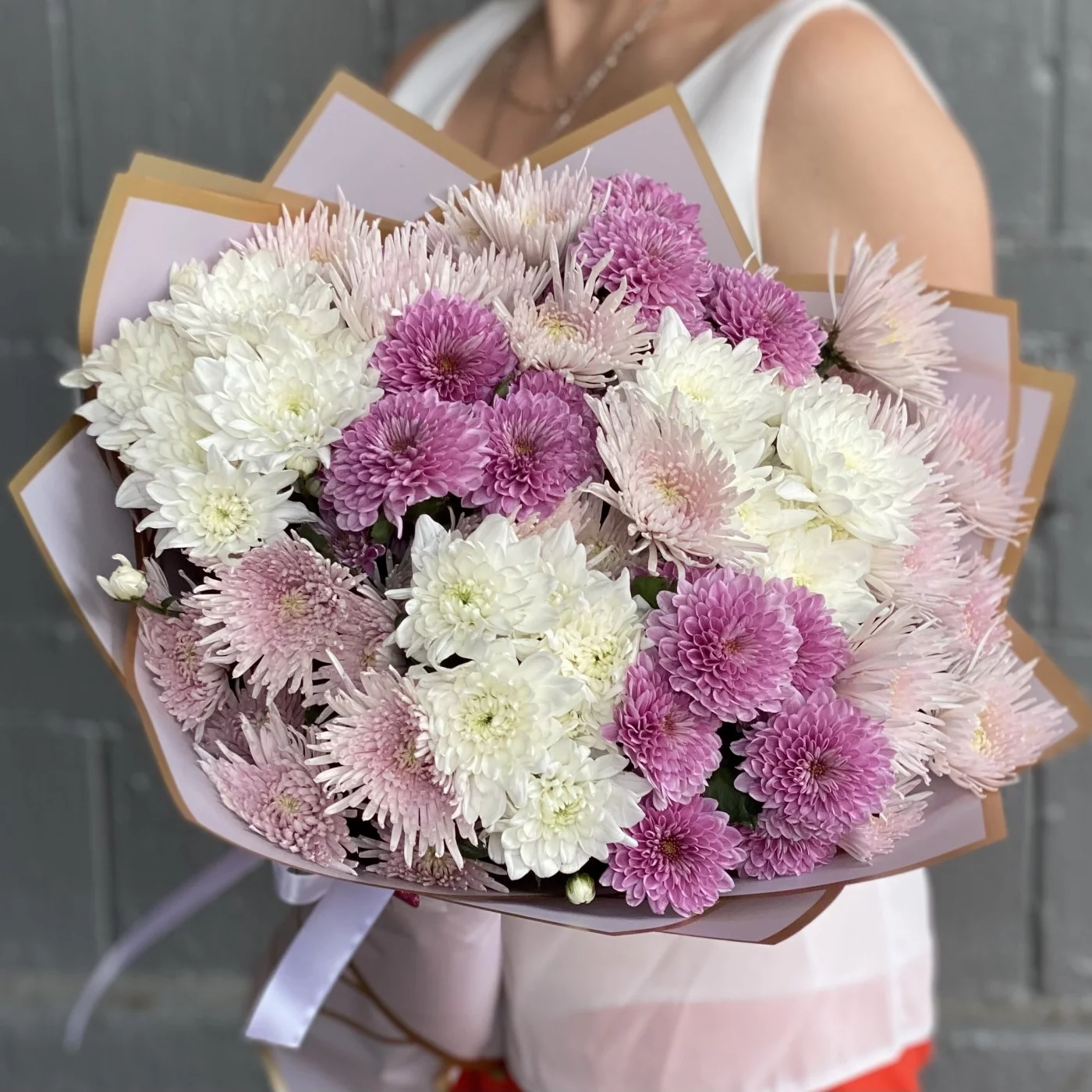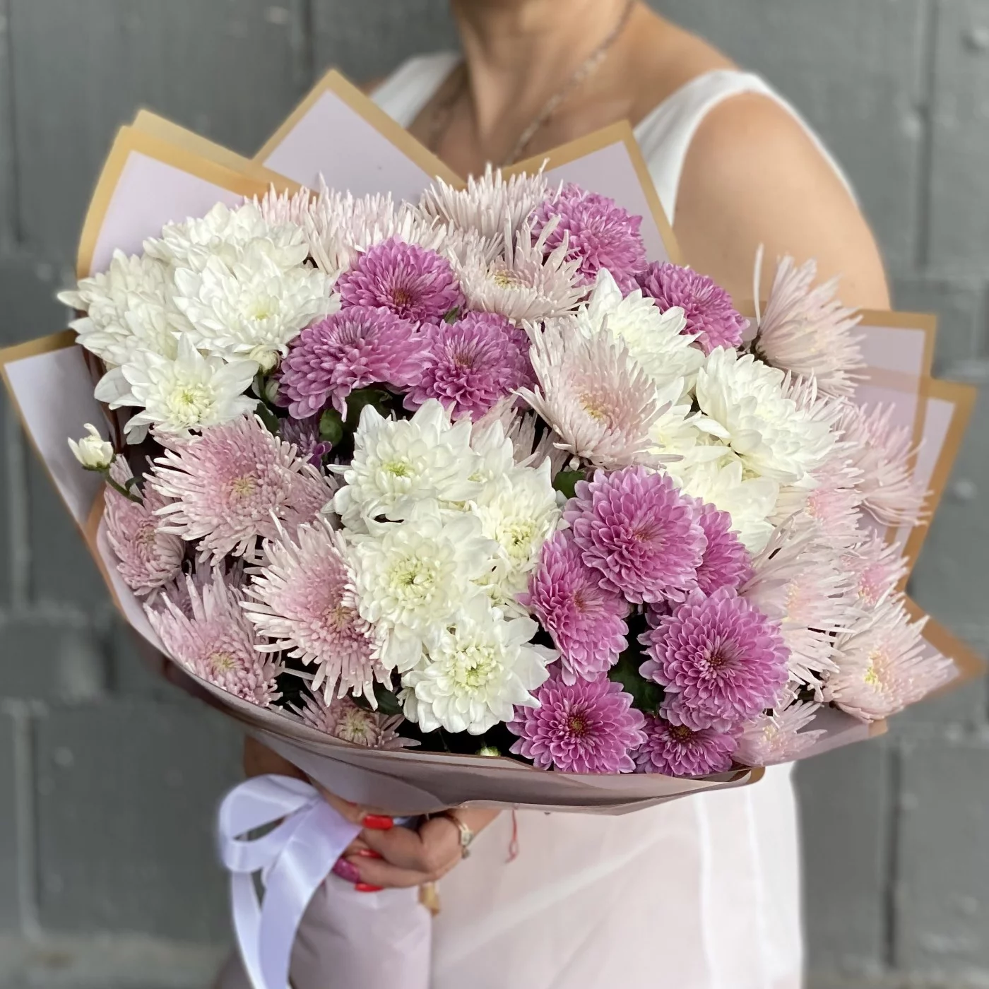 Микс из 11 сиреневых, розовых и белых кустовых хризантем. Букет дополнен стильной корейской упаковкой в тон букета.