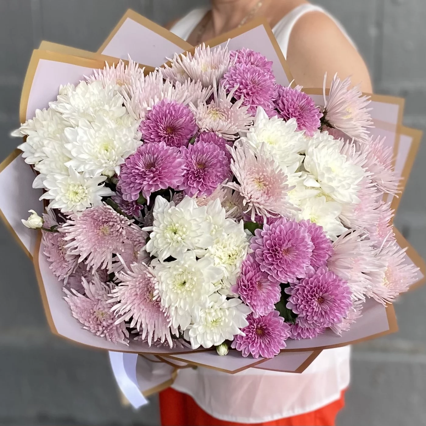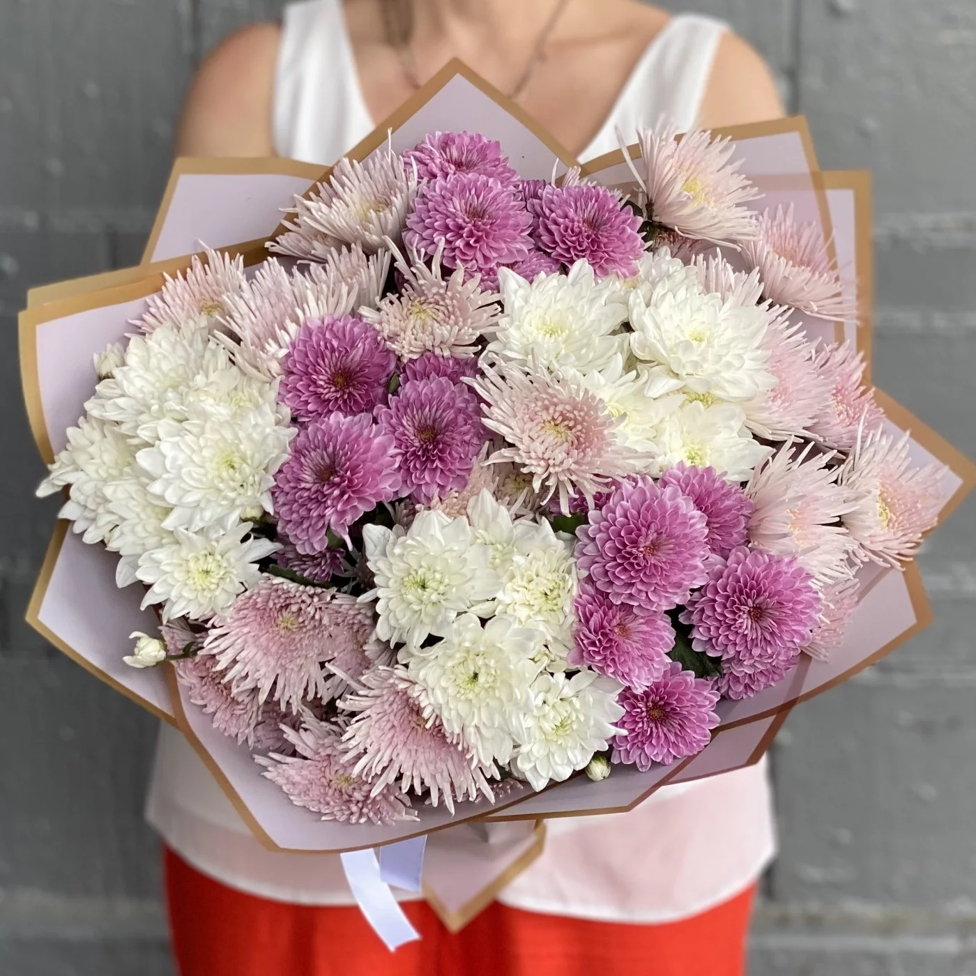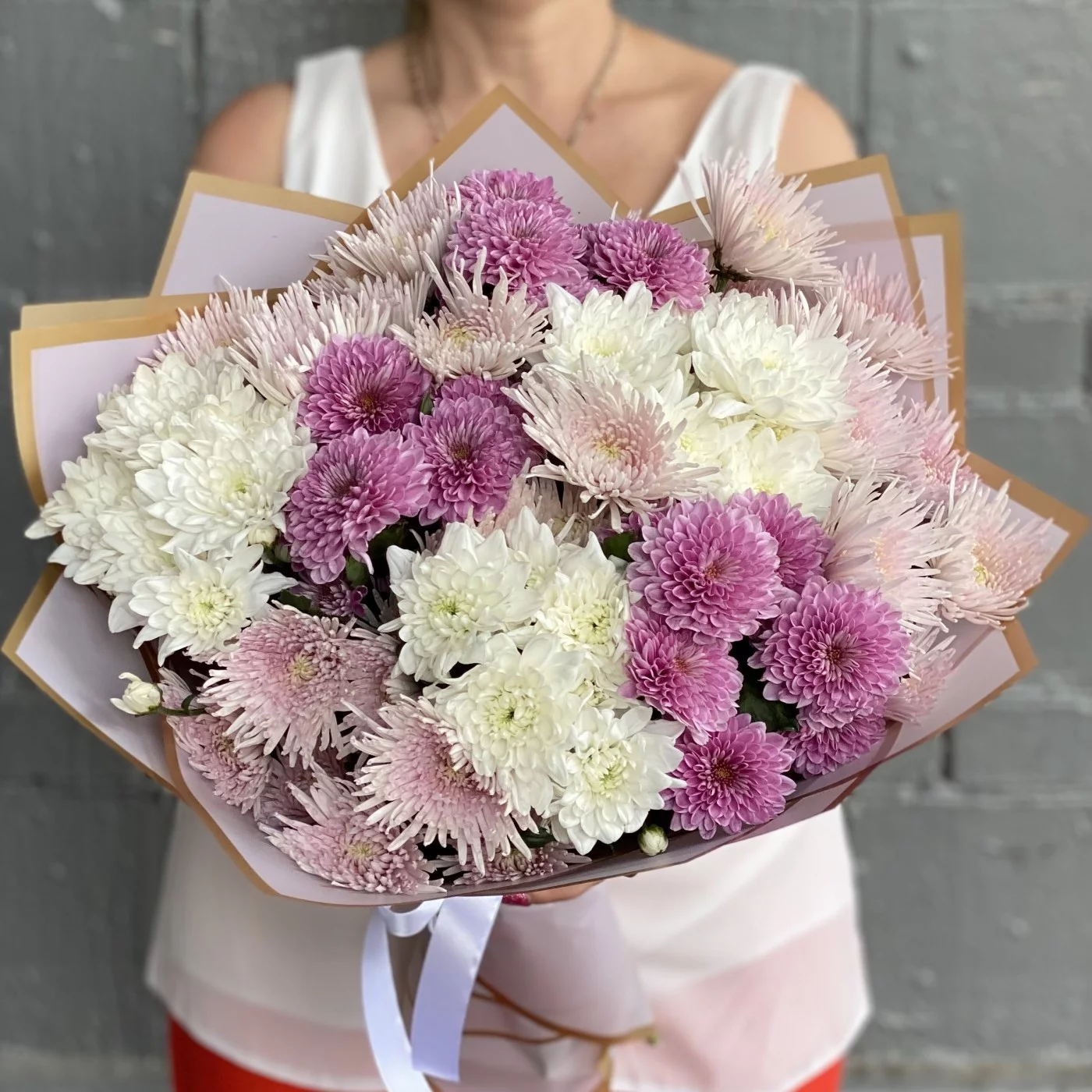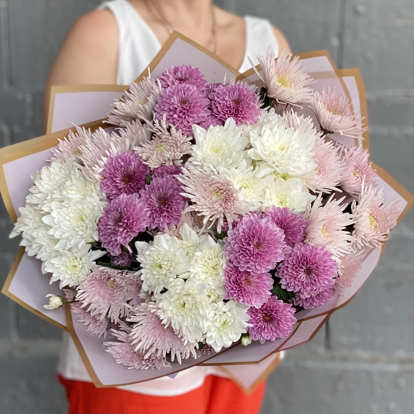 Микс из 11 сиреневых, розовых и белых кустовых хризантем. Букет дополнен стильной корейской упаковкой в тон букета.