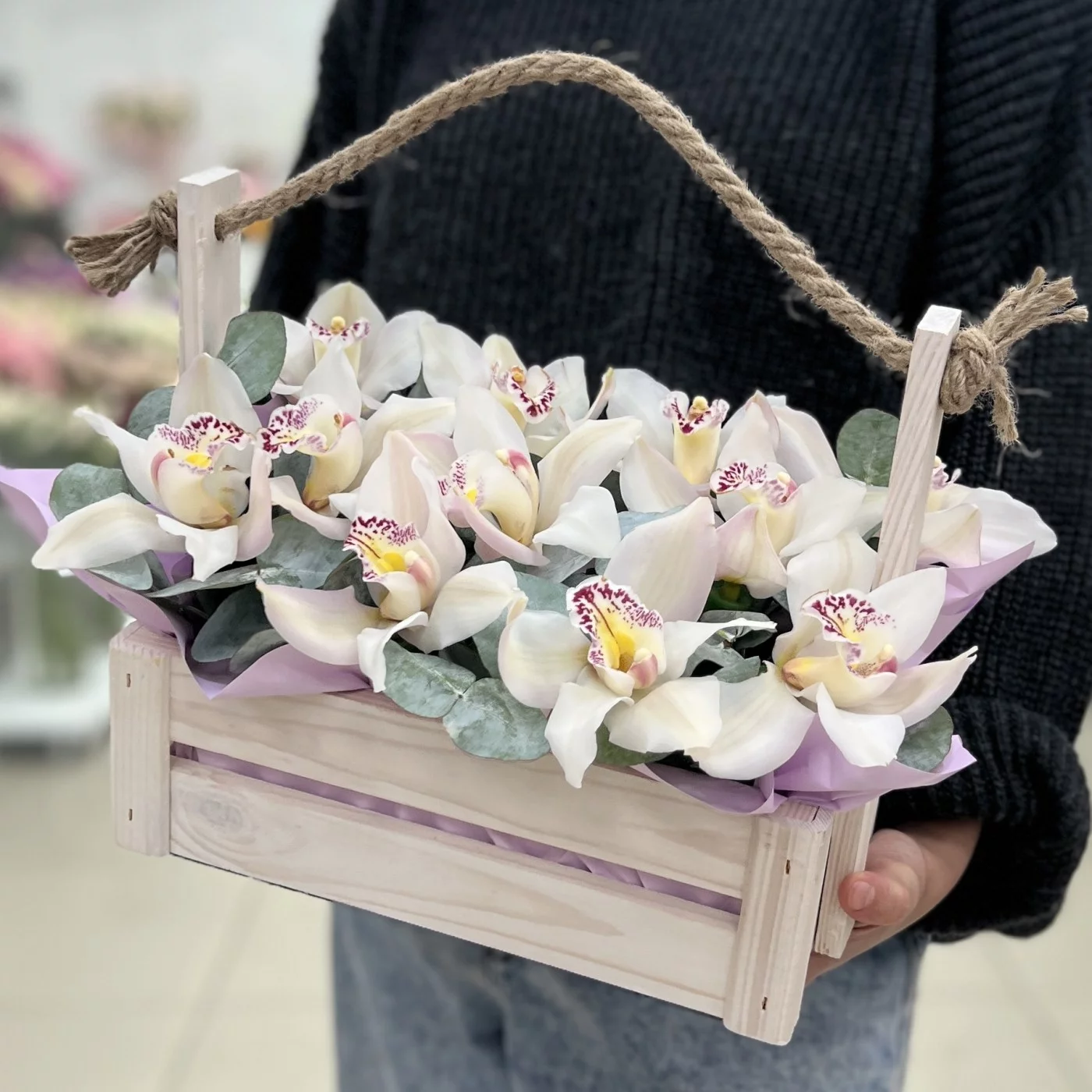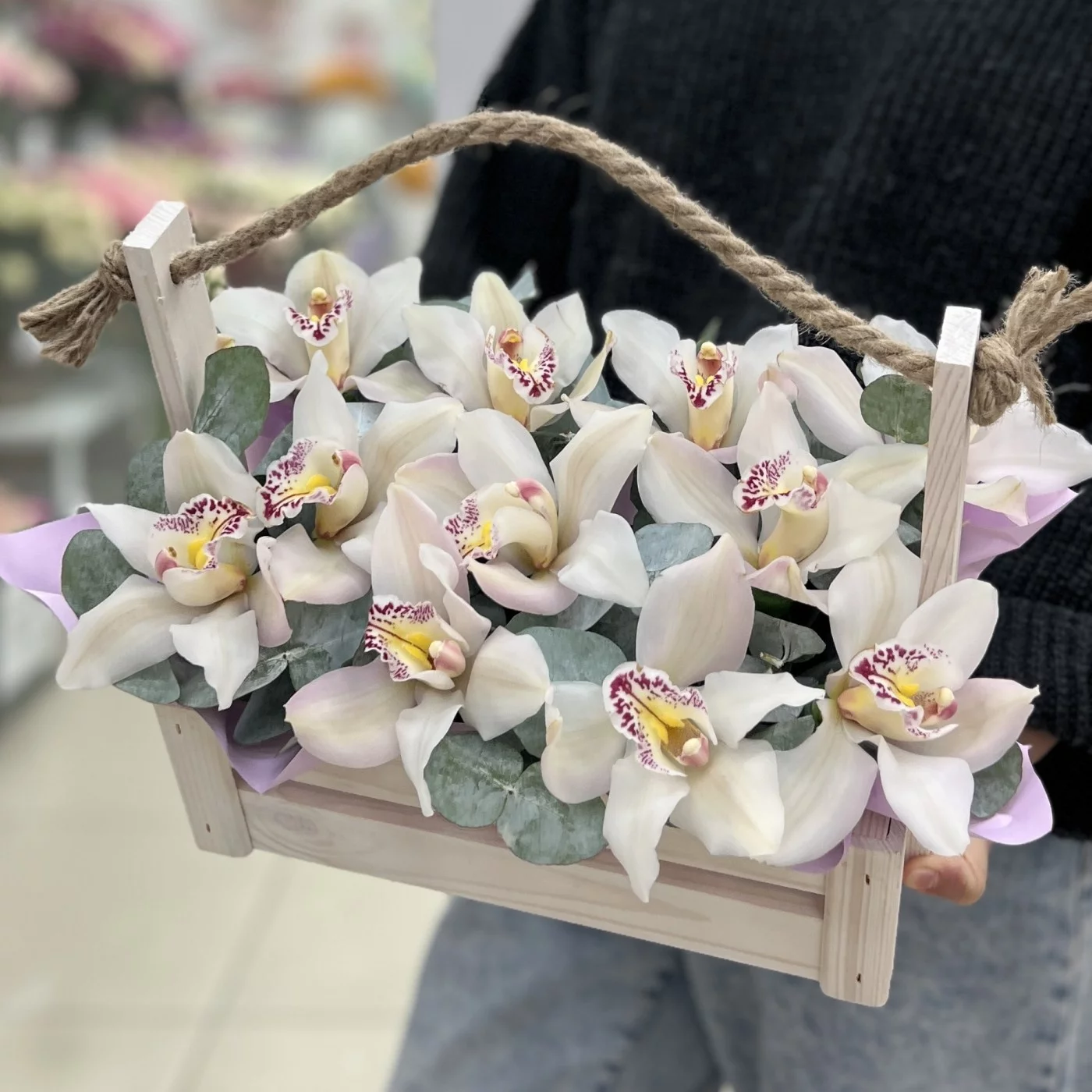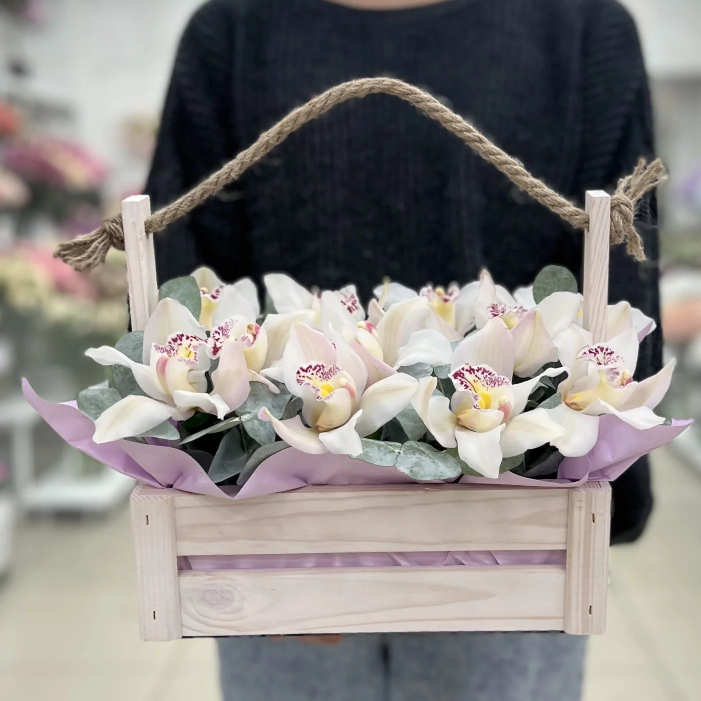 11 белых орхидей, оформленный в деревянном ящике, — это элегантное и стильное решение для подарка или декора.