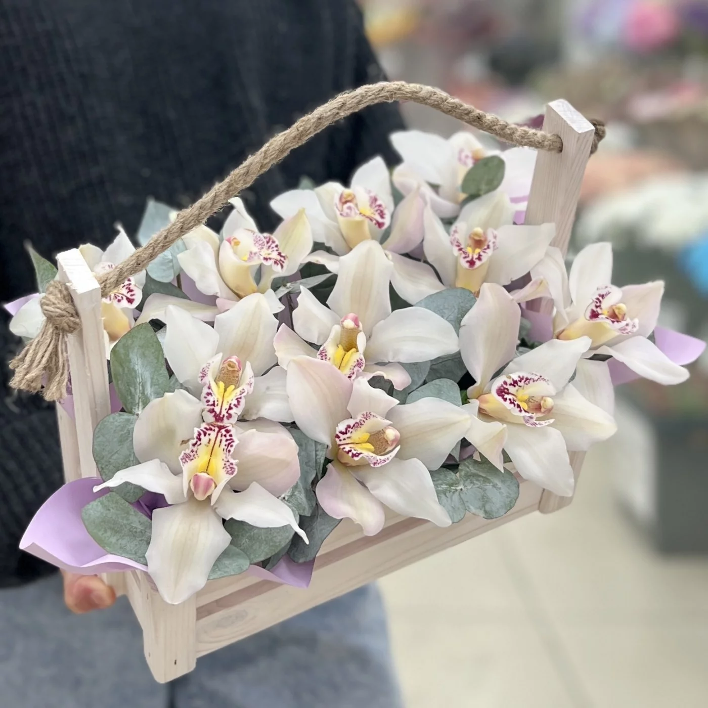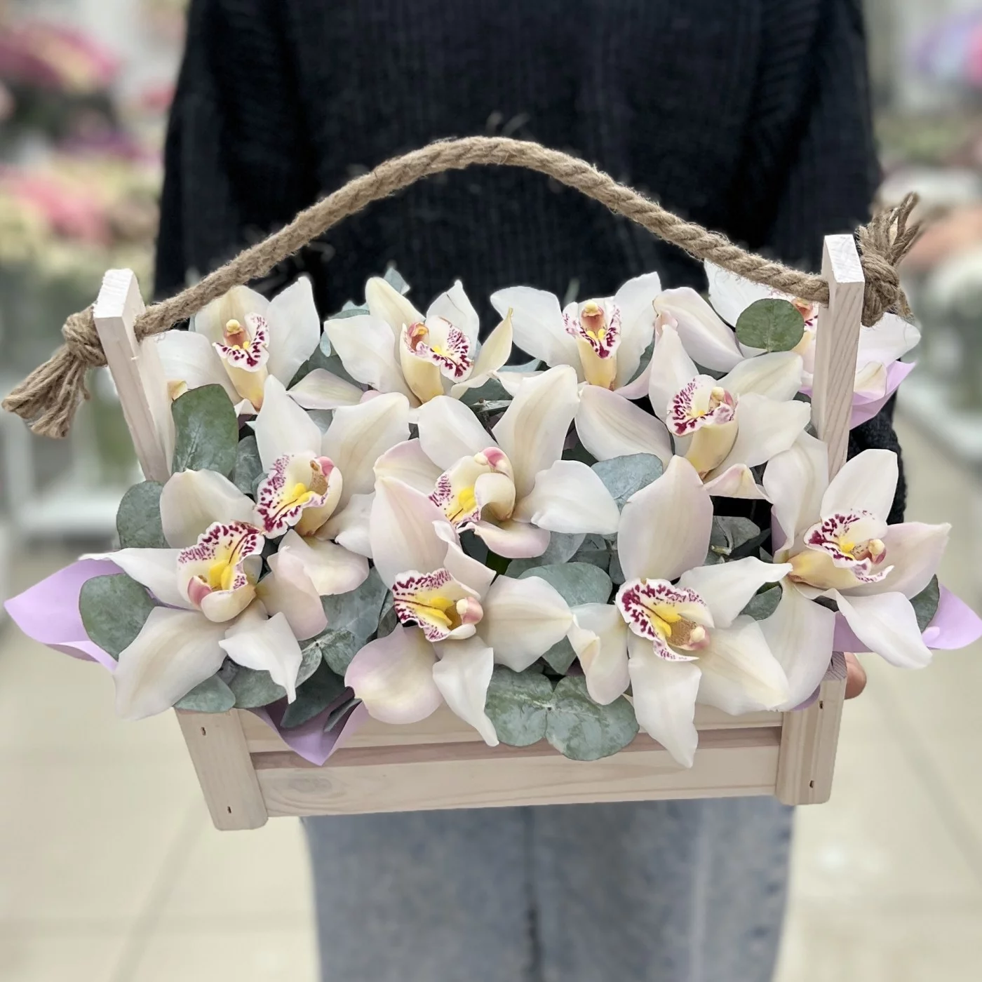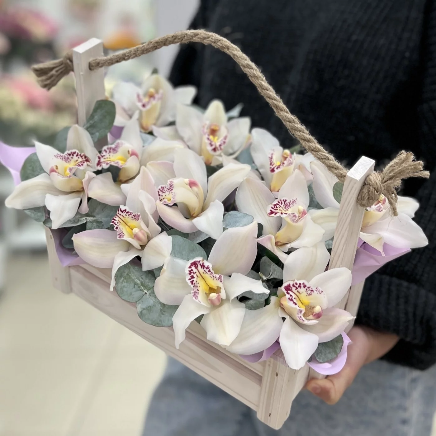 11 белых орхидей, оформленный в деревянном ящике, — это элегантное и стильное решение для подарка или декора.
