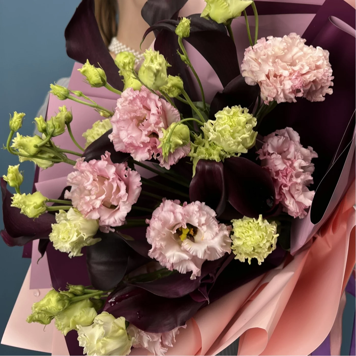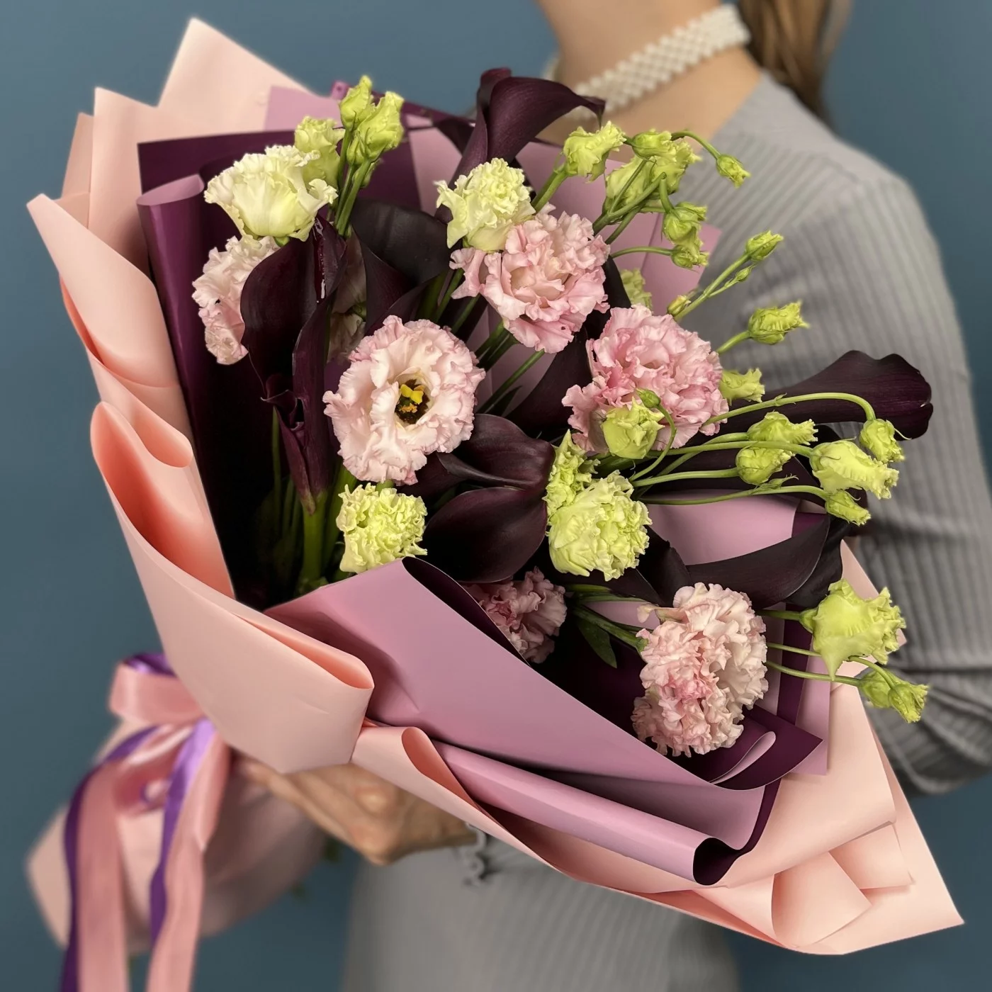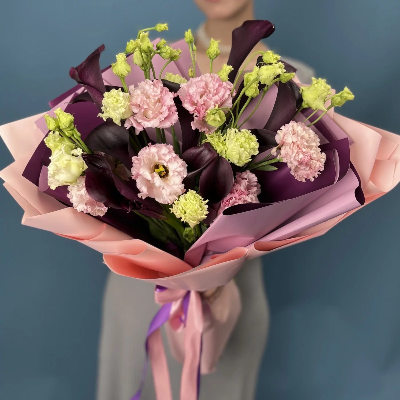 Глубокий фиолетовый цвет калл в гармонии с мягкими оттенками эустомы создает романтичную и стильную композицию, которая подчеркнет особое настроение и станет прекрасным подарком для близких и любимых.