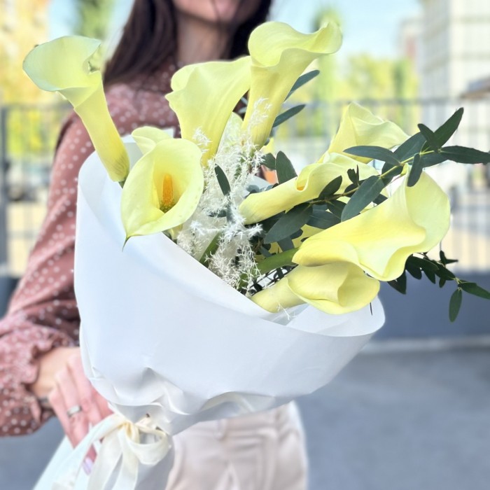 Букет из 11 нежных калл кремового оттенка с добавлением пушистого сухоцвета и ароматного эвкалипта смотрится очень изящно и лаконично.
