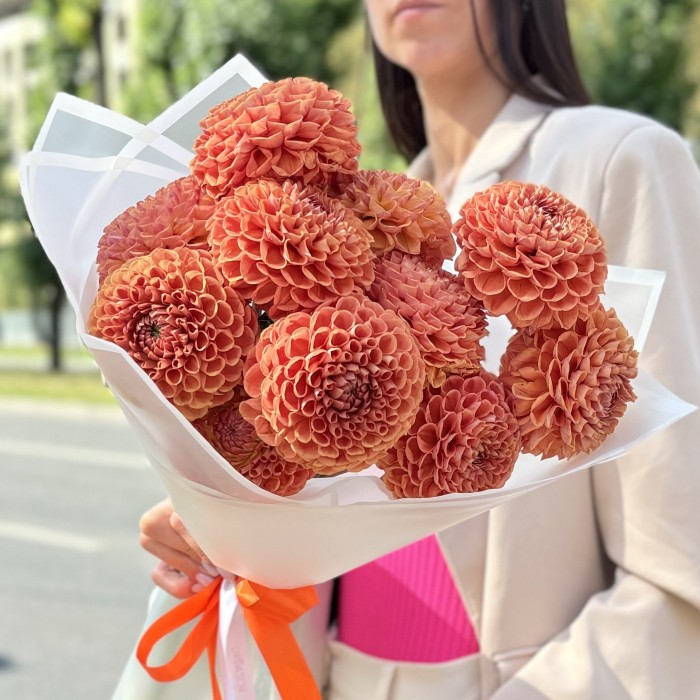 Георгины собраны в плотную, симметричную композицию, подчеркивая их изысканную форму и бархатистую текстуру лепестков. Этот букет станет прекрасным подарком для ценителей необычных, стильных цветочных решений, символизируя искренность, уют и душевное тепло.
