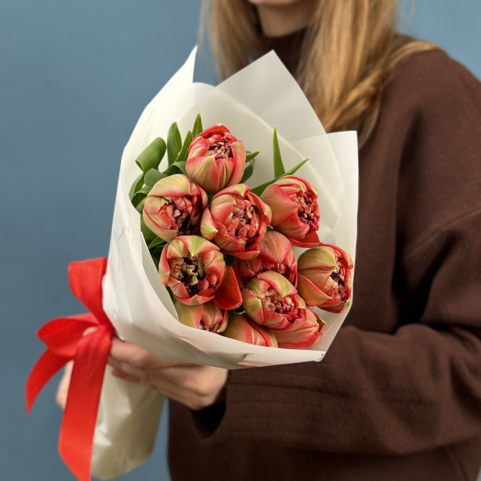 Букет из 11 красно-зеленых пионовидных тюльпанов — это яркое и стильное решение, которое привлечет внимание и создаст атмосферу праздника.
