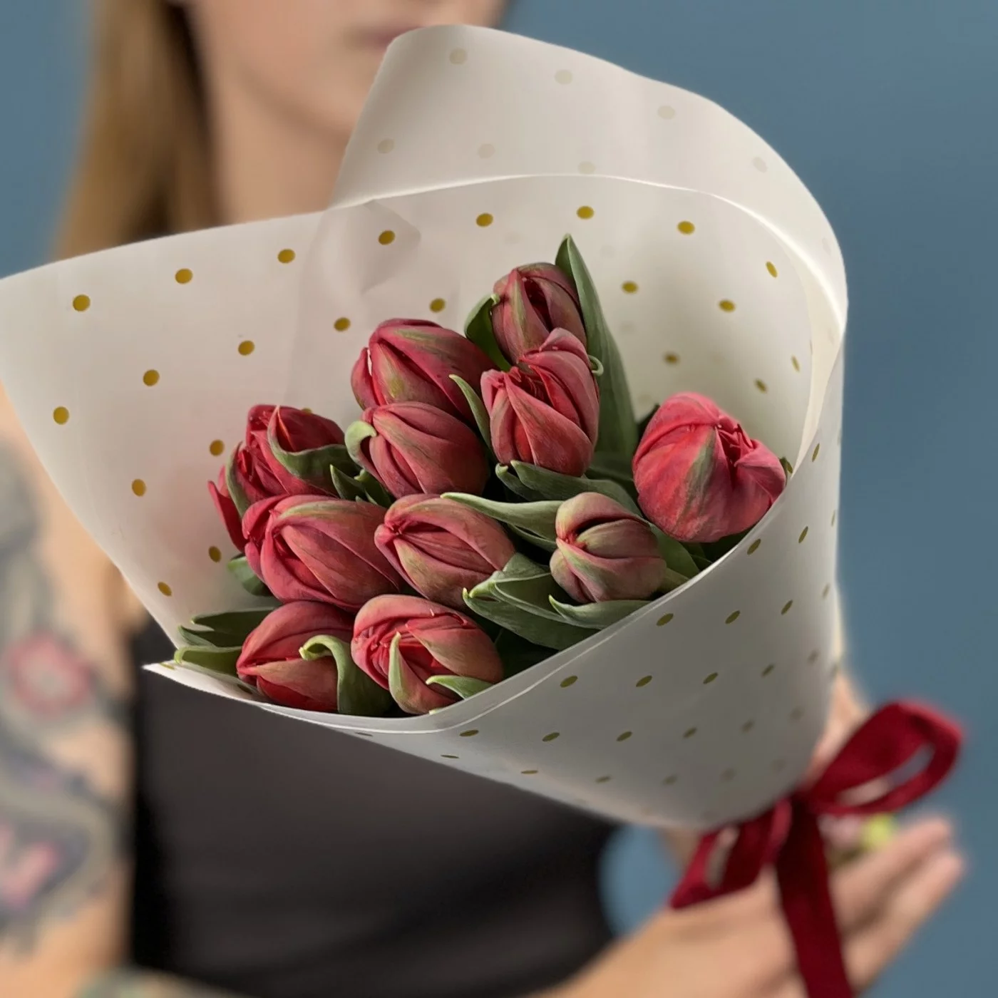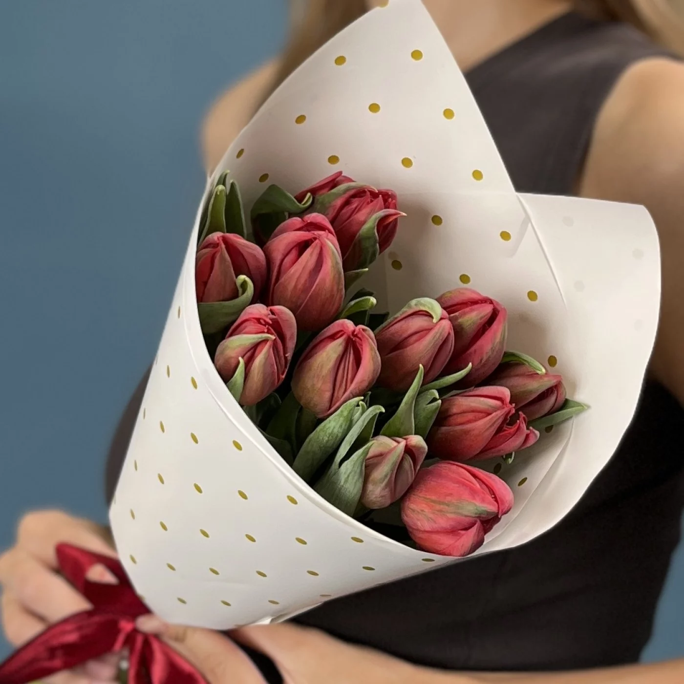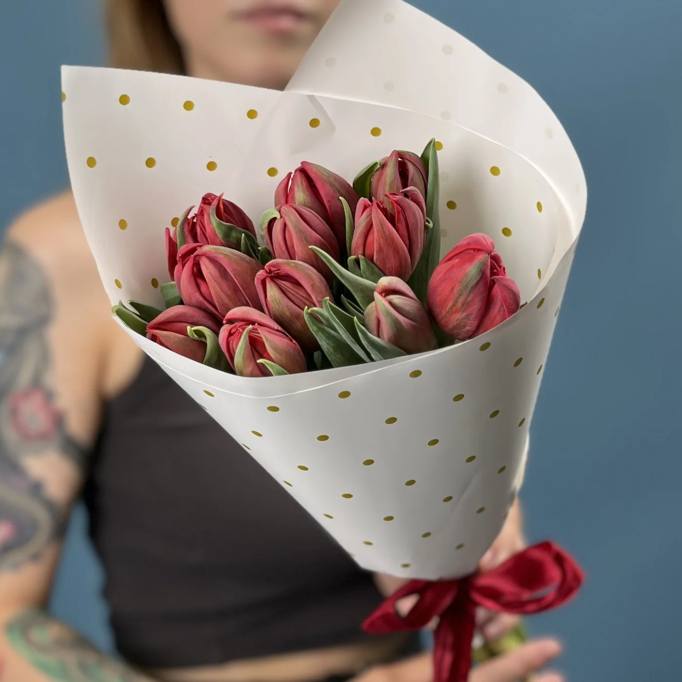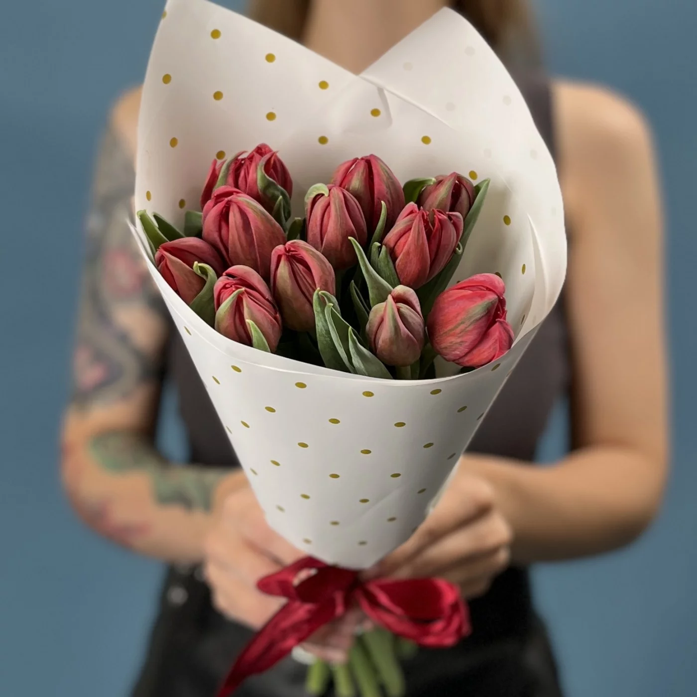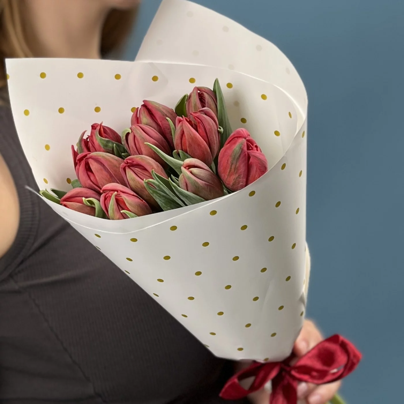 Элегантный букет из 11 красных пионовидных тюльпанов сорта "Ред Принц" — это воплощение страсти, красоты и изящества.