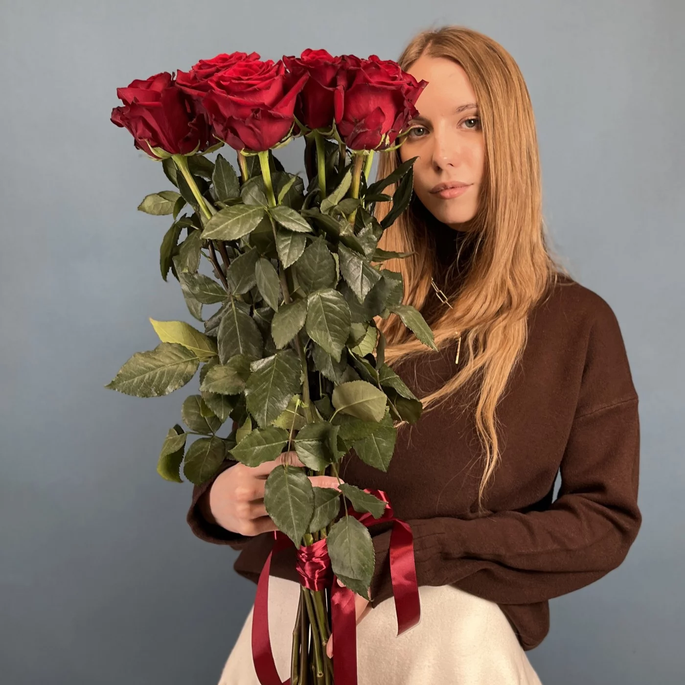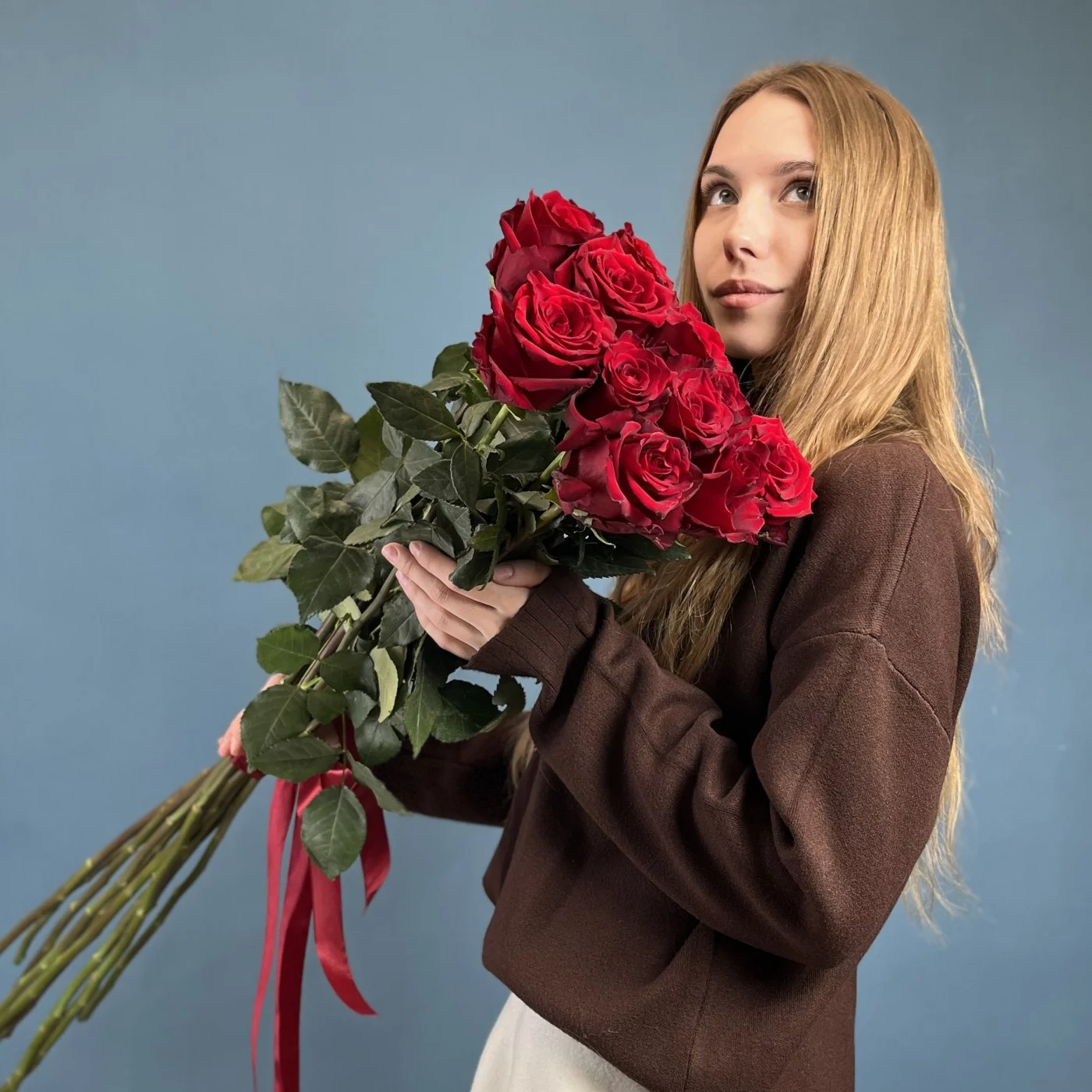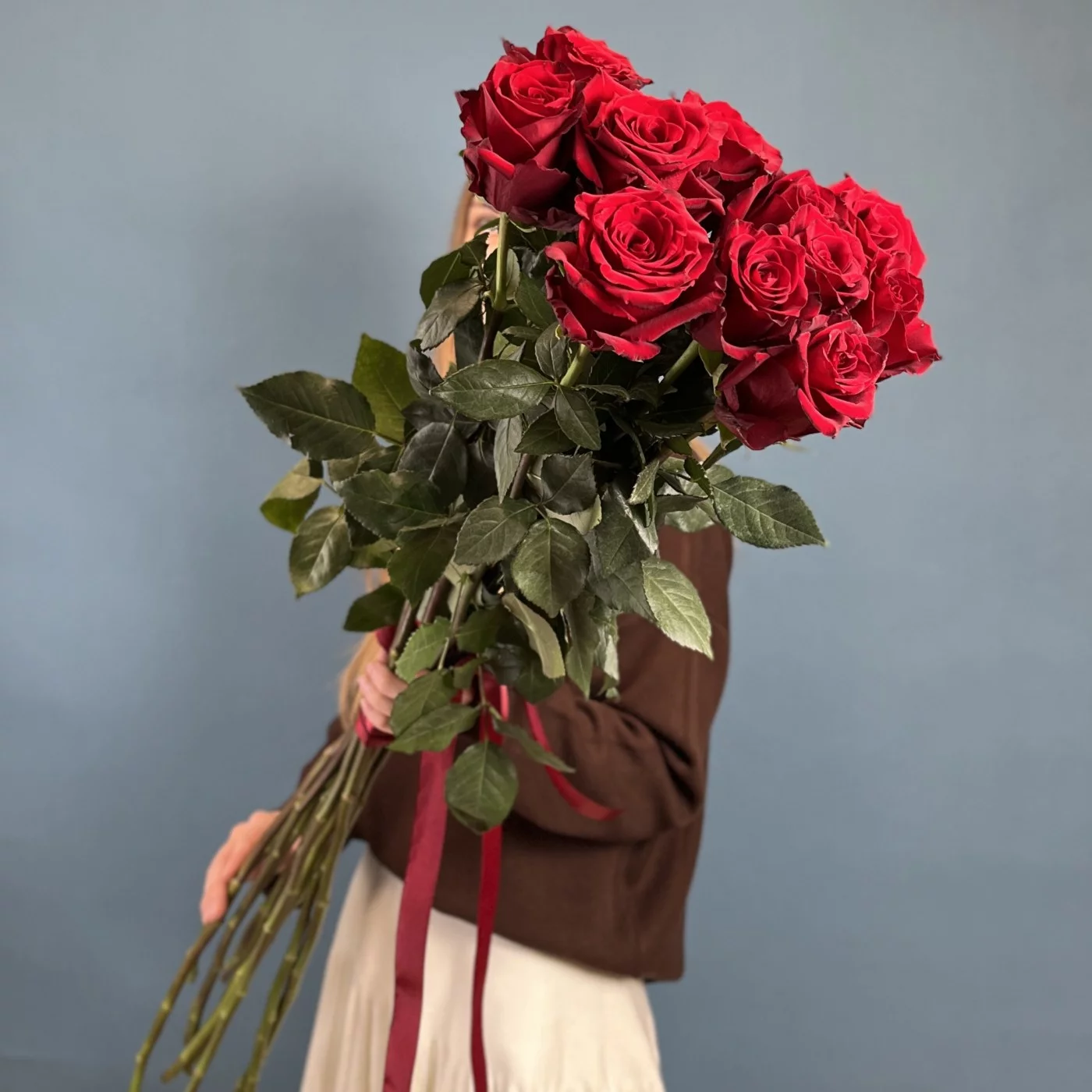 Такой букет станет прекрасным выбором для выражения глубоких чувств, будь то признание в любви, юбилей, свадьба или другое торжественное событие. Красные розы традиционно ассоциируются с романтикой и преданностью, а их элегантная длина придает композиции особый шик и аристократичность.