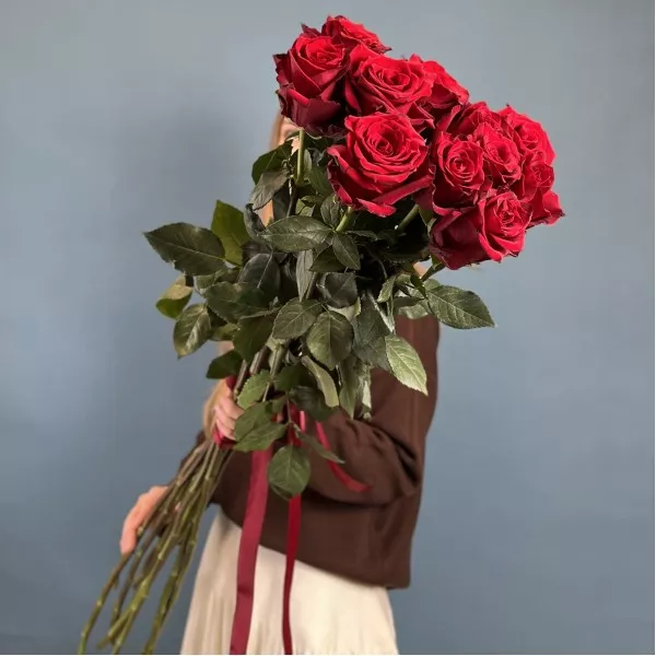 Букет из 11 красных роз высотой 120 см — это роскошный и впечатляющий подарок, который идеально подойдет для особых моментов. Его эффектный вид подчеркнут длинными изящными стеблями и насыщенным алым оттенком лепестков, олицетворяющим страсть, любовь и искренние эмоции.