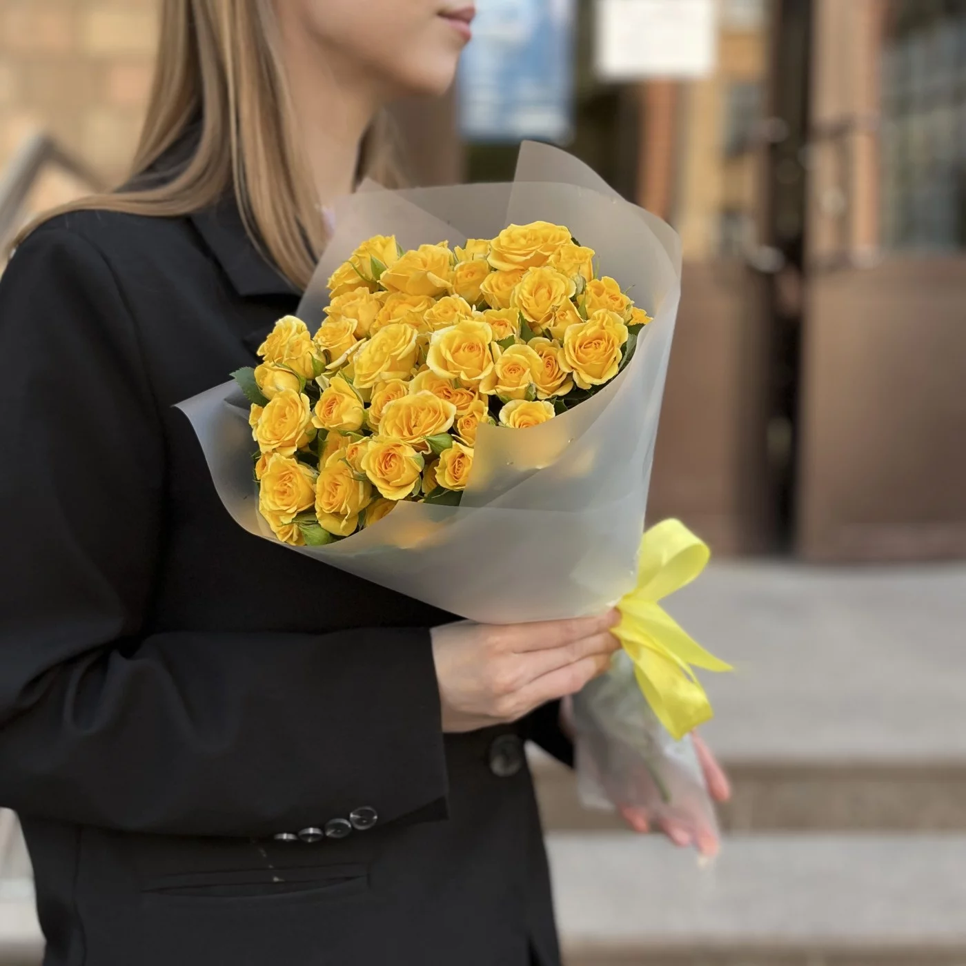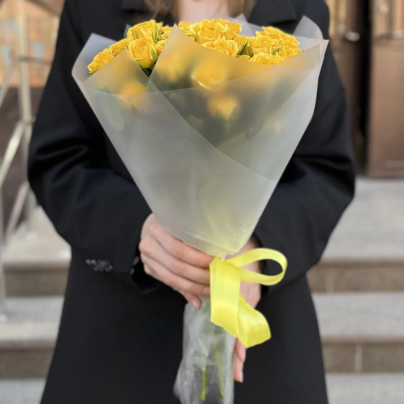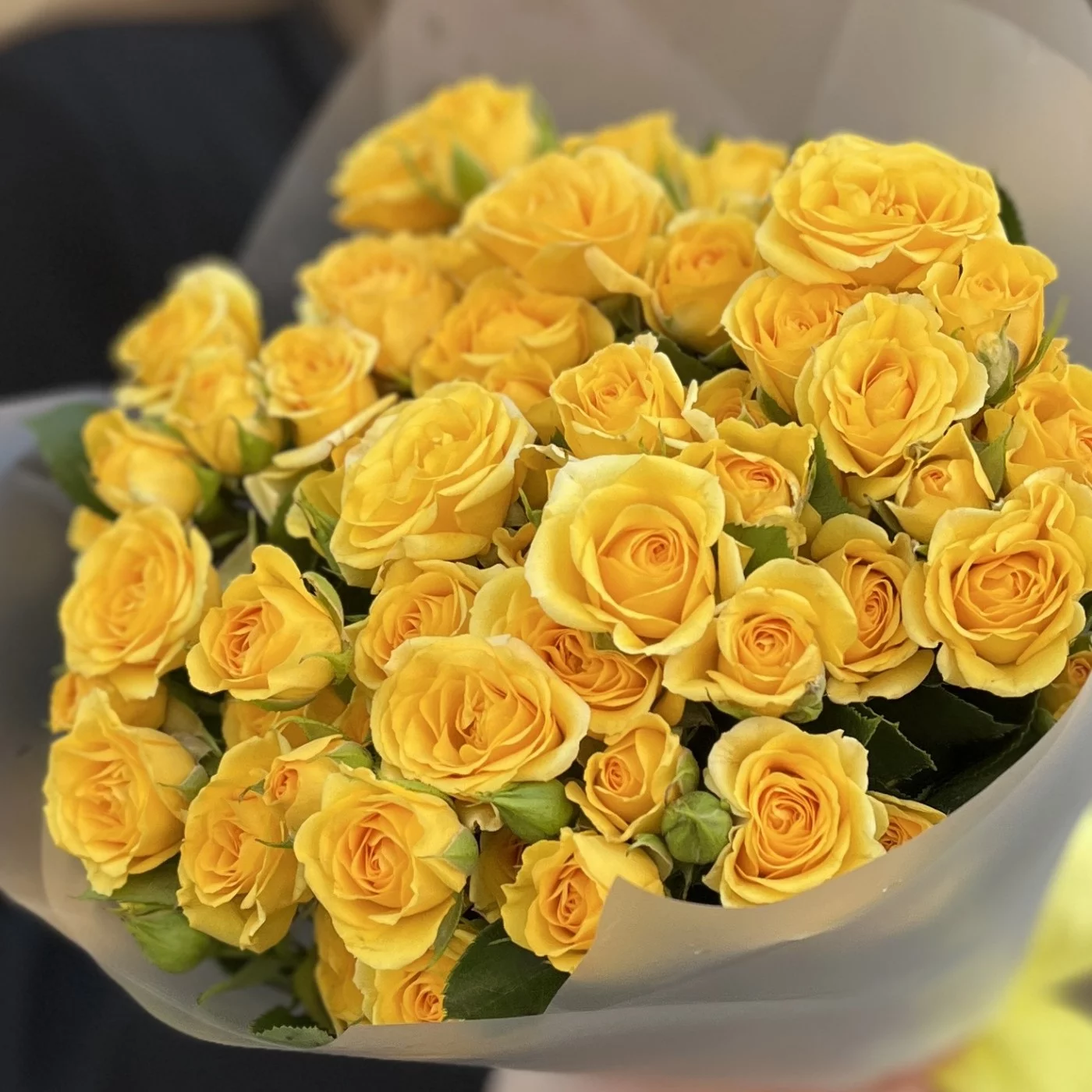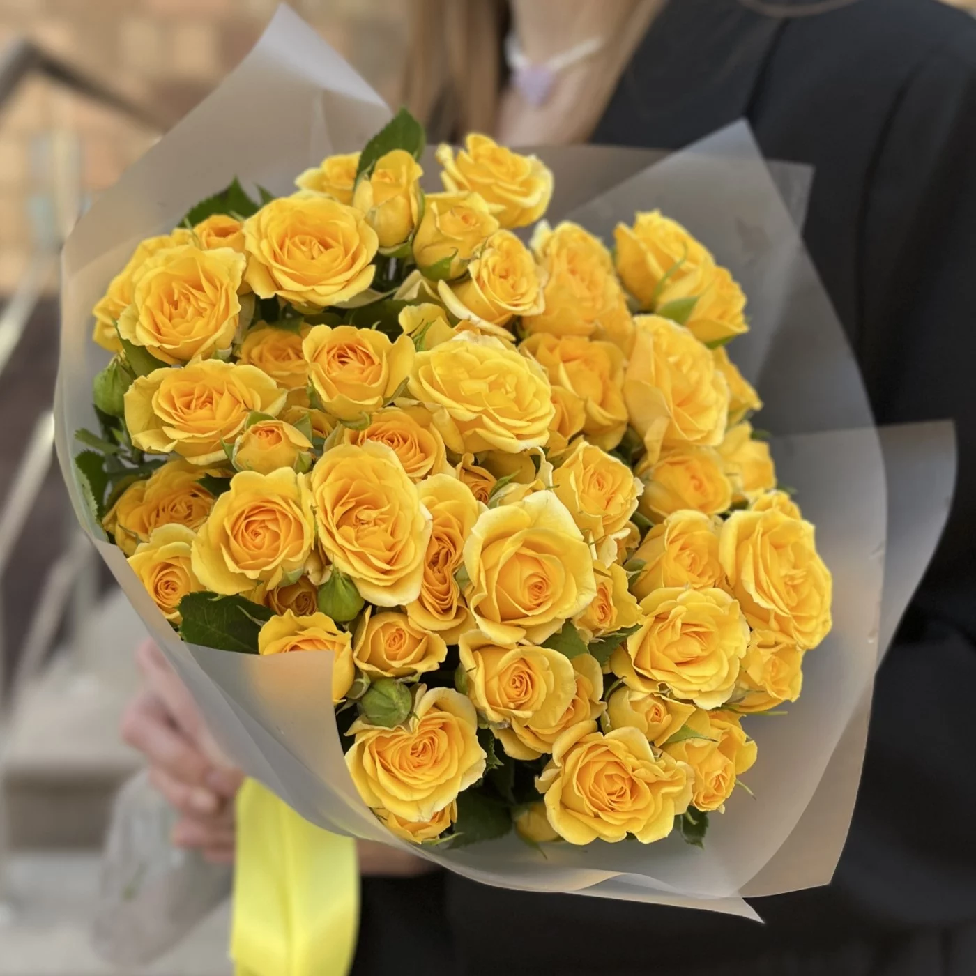 11 кустовых роз Еллоу бейби 40 см, привлекают внимание своим ярким и солнечным желтым цветом. Каждая роза обладает пышными, многослойными бутонами, которые раскрываются в нежные цветы, излучающие тепло и радость. Длина стеблей составляет 40 см, что делает этот букет идеальным для подарка или украшения интерьера.