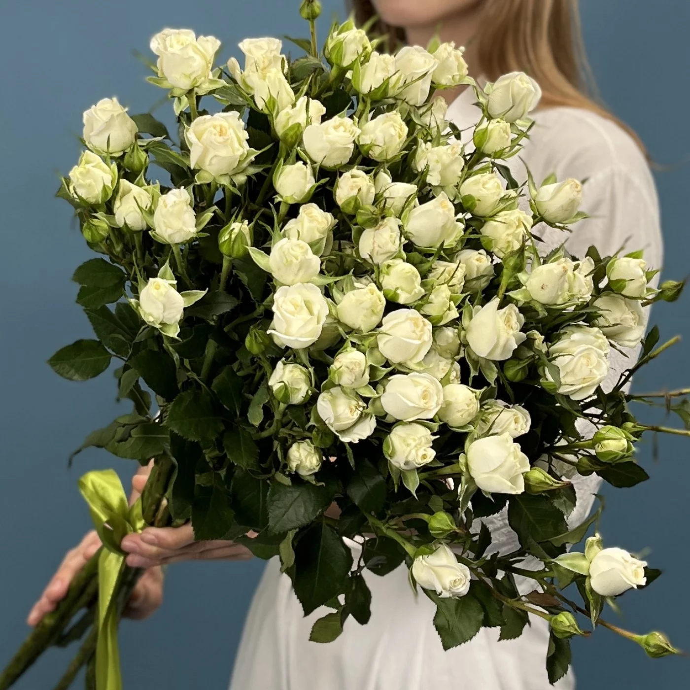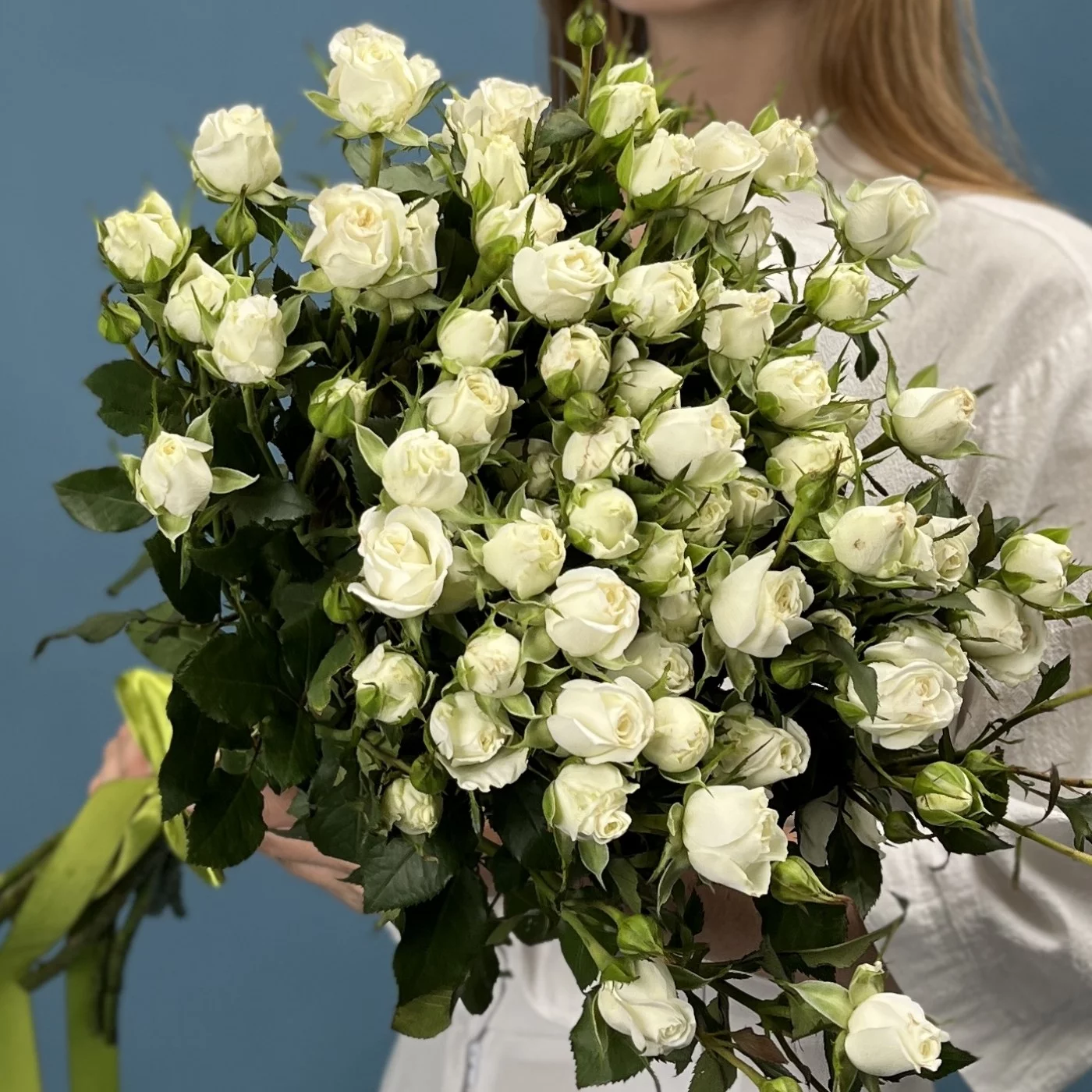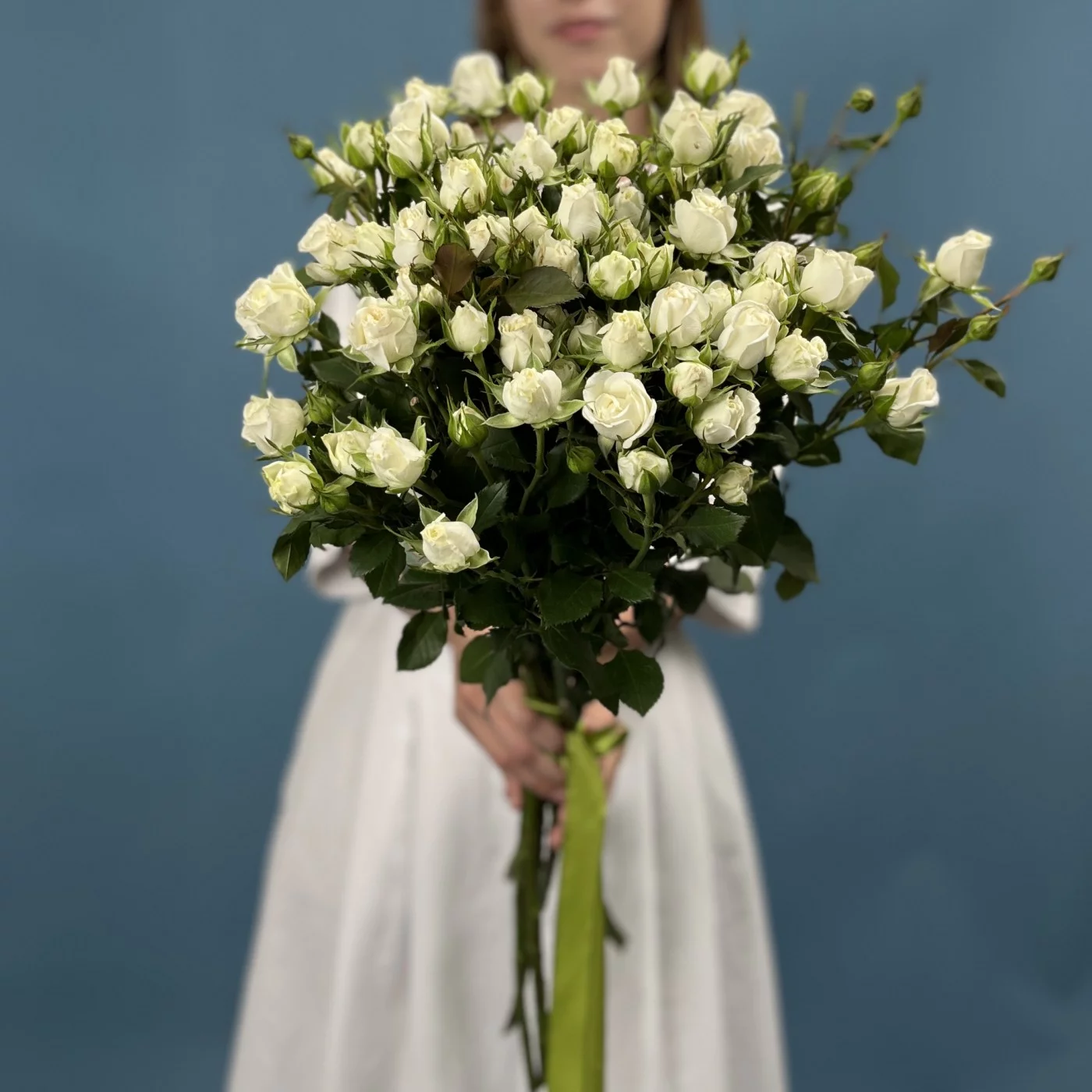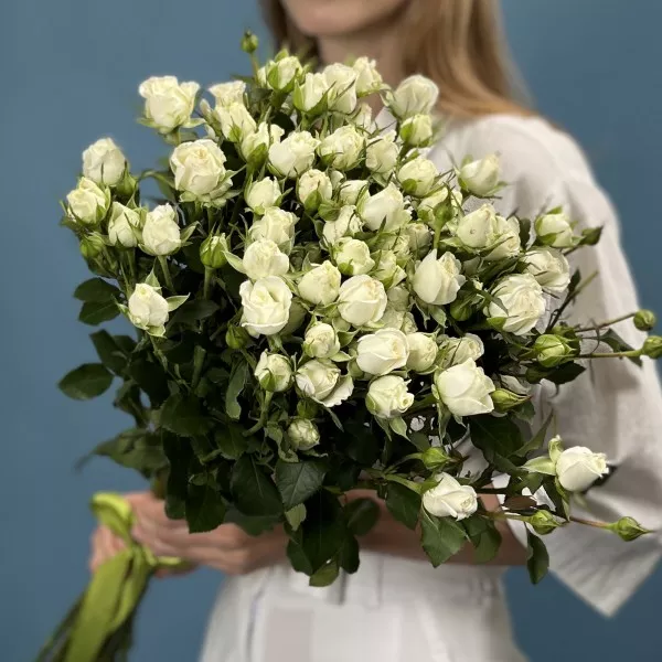 Очаровательный букет из 11 кустовых роз сорта Сноу Бабл высотой 60 см — это изысканное сочетание нежности и элегантности.