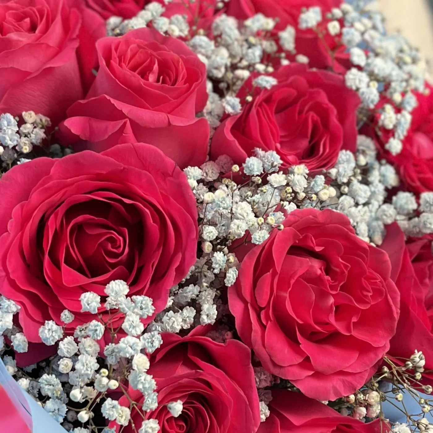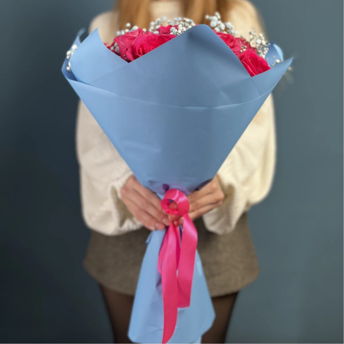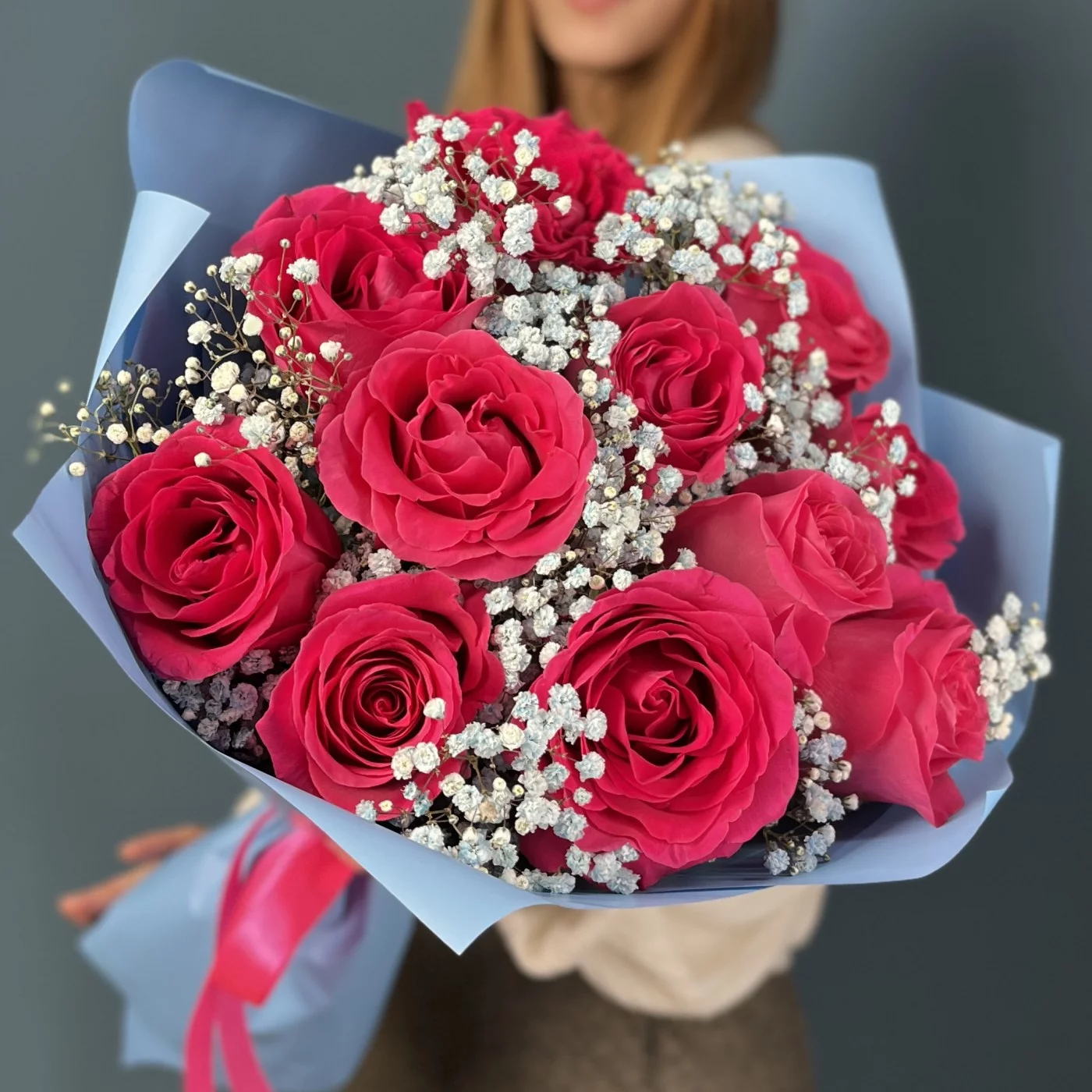 Букет из 11 малиновых роз Пинк Флойд с голубой гипсофилой — это не только красивый, но и запоминающийся подарок для любого события.