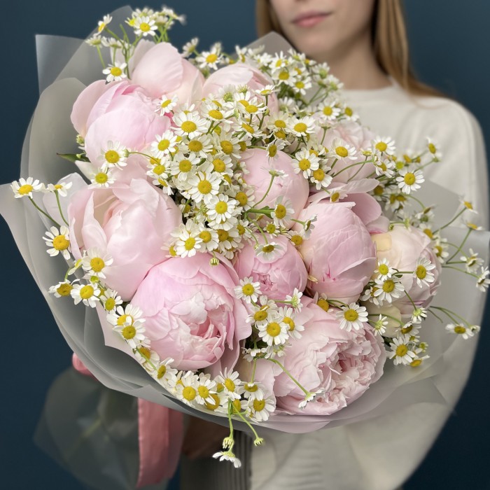 Букет из 11 пионов Ангел Чикс с ромашками — это изысканная и нежная композиция, которая сочетает в себе пышность и свежесть. Пионы Ангел Чикс славятся своей мягкой окраской, крупной формой и приятным ароматом, создавая ощущение уюта и романтики. В сочетании с легкими, искрящимися ромашками букет приобретает нотки игривости, природной свежести и естественной красоты. Такой букет идеально подойдет для романтического подарка, особого случая или как украшение для торжества, подчеркнет женственность и гармонию, оставляя теплое и трогательное впечатление.