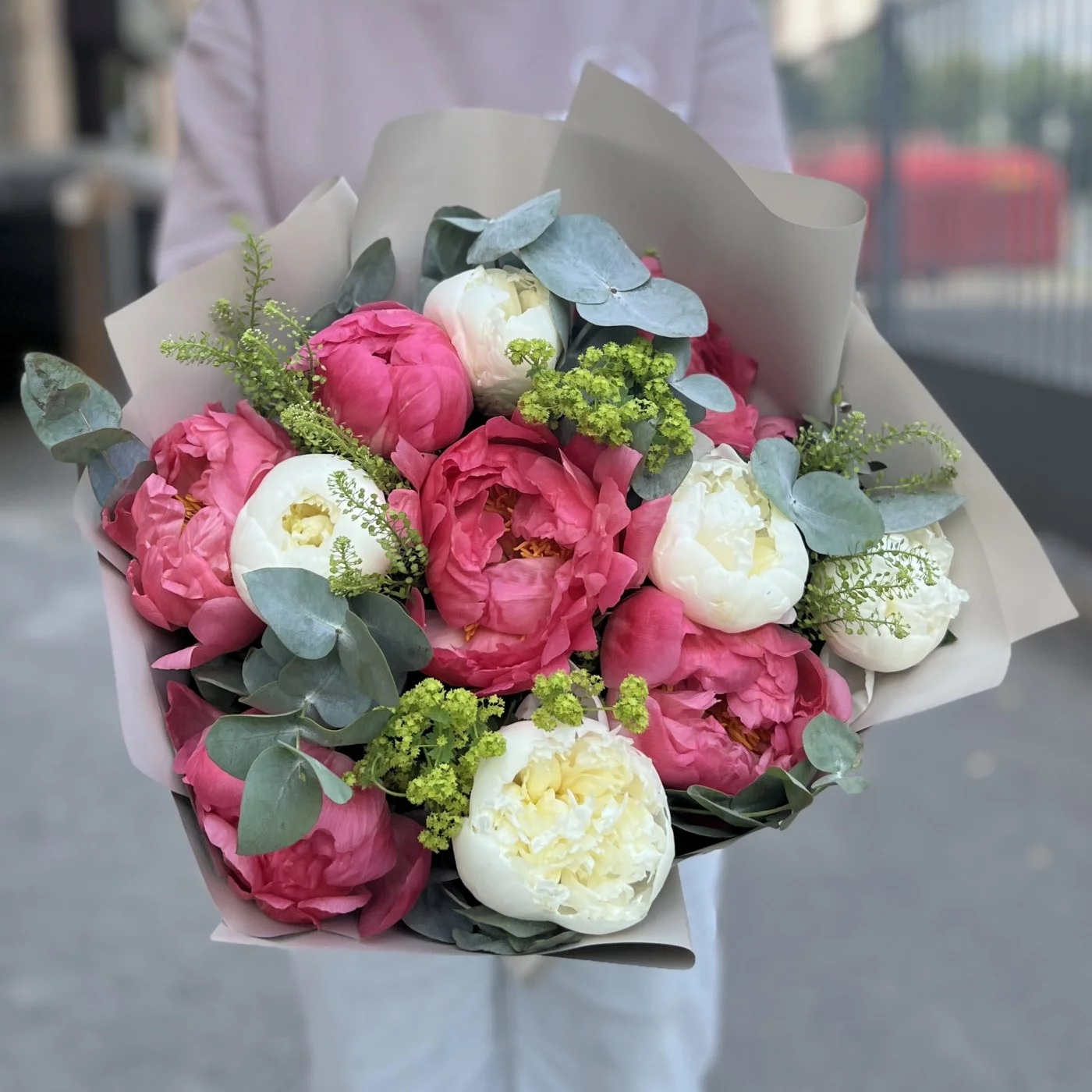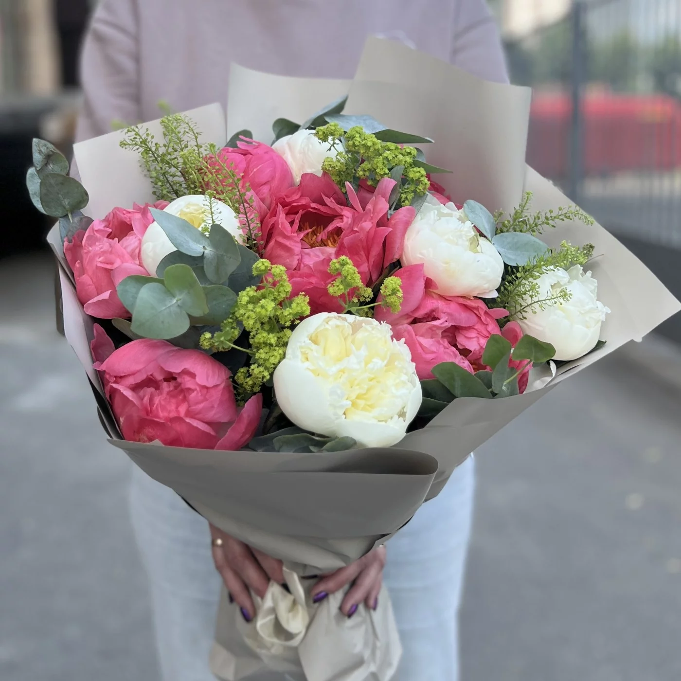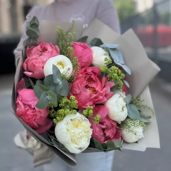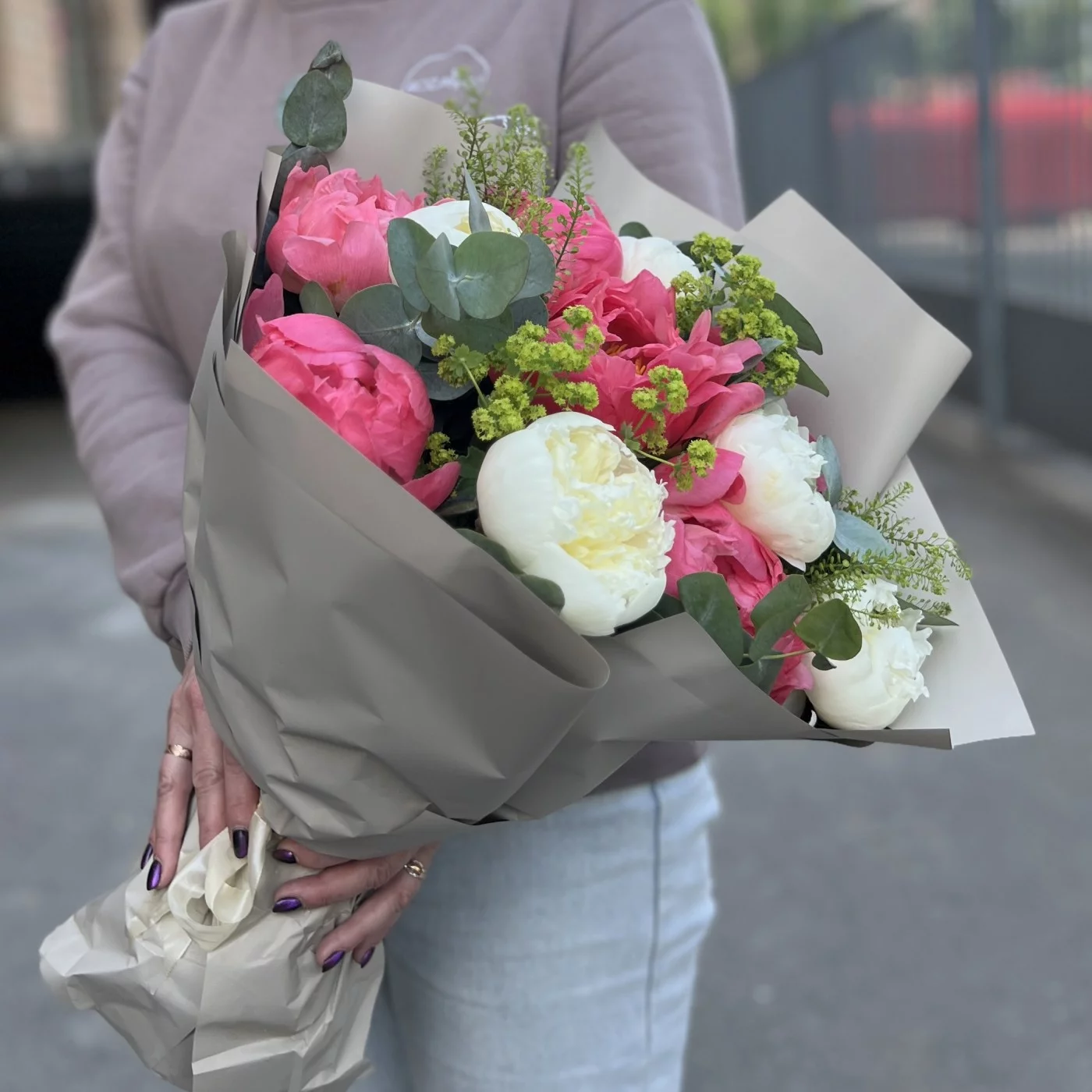 Букет из 11 пионов с зеленью в упаковке — это изысканный и романтичный букет, который подчеркнет особенность любого праздника или подарка. Пионы, известные своей пышностью и нежностью, создают ощущение уюта и красоты, а свежая зелень добавляет природной свежести и гармонии. Такой букет отлично подойдет для выражения любви, благодарности или просто для того, чтобы порадовать близкого человека. Упаковка придает завершенность и стильный вид, делая этот подарок особенно привлекательным.