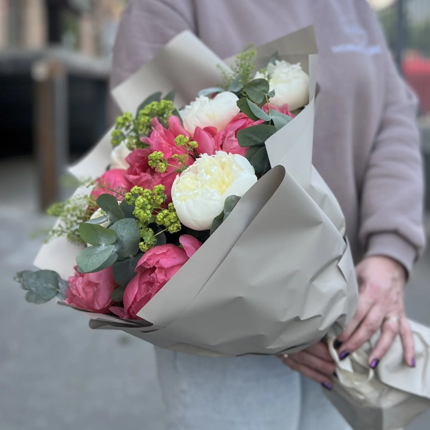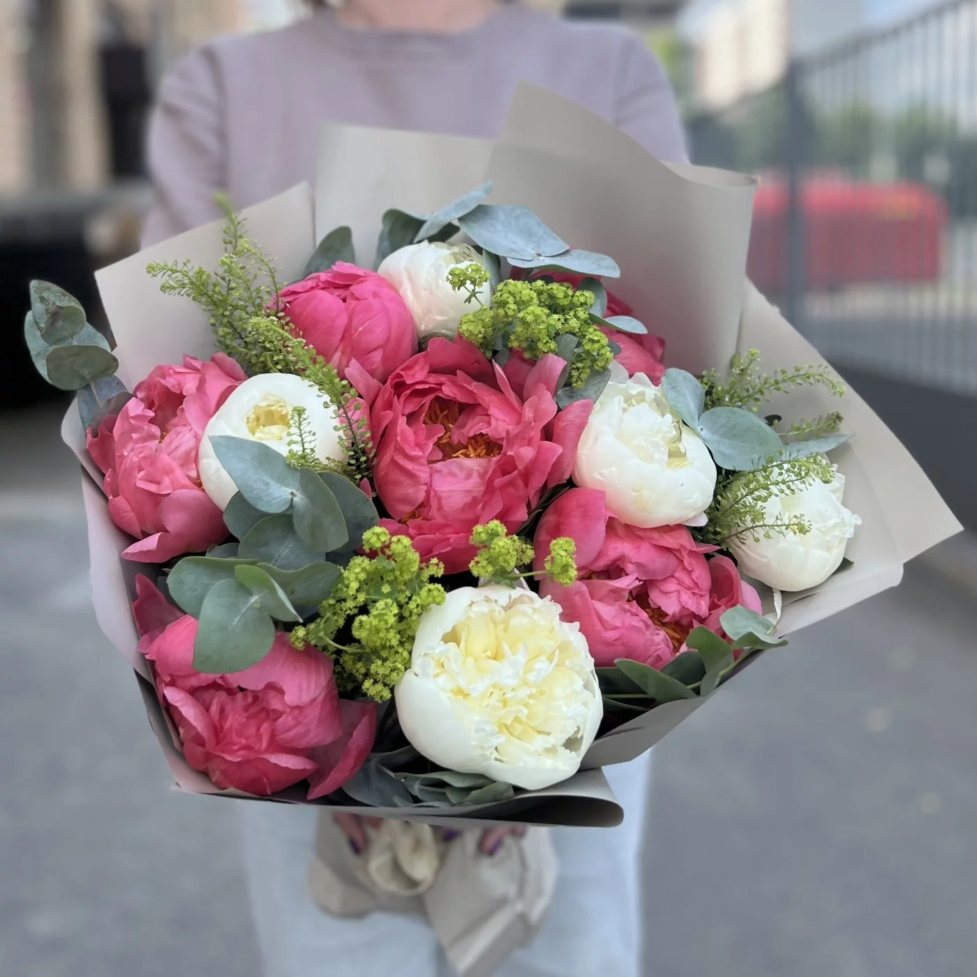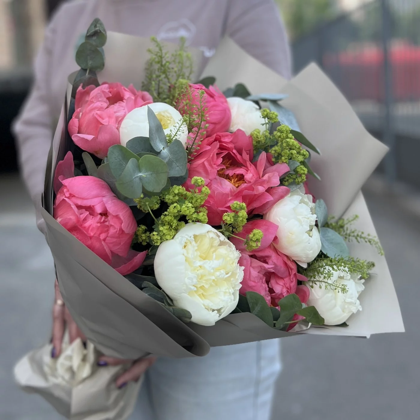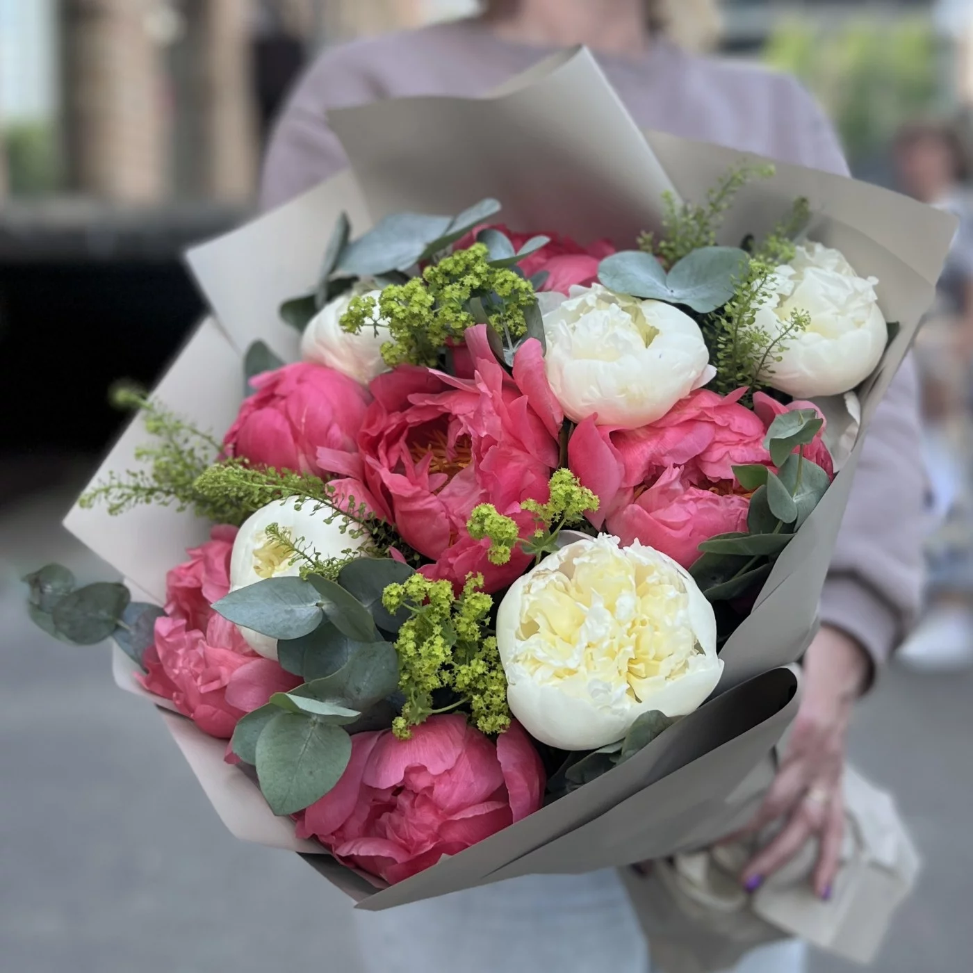 Букет из 11 пионов с зеленью в упаковке — это изысканный и романтичный букет, который подчеркнет особенность любого праздника или подарка. Пионы, известные своей пышностью и нежностью, создают ощущение уюта и красоты, а свежая зелень добавляет природной свежести и гармонии. Такой букет отлично подойдет для выражения любви, благодарности или просто для того, чтобы порадовать близкого человека. Упаковка придает завершенность и стильный вид, делая этот подарок особенно привлекательным.