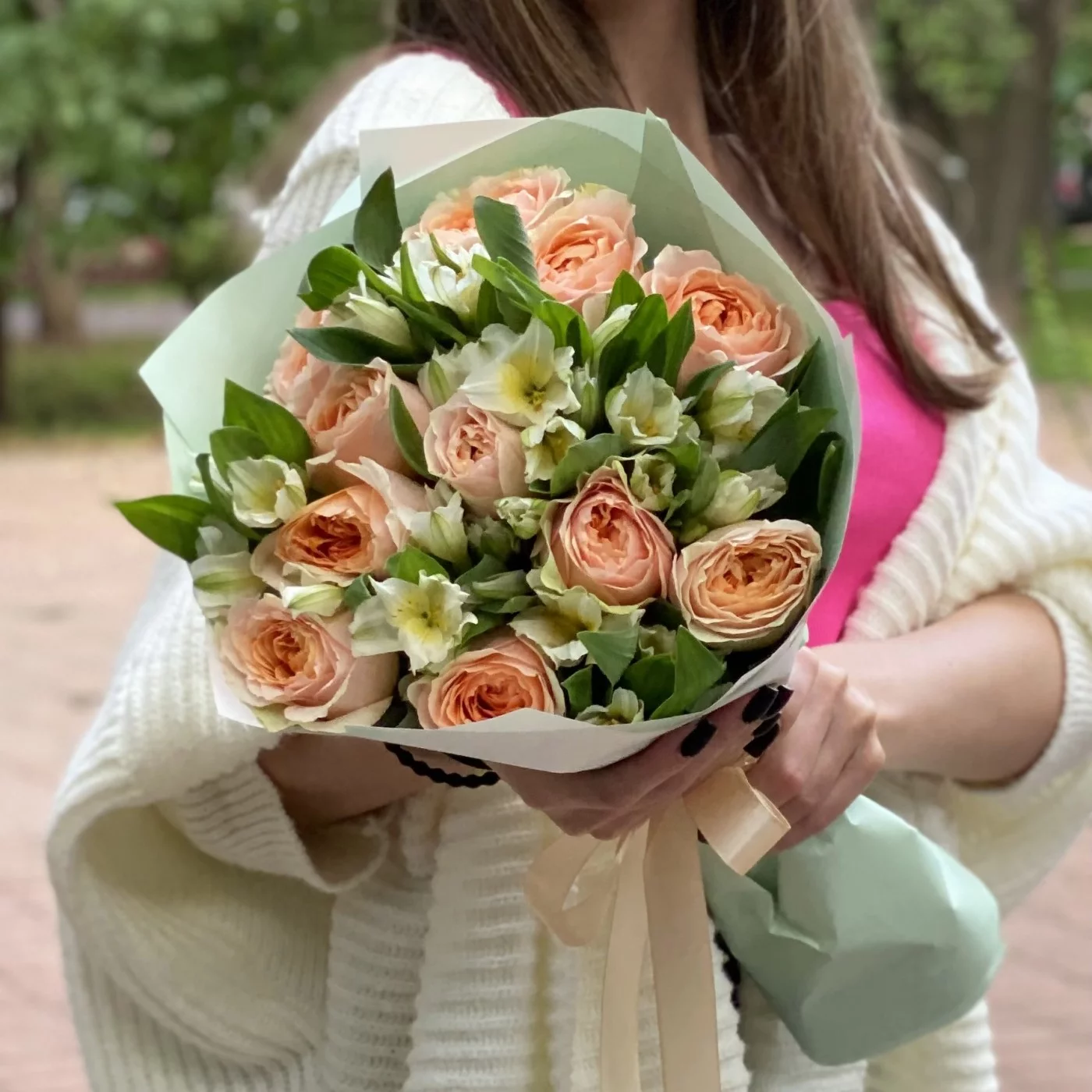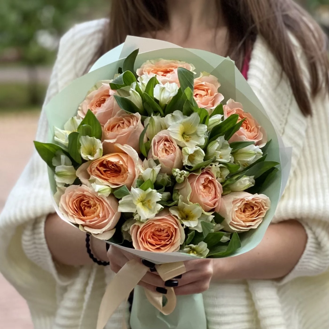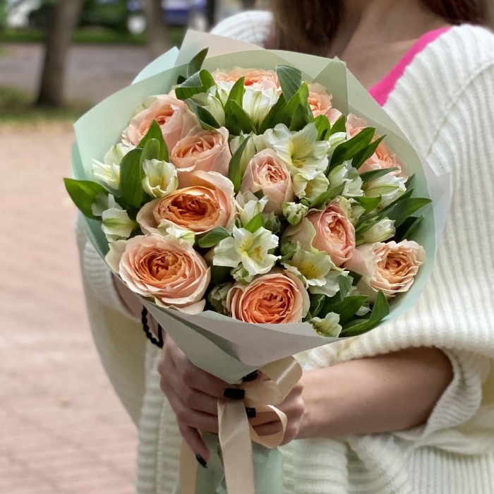 Букет из 11 пионовидных роз сорта Гравити в сочетании с белой пушистой альстромерией отлично подойдет к основному подарку на день рождения маме, любимой женщине или дочери. Наши флористы собирают букеты исключительно из свежесрезанных цветов, поэтому ваш цветочный комплимент гарантированно будет радовать свою хозяйку в течение долгих дней.