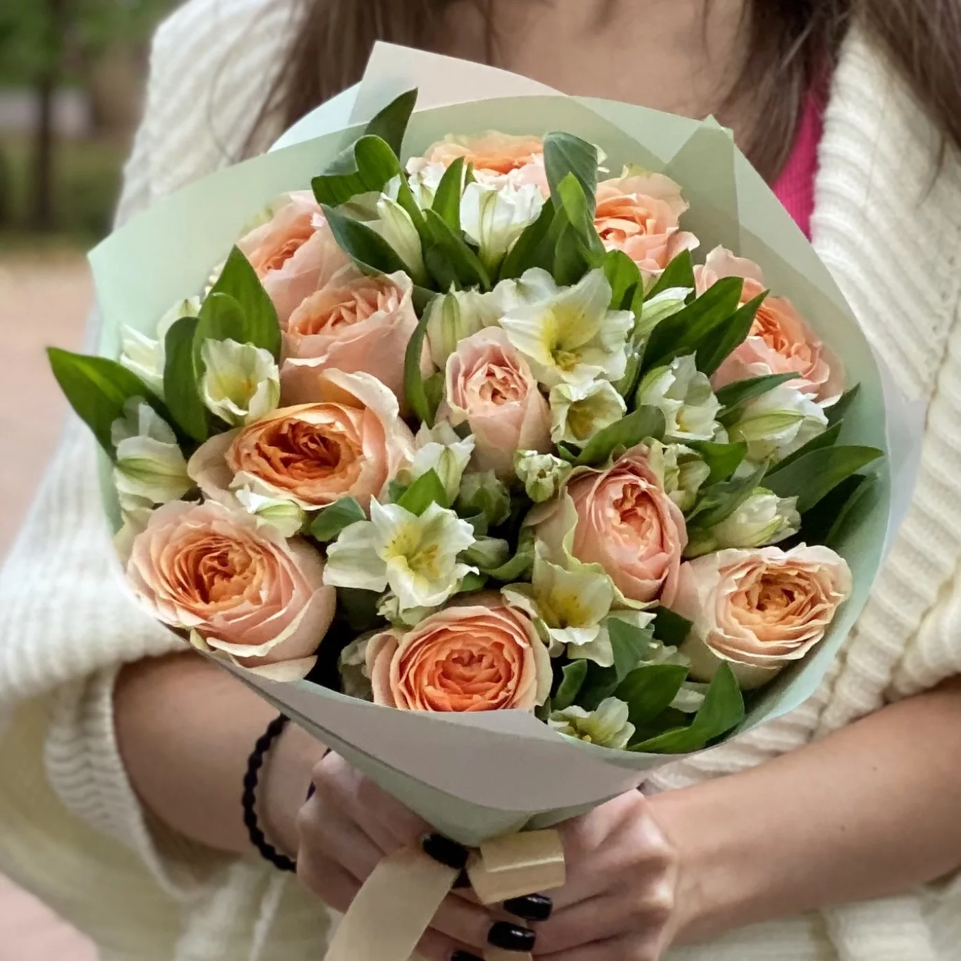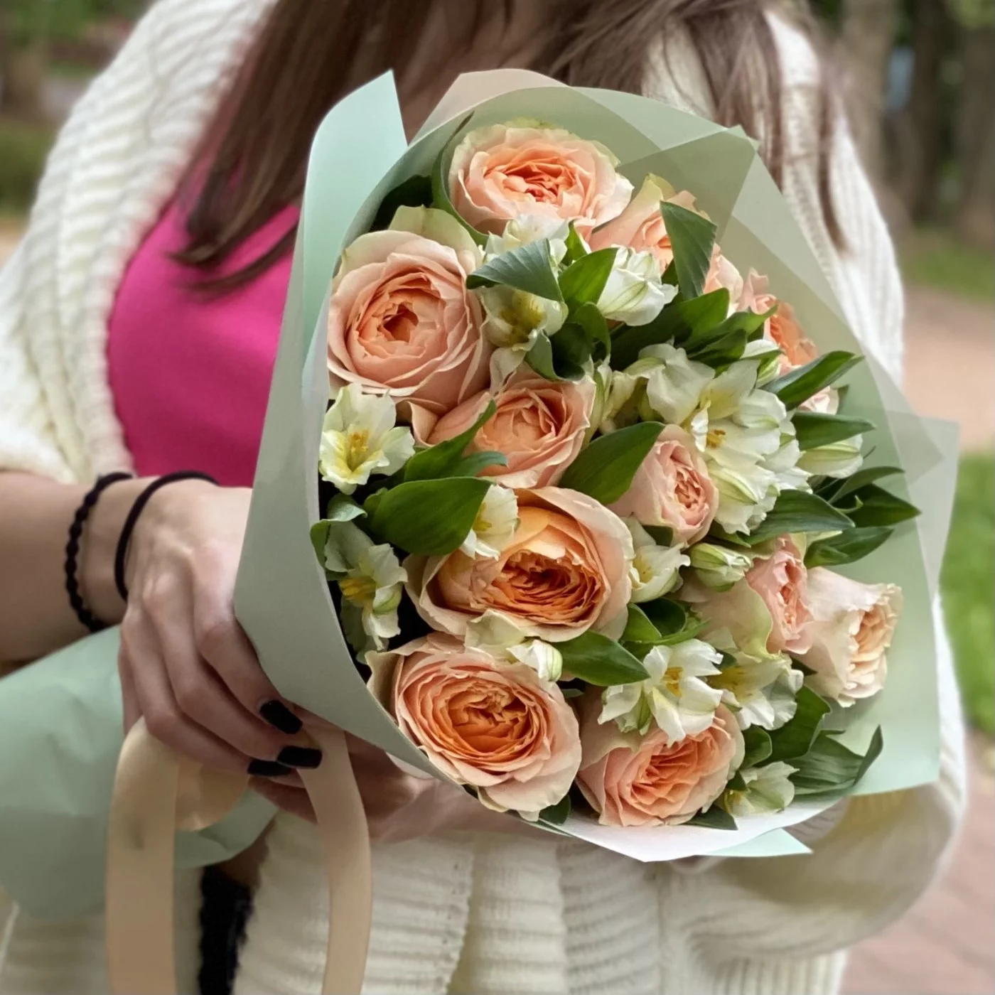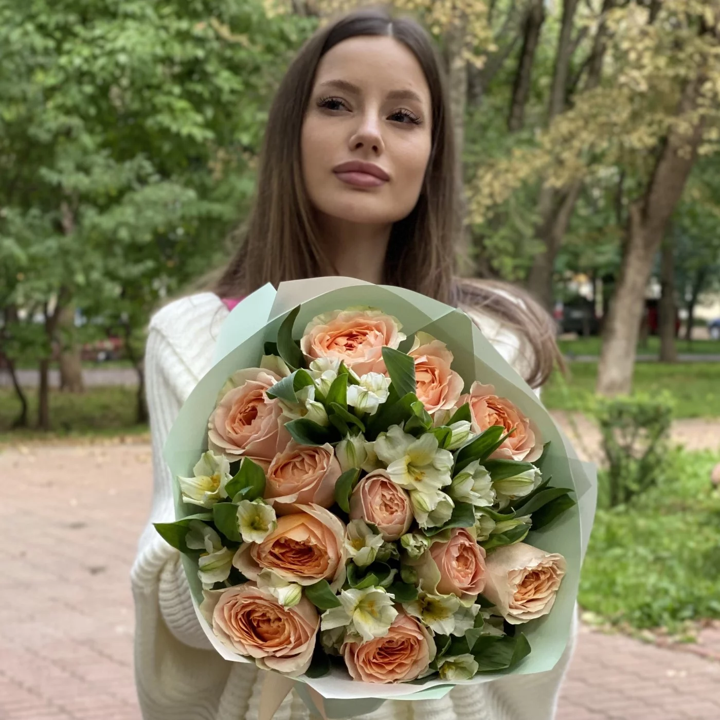 Букет из 11 пионовидных роз сорта Гравити в сочетании с белой пушистой альстромерией отлично подойдет к основному подарку на день рождения маме, любимой женщине или дочери. Наши флористы собирают букеты исключительно из свежесрезанных цветов, поэтому ваш цветочный комплимент гарантированно будет радовать свою хозяйку в течение долгих дней.