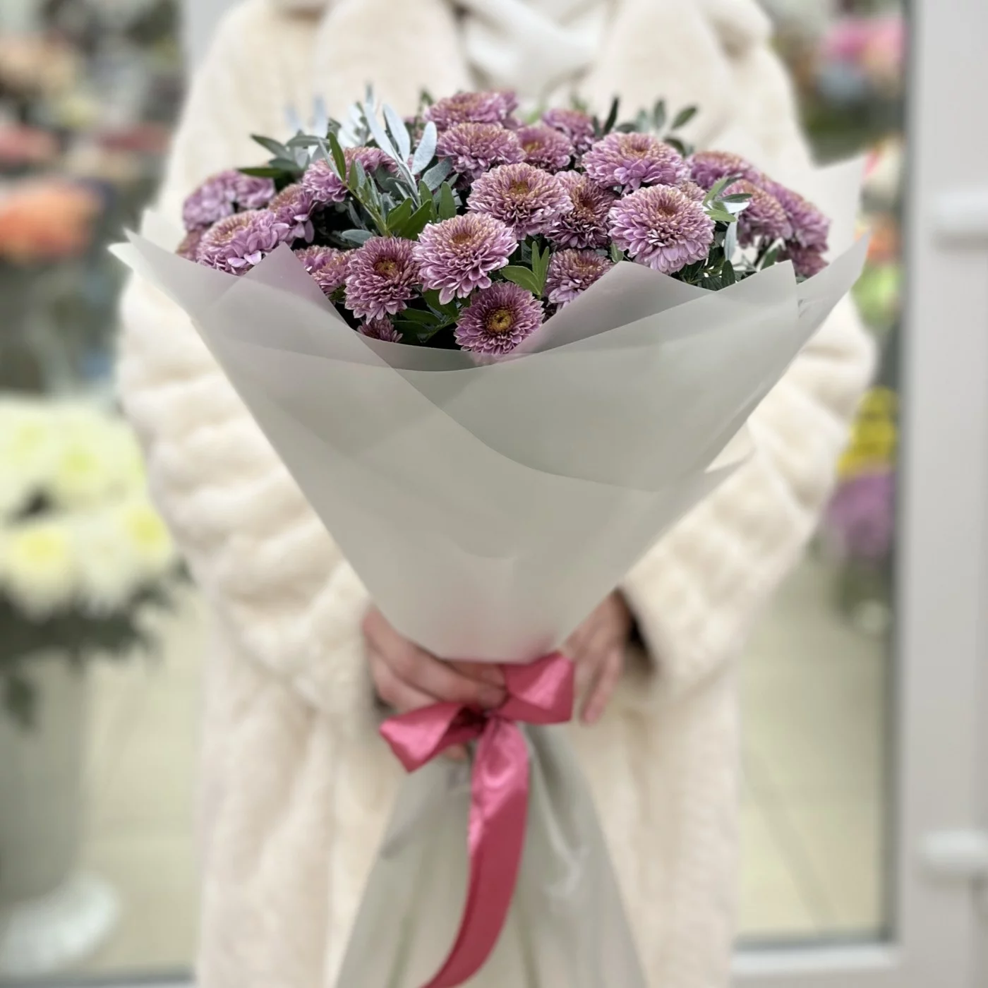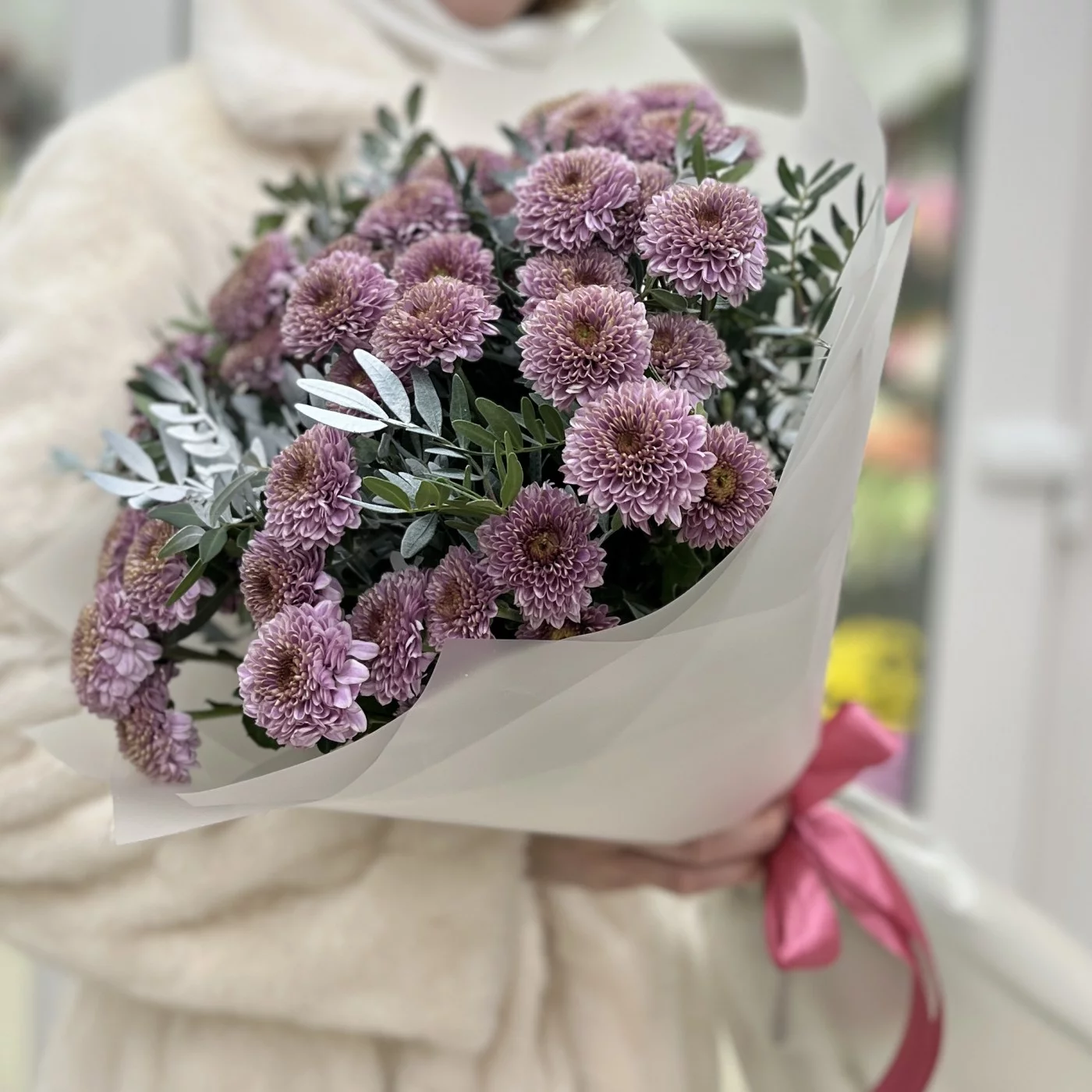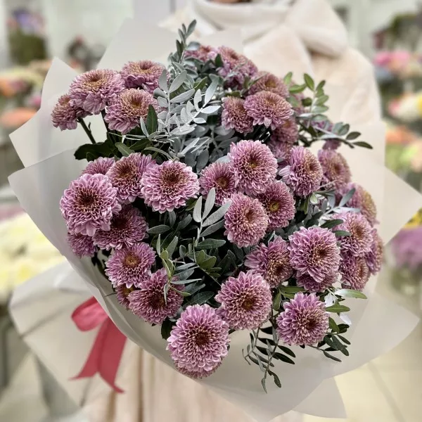 Букет из 11 розовых кустовых хризантем сорта «Романс» — это изящное и стильное украшение, которое привносит тепло и нежность в любое событие.