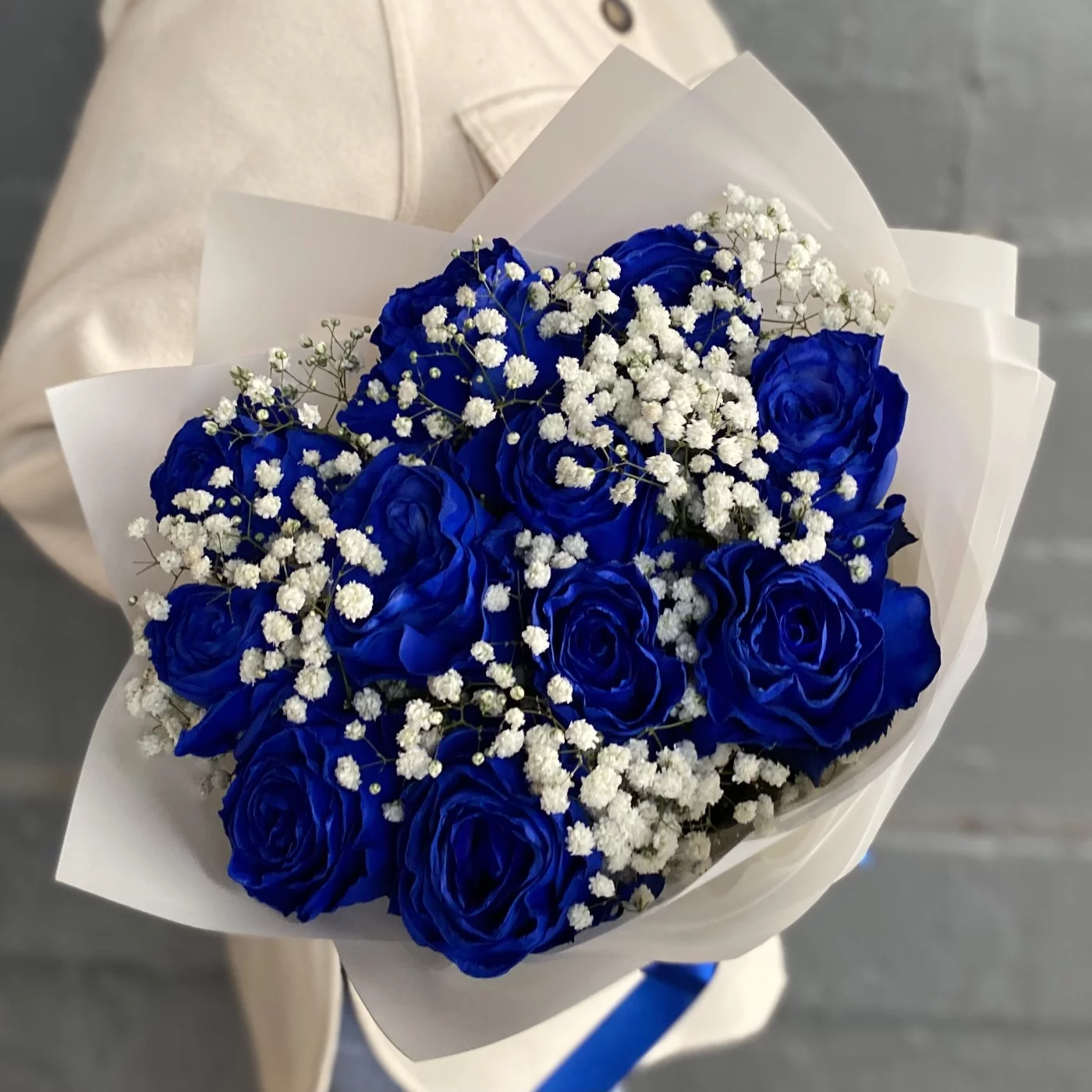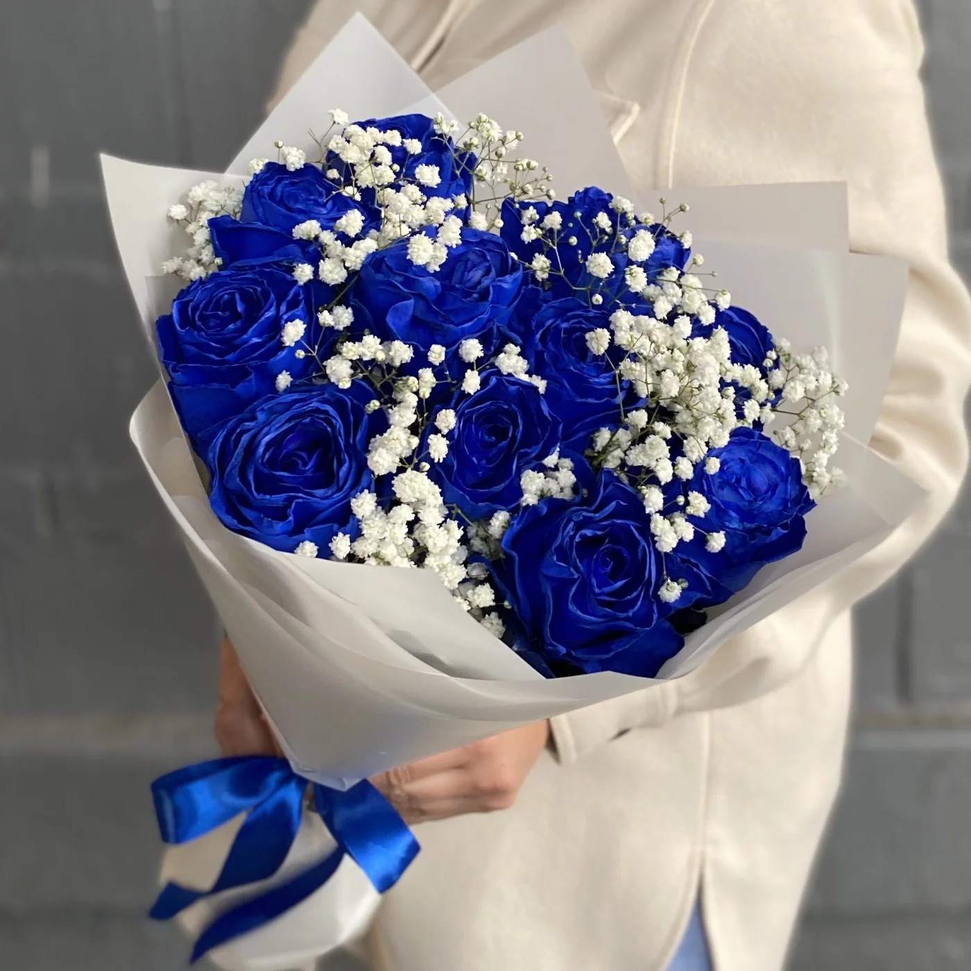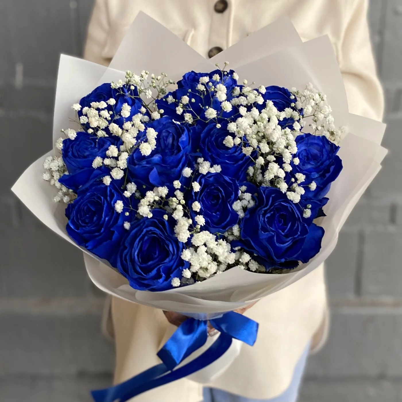 11 синих роз с гипсофилой отлично подойдет, если Вы хотите удивить получателя необычным букетом.