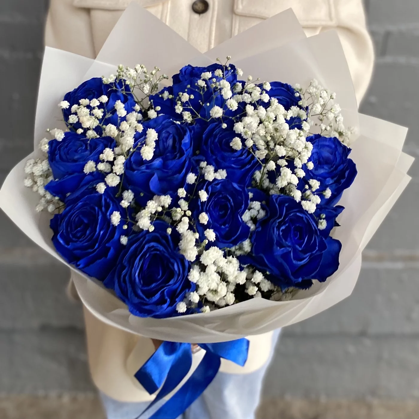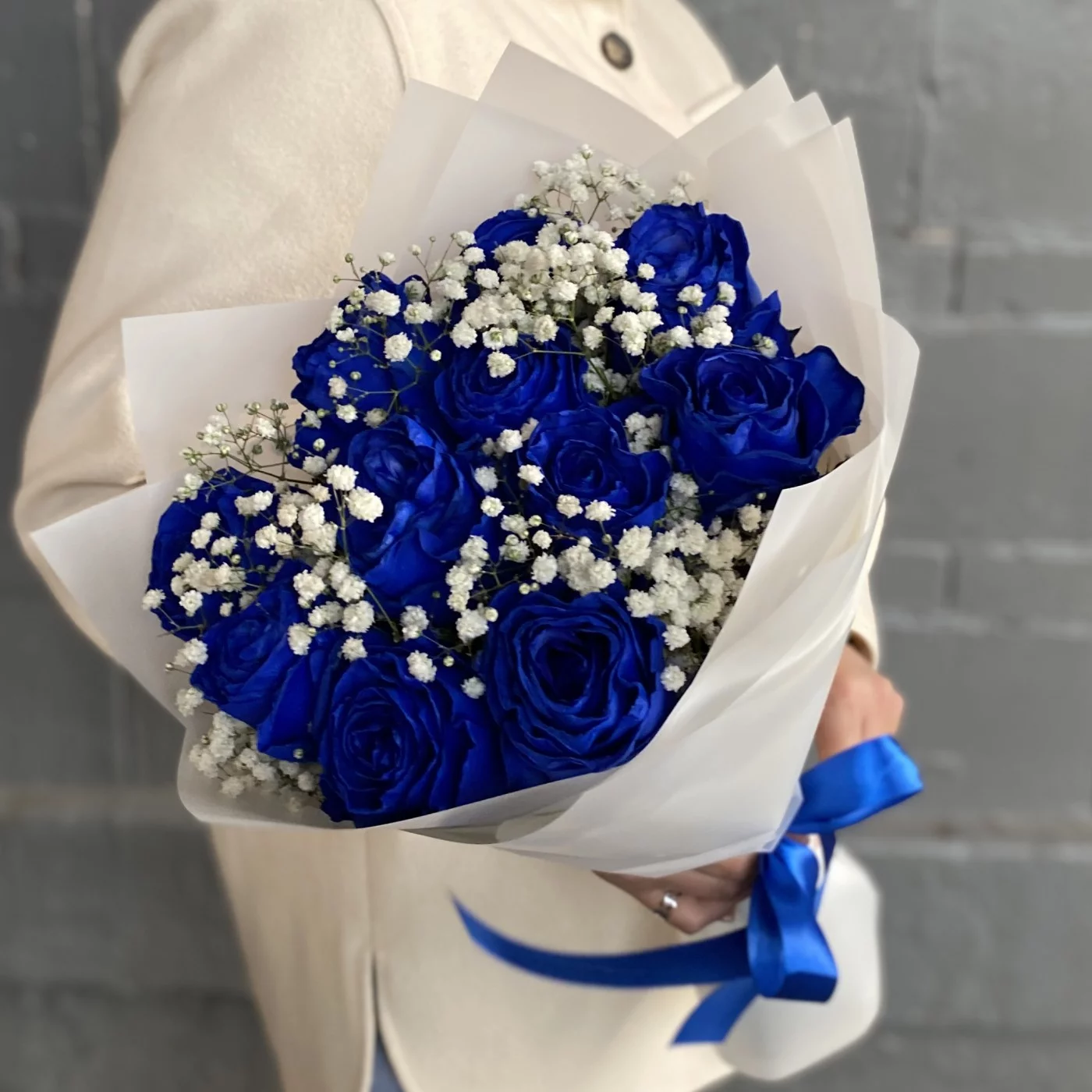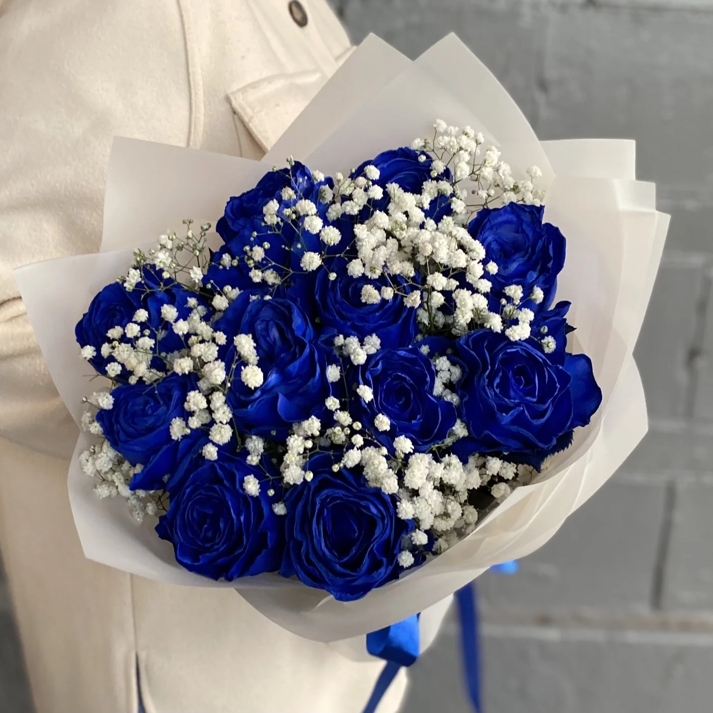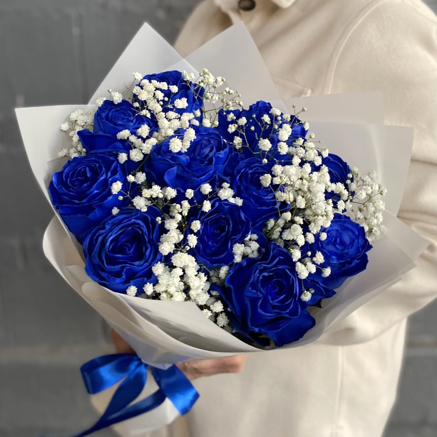 11 синих роз с гипсофилой отлично подойдет, если Вы хотите удивить получателя необычным букетом.
