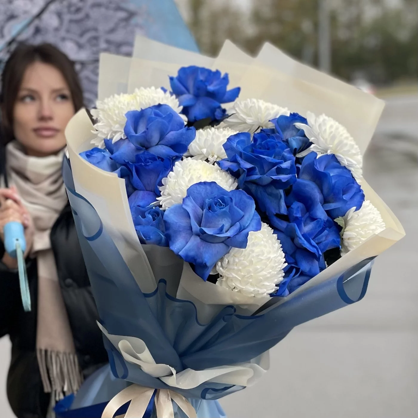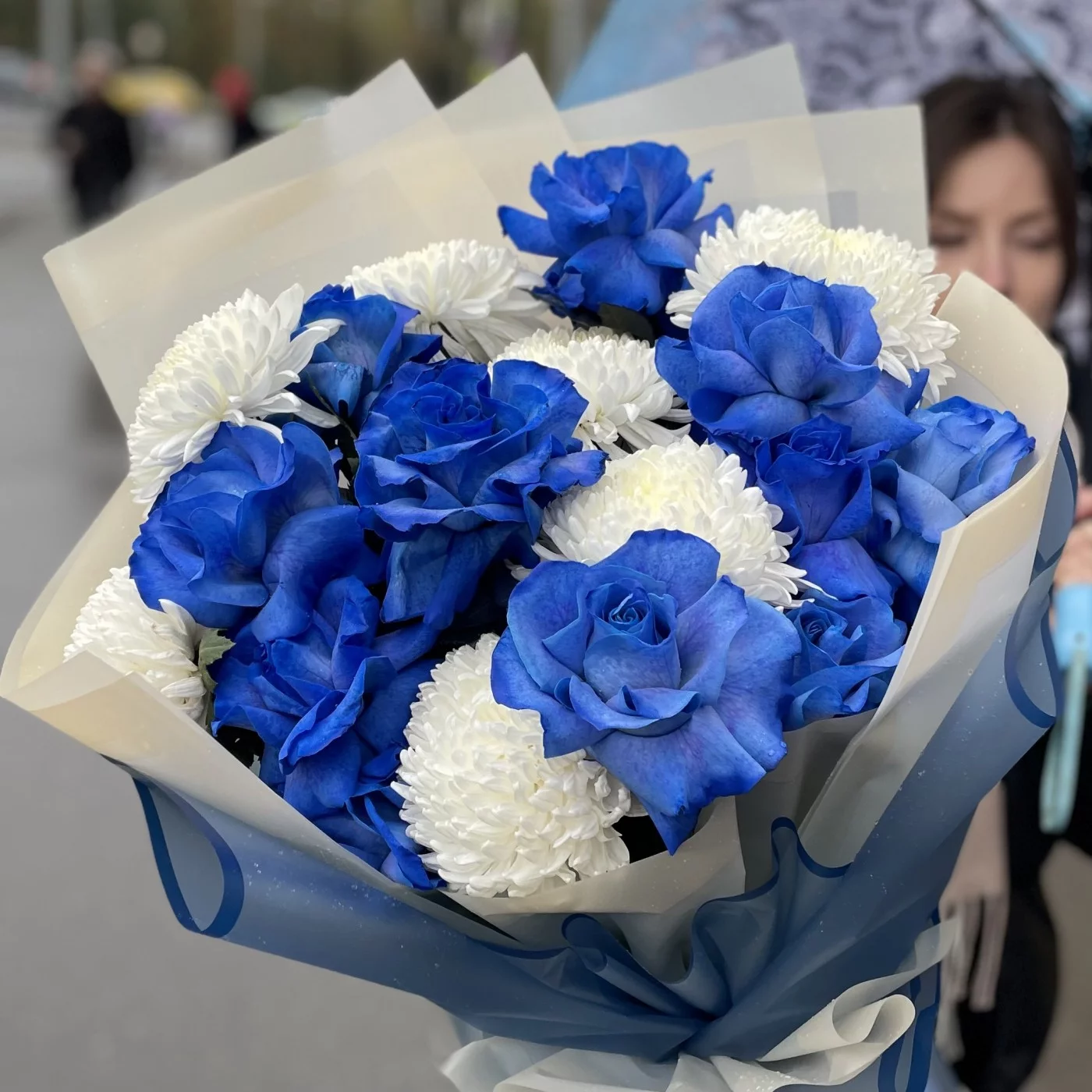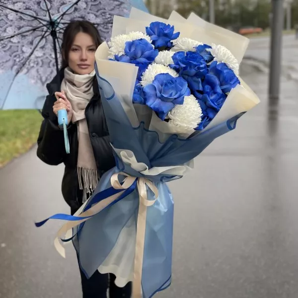 Бело-синяя комбинация букета – беспроигрышный вариант, если предстоит встреча с любимым человеком, торжественный банкет, свадьба, день рождения близких или друзей. Великолепие необычных ярко-синих роз изысканно подчеркивается огромными белоснежными хризантемами, и такая композиция выглядит одновременно торжественно и ярко, создавая атмосферу праздника, важного в жизни события. У нас вы можете заказать такой букет за разумную цену, и мы доставим его по всей Москве и МО быстро и бережно. Предварительно вышлем фото! По вашему желанию можем дополнить букет конфетами или мягкой игрушкой. Работаем ежедневно и круглосуточно, выполняем заказы оперативно и качественно.