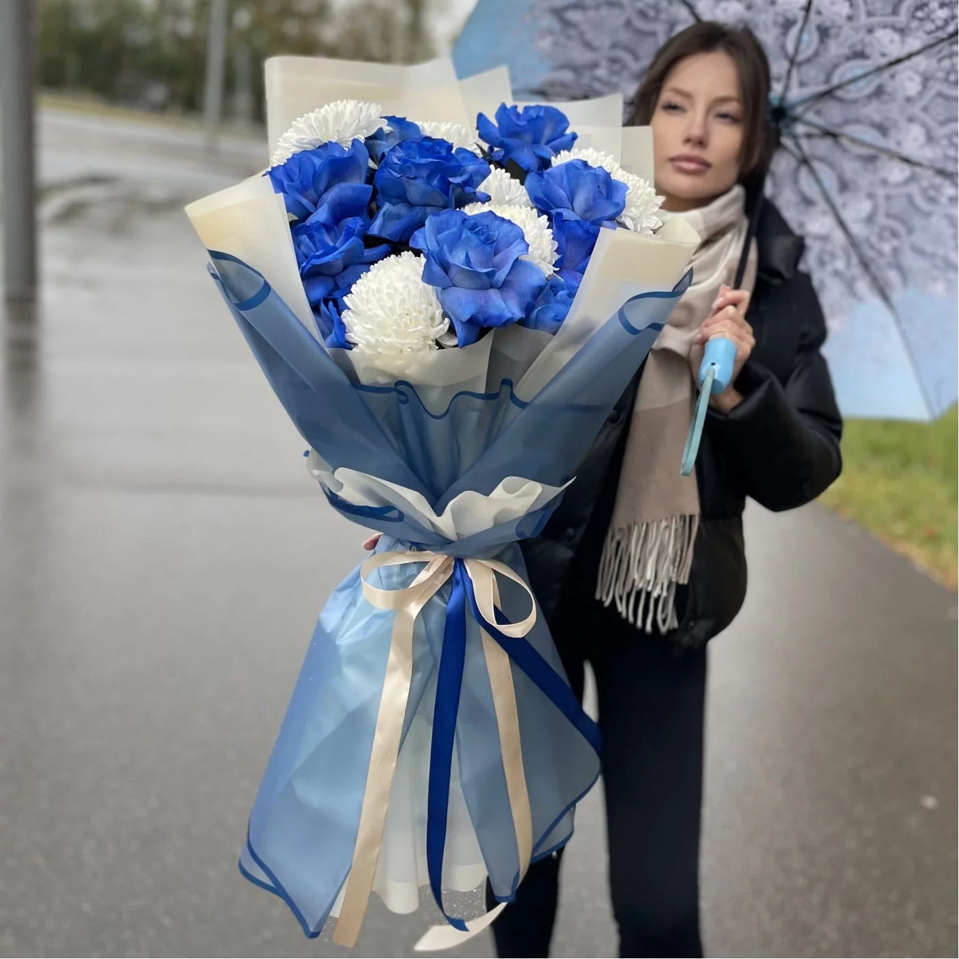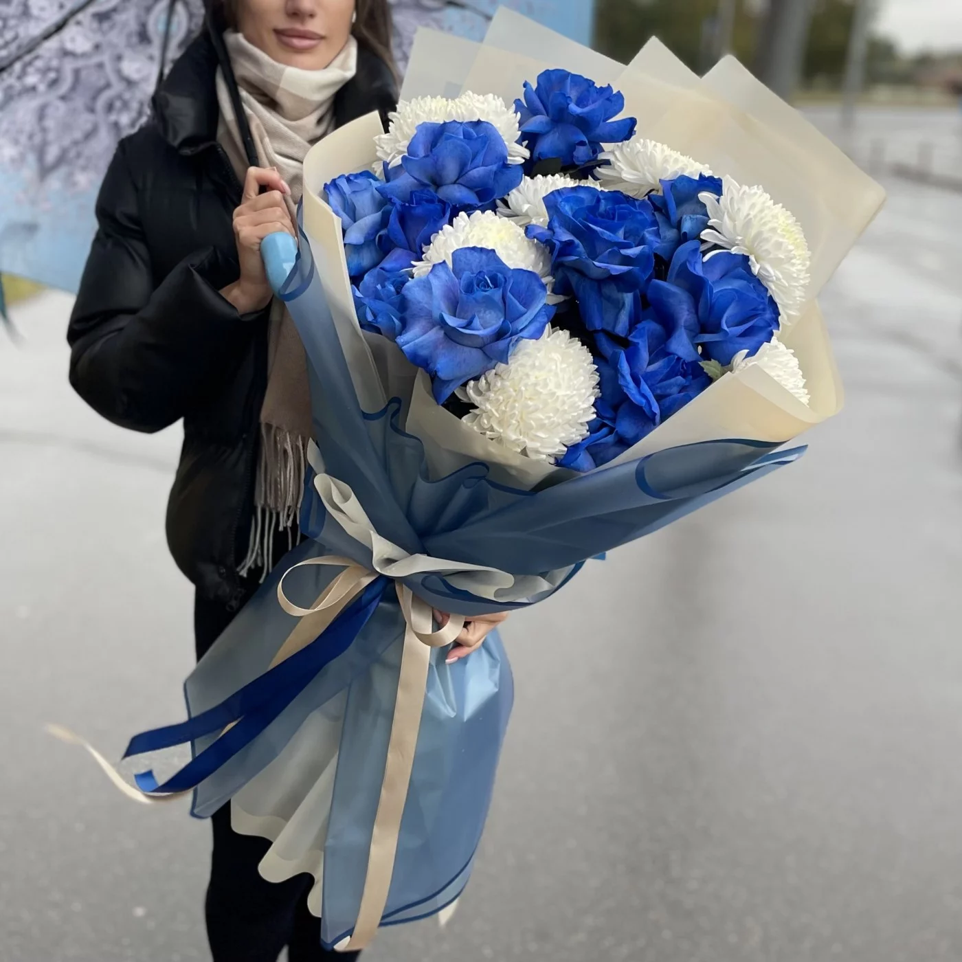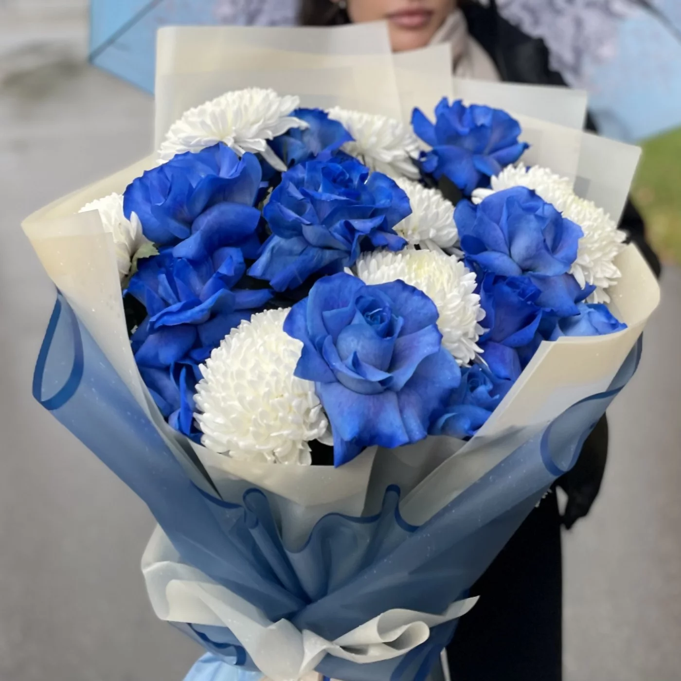 Бело-синяя комбинация букета – беспроигрышный вариант, если предстоит встреча с любимым человеком, торжественный банкет, свадьба, день рождения близких или друзей. Великолепие необычных ярко-синих роз изысканно подчеркивается огромными белоснежными хризантемами, и такая композиция выглядит одновременно торжественно и ярко, создавая атмосферу праздника, важного в жизни события. У нас вы можете заказать такой букет за разумную цену, и мы доставим его по всей Москве и МО быстро и бережно. Предварительно вышлем фото! По вашему желанию можем дополнить букет конфетами или мягкой игрушкой. Работаем ежедневно и круглосуточно, выполняем заказы оперативно и качественно.