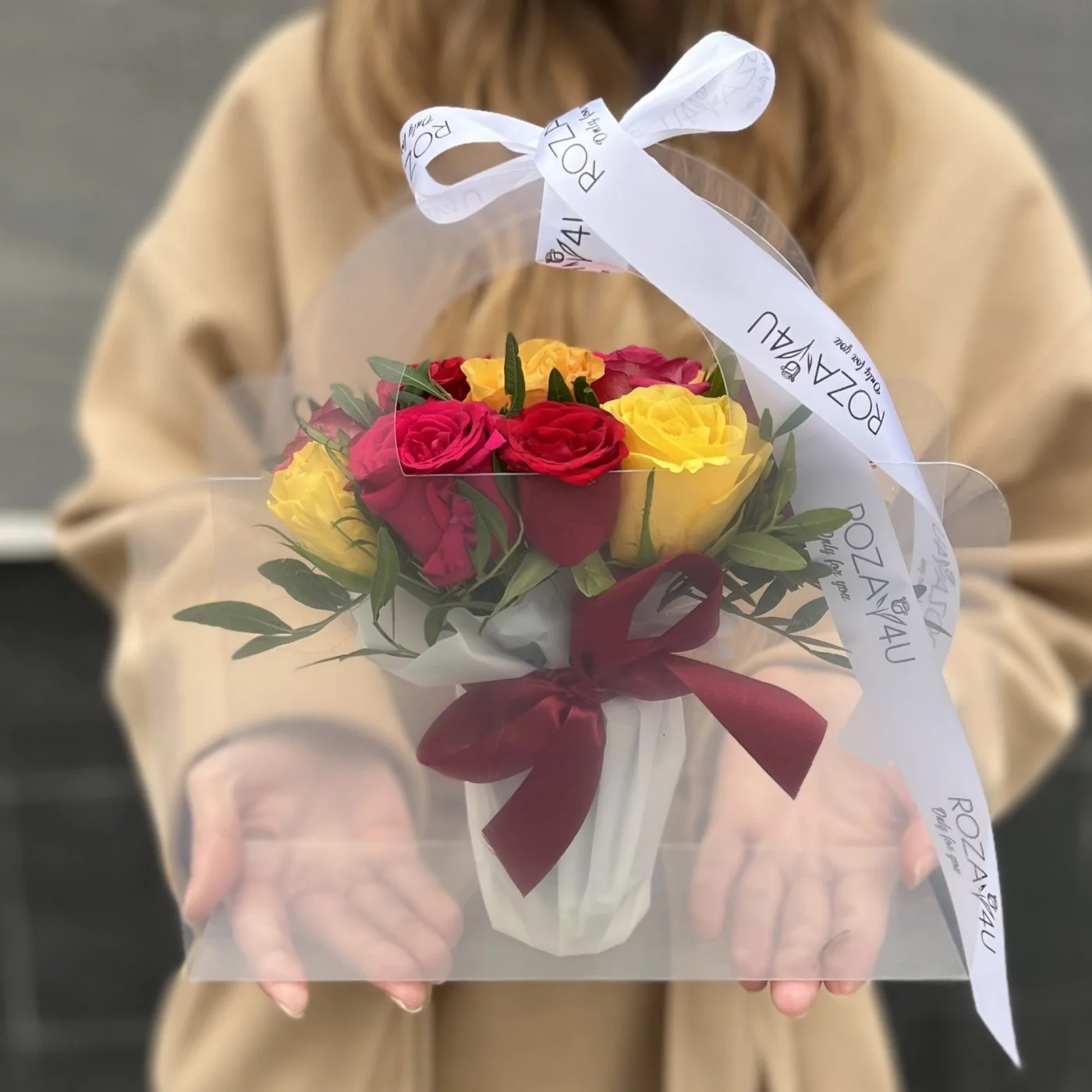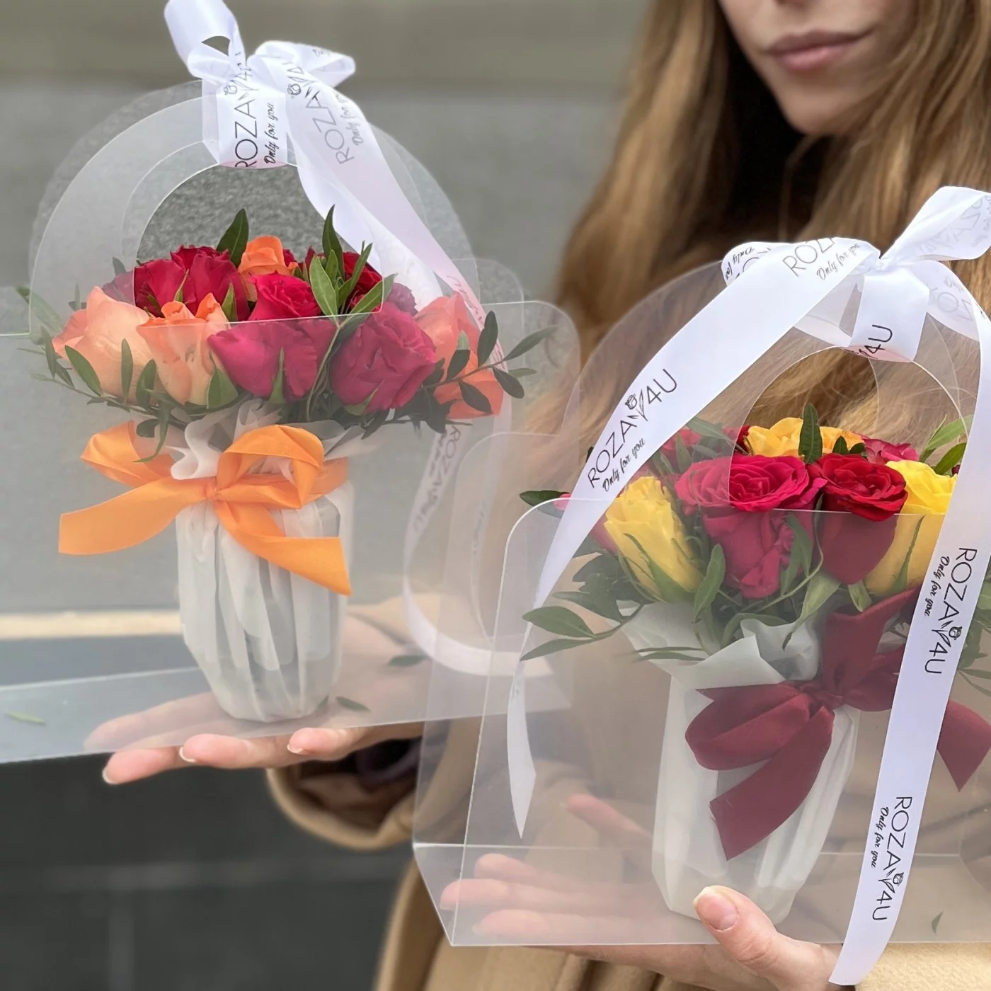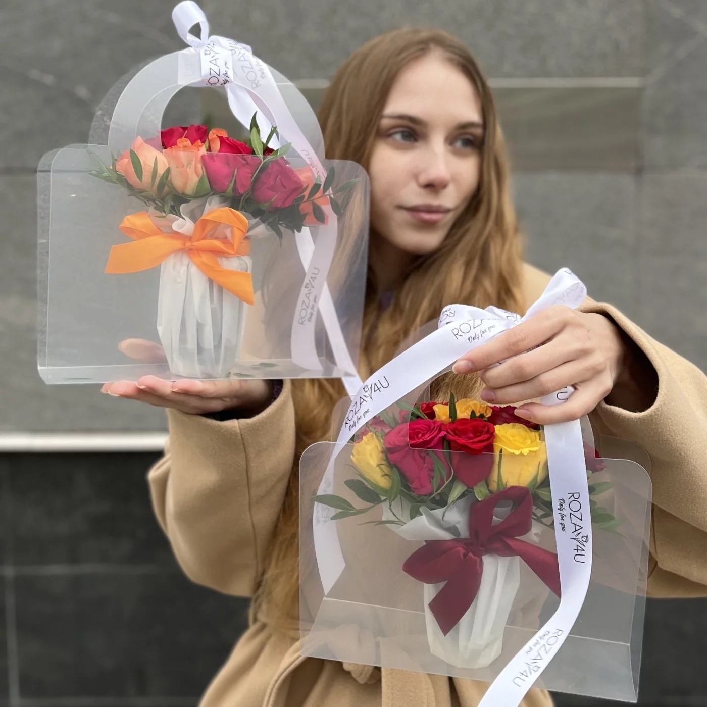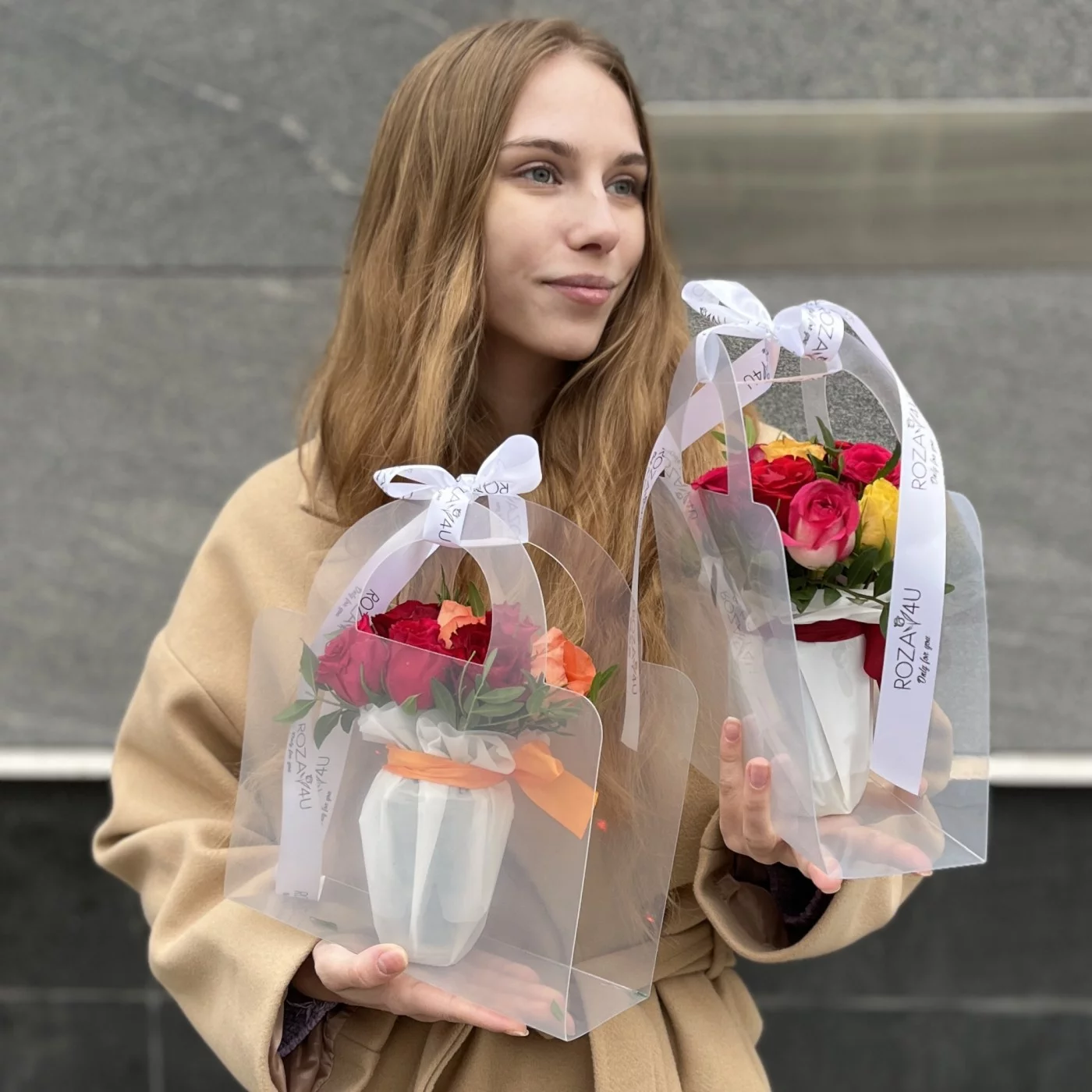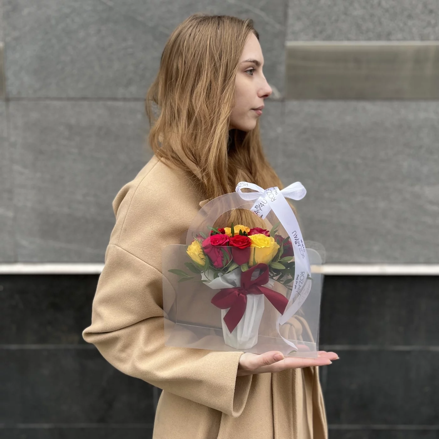 Яркая композиция в стильной сумочке MIX – это изысканный подарок, который сочетает нежность цветов и оригинальный дизайн. Идеально подходит для создания праздничного настроения и добавления свежести в интерьер.