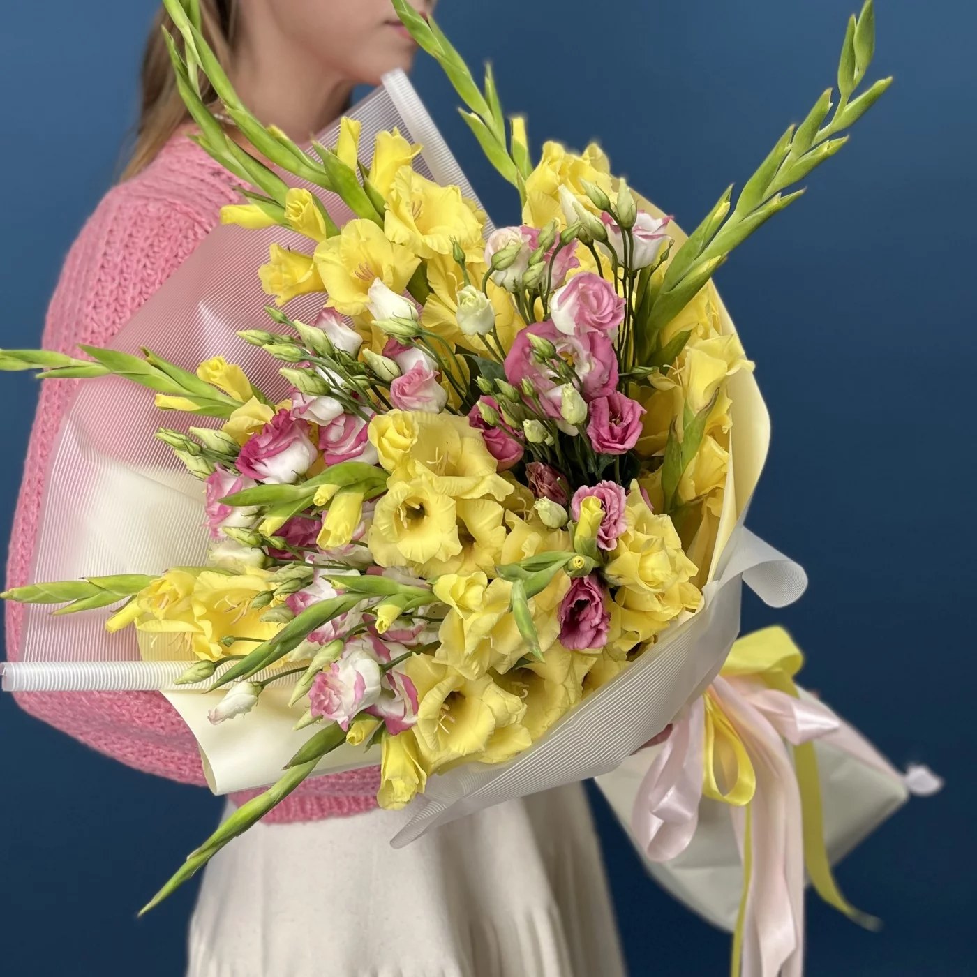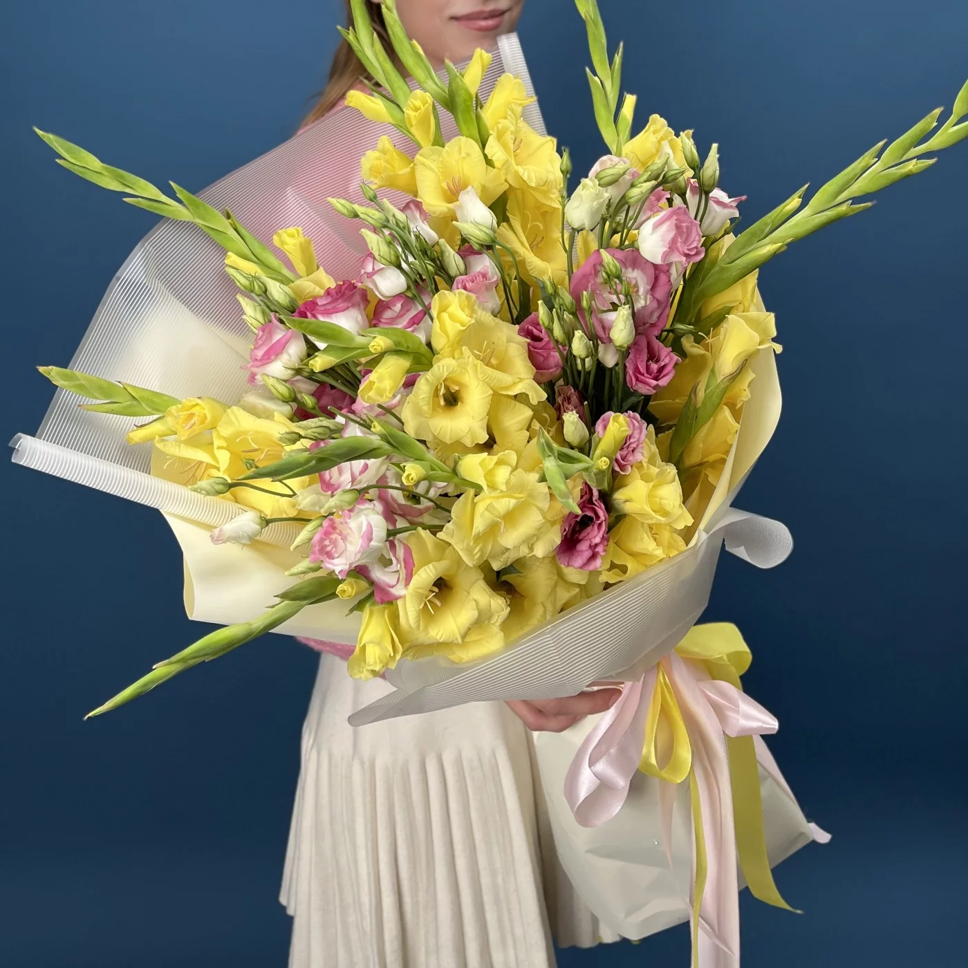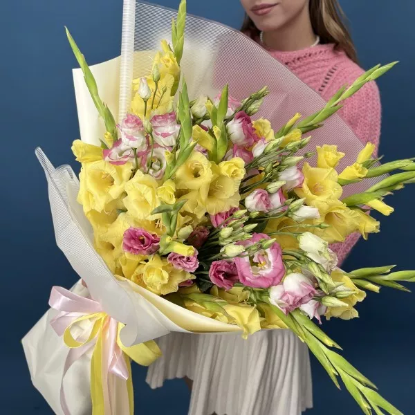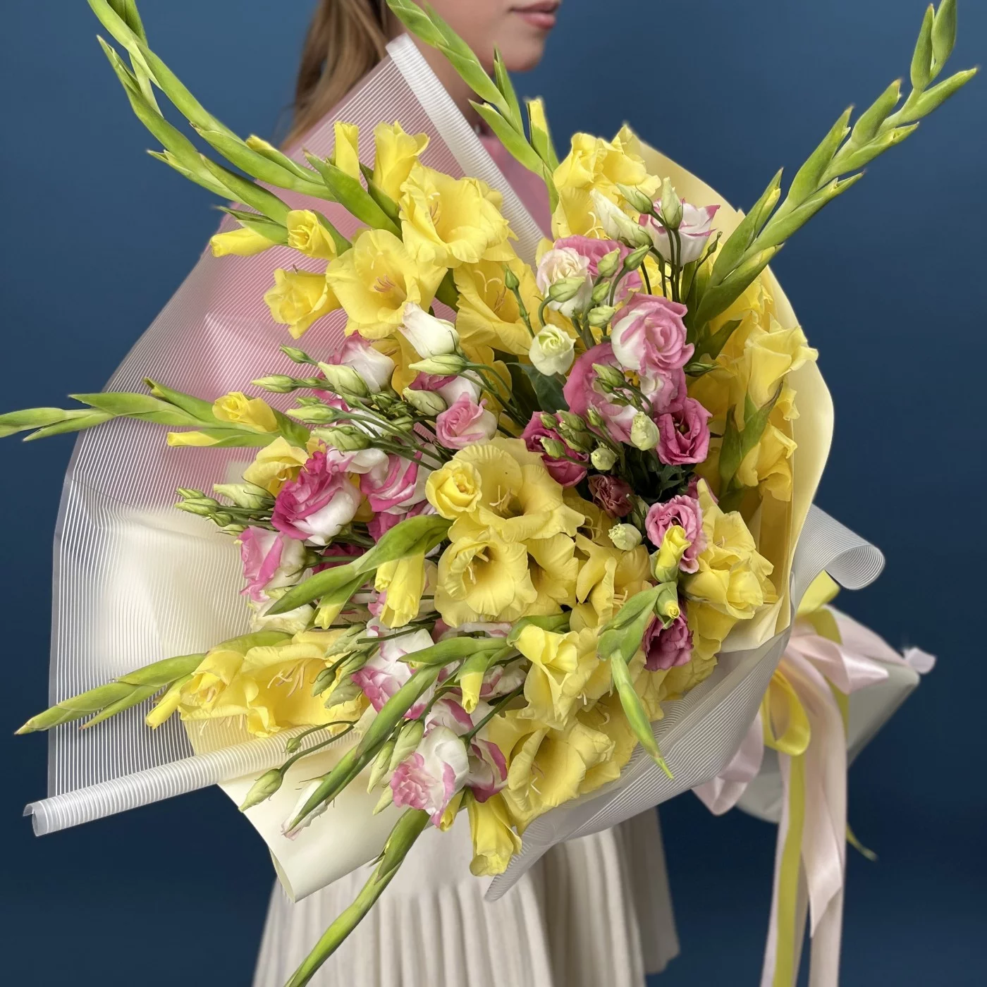 Этот букет сочетает в себе силу, достоинство и радость. Вертикальные линии гладиолусов задают мощный, торжественный ритм, а нежные чашечки эустомы смягчают композицию, добавляя ей нежности и изящества. Желтый цвет объединяет их, делая букет по-настоящему солнечным и позитивным.