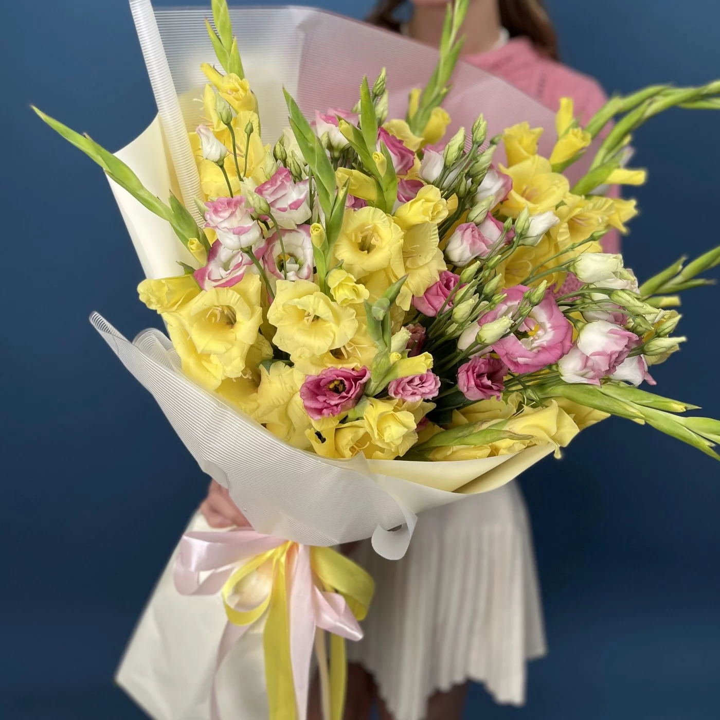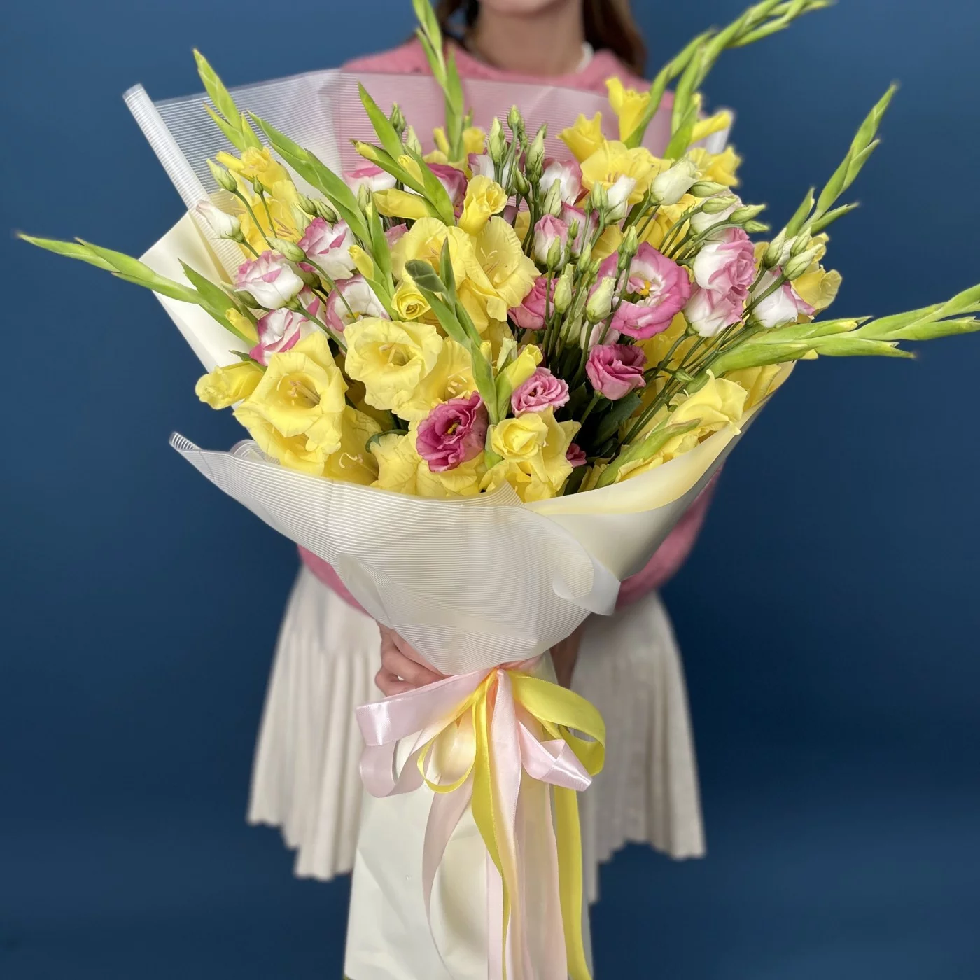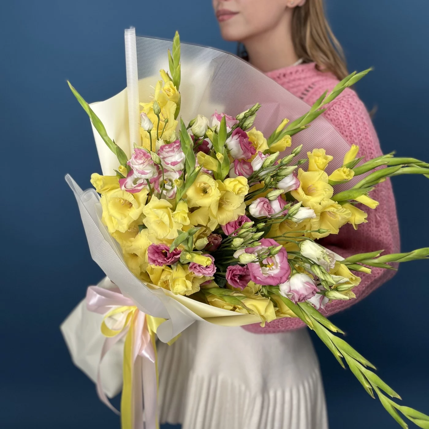 Этот букет сочетает в себе силу, достоинство и радость. Вертикальные линии гладиолусов задают мощный, торжественный ритм, а нежные чашечки эустомы смягчают композицию, добавляя ей нежности и изящества. Желтый цвет объединяет их, делая букет по-настоящему солнечным и позитивным.