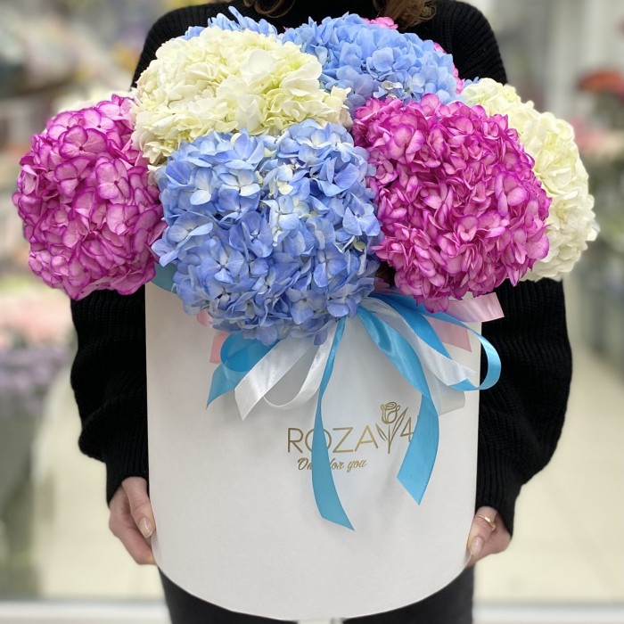 Яркая композиция в шляпной коробке из 13 бархатистых гортензий, станет прекрасным подарком на день рождения, юбилей или свадьбу.