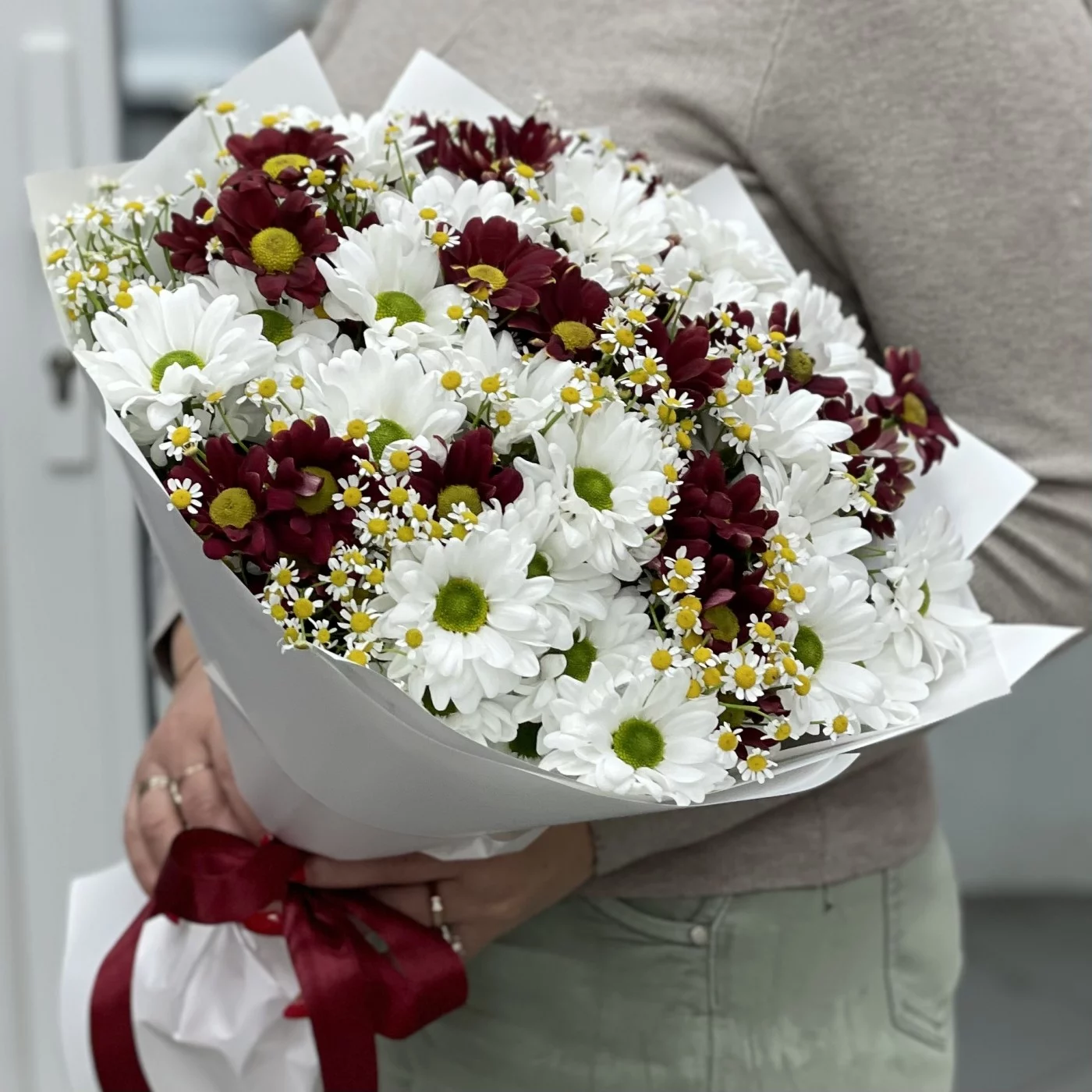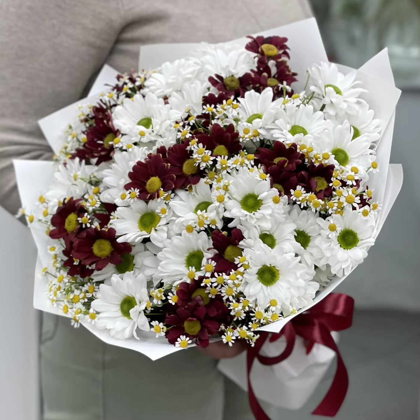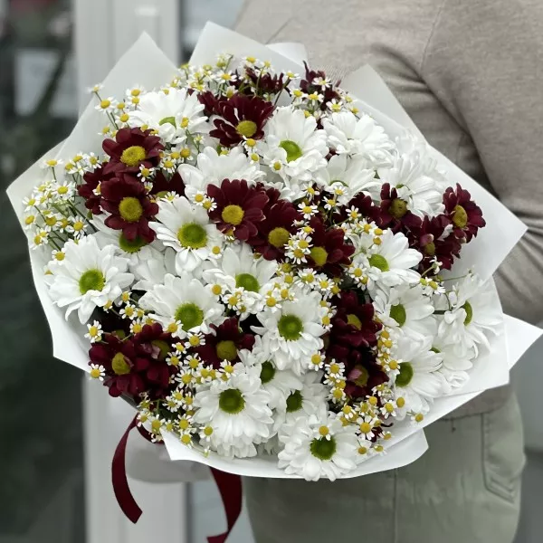Букет из 13 кустовых хризантем Бакарди с ромашками — это прекрасное сочетание, которое объединяет красоту, яркость и нежность.
