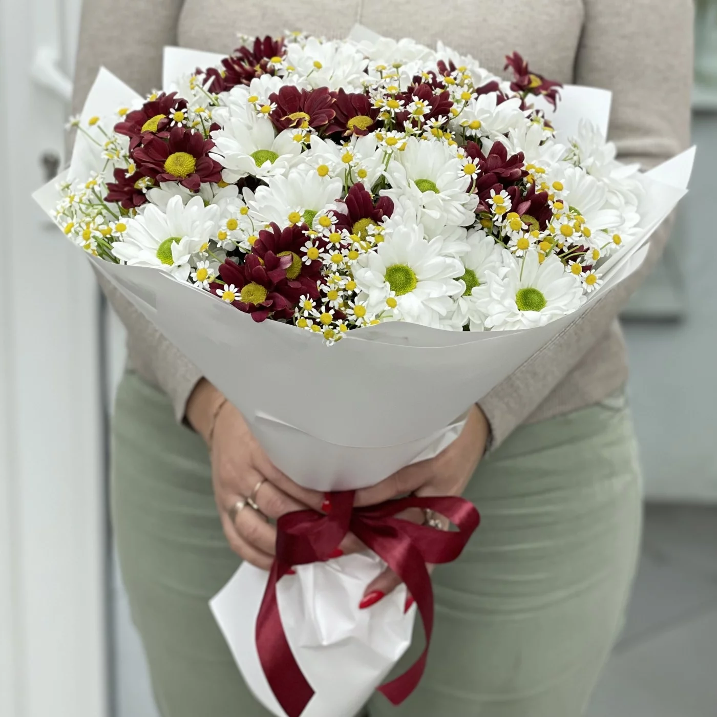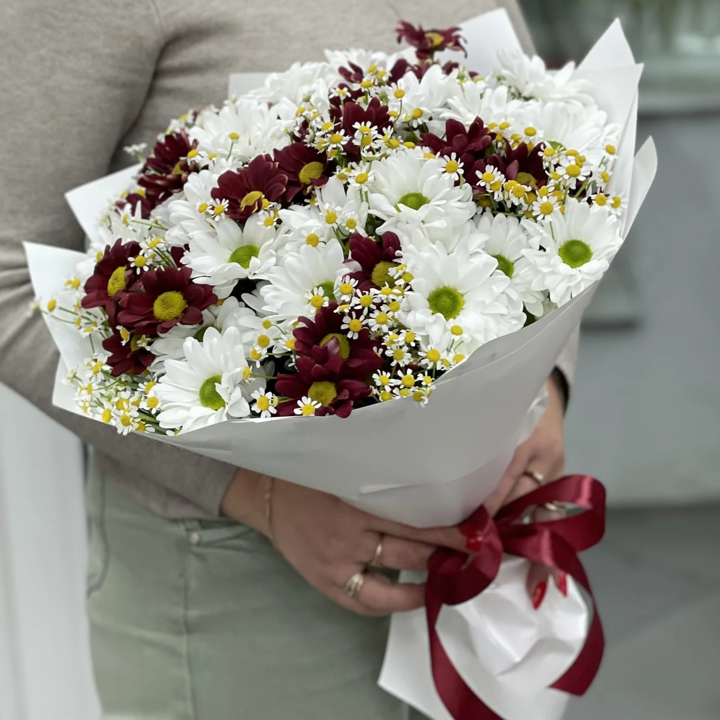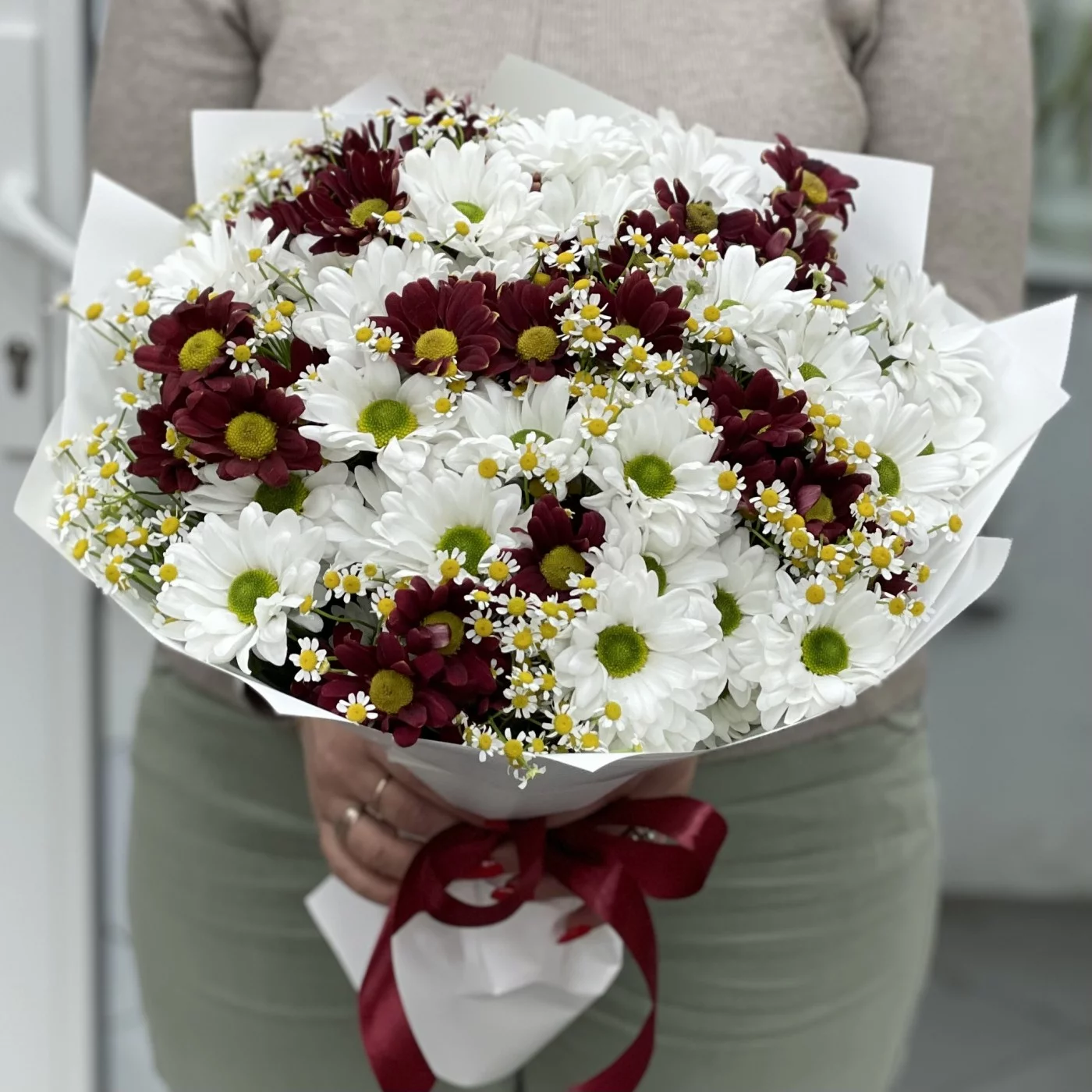 Букет из 13 кустовых хризантем Бакарди с ромашками — это прекрасное сочетание, которое объединяет красоту, яркость и нежность.