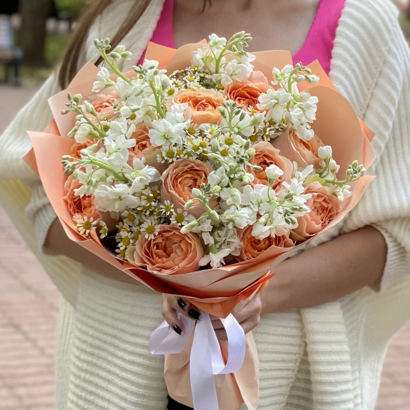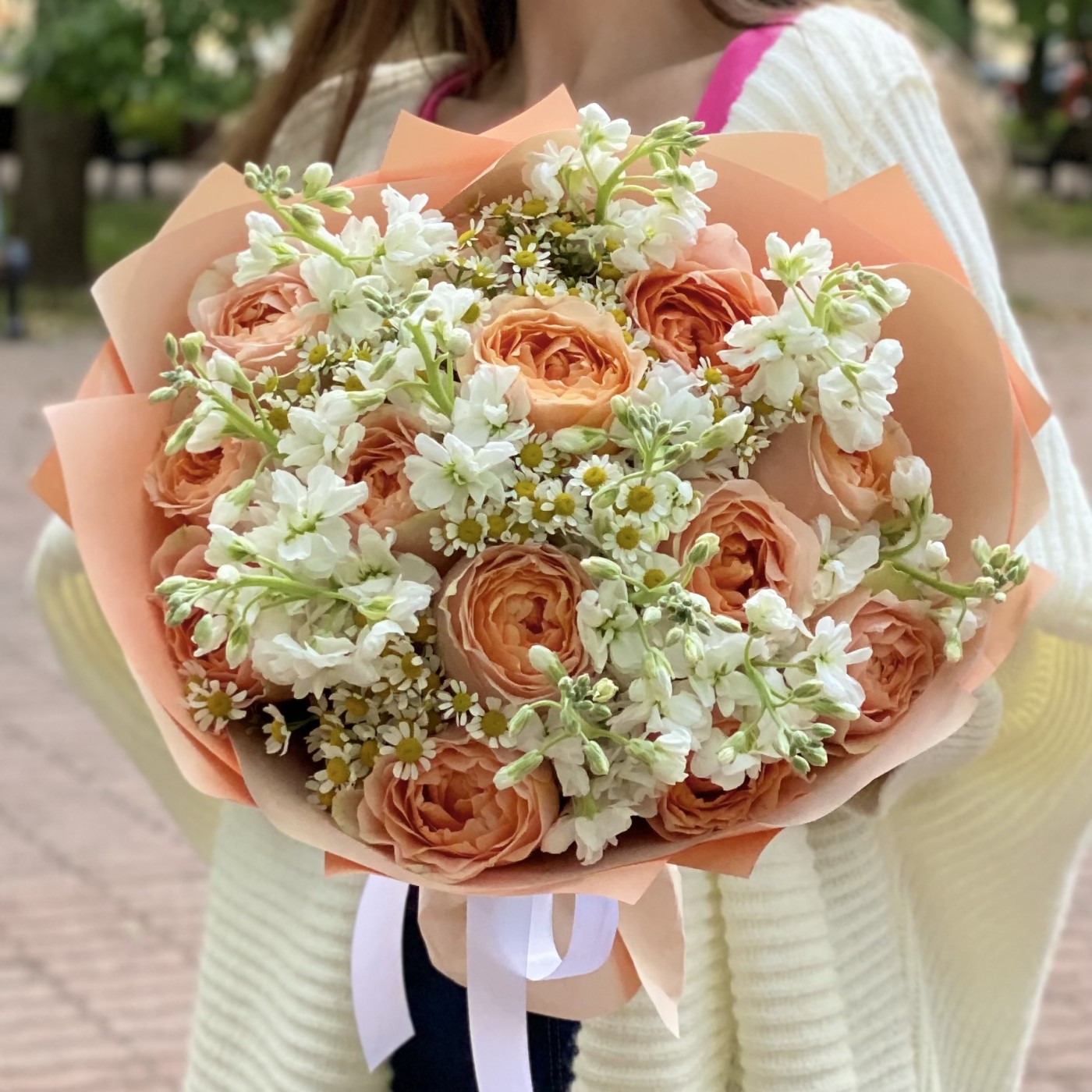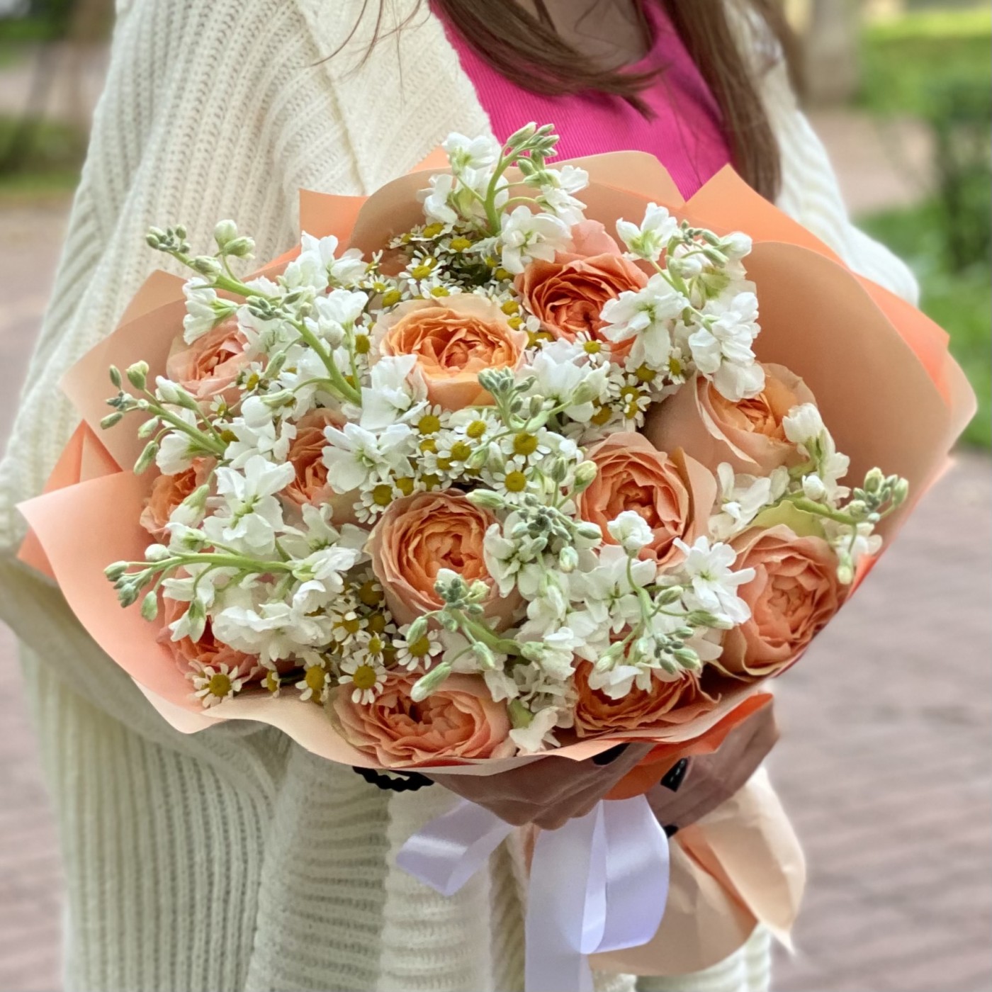 В этом букете идеально сочетаются между собой одноголовые пионовидные розы сорта Гравити, ромашки и ароматная белая маттиола.