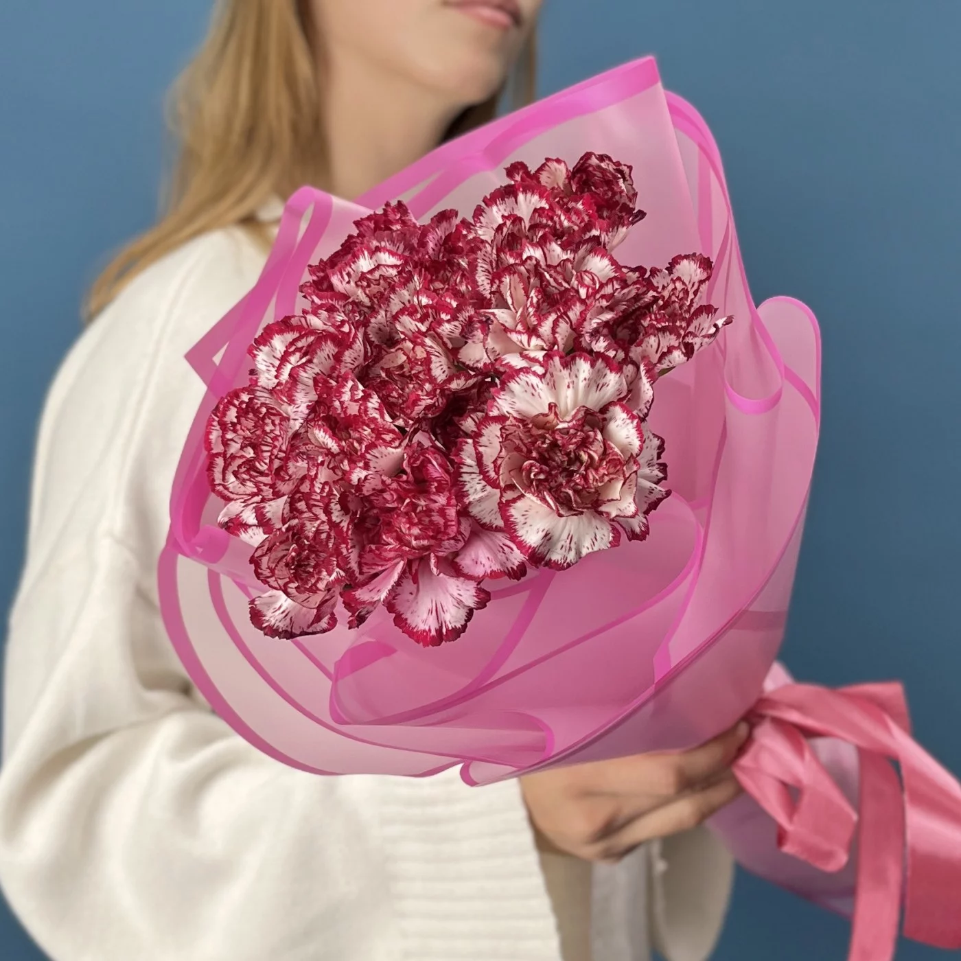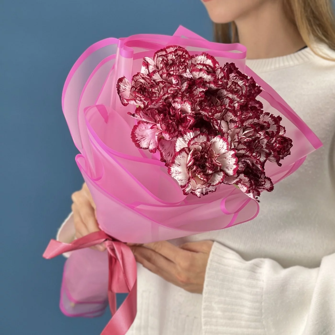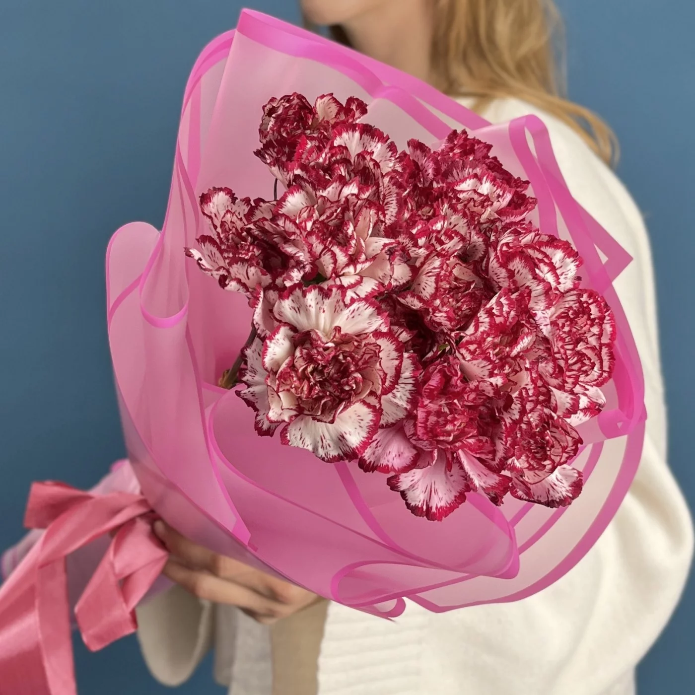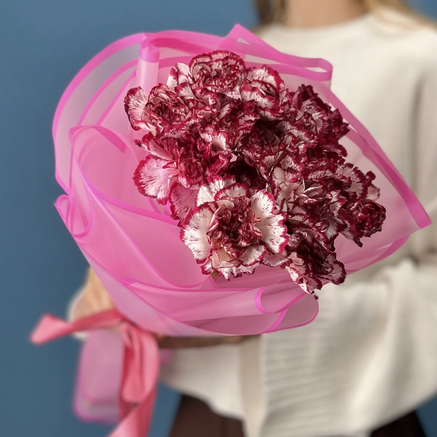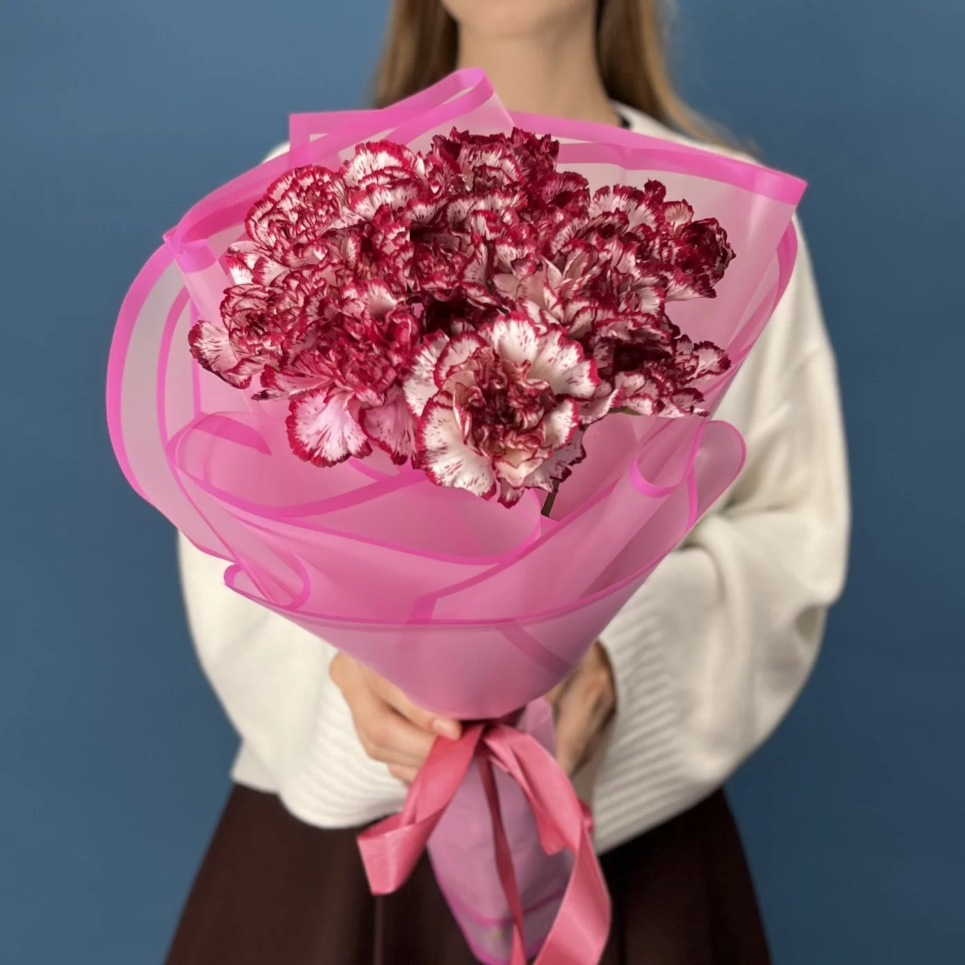 Букет из пятнадцати бело-бордовых гвоздик притягивает сочетанием контраста и изящества, где светлые лепестки мягко переходят в насыщенный оттенок, создавая впечатление уверенной и одновременно утончённой красоты. Его совершенство в том, что он выглядит выразительно без излишней пышности, а гармония формы и цвета дарит ощущение праздника и поднимает настроение. Такой букет подходит для поздравления с профессиональными достижениями, в знак уважения к человеку, который ценит стиль и аккуратность, для сюрприза любимому, поздравления мамы или учителя, а также для любого случая, когда хочется подчеркнуть значимость момента и подарить радость. Наша