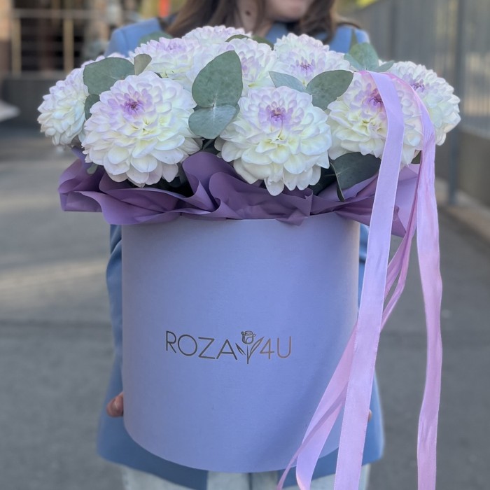 Нежная композиция из 15 бело-сиреневых георгин с ароматным эвкалиптом отличный вариант подарка на День рождения или юбилей.