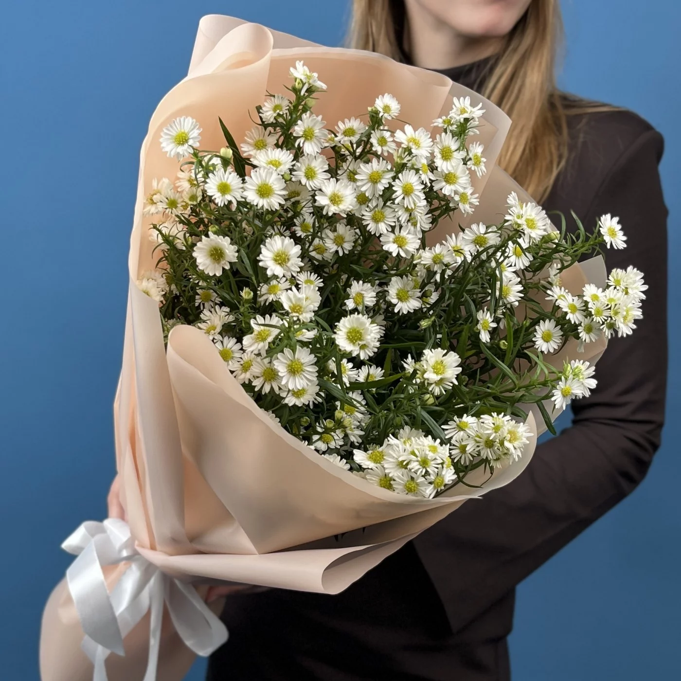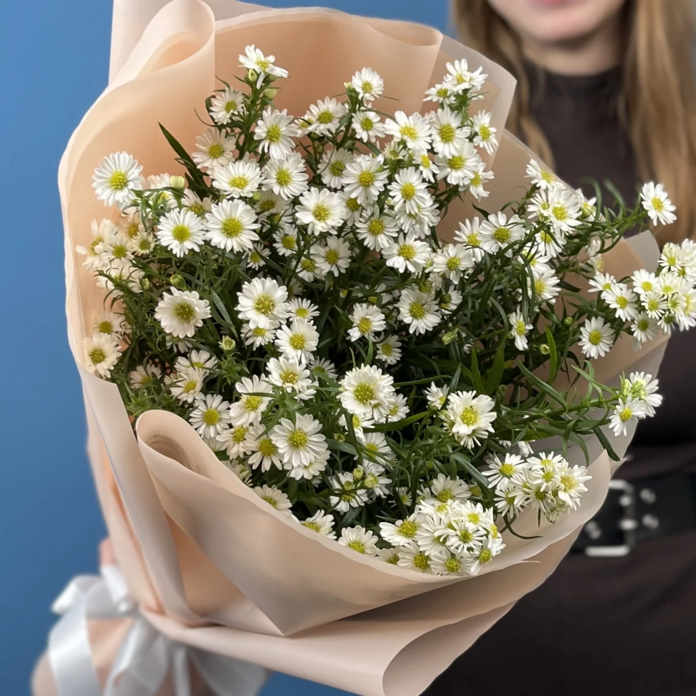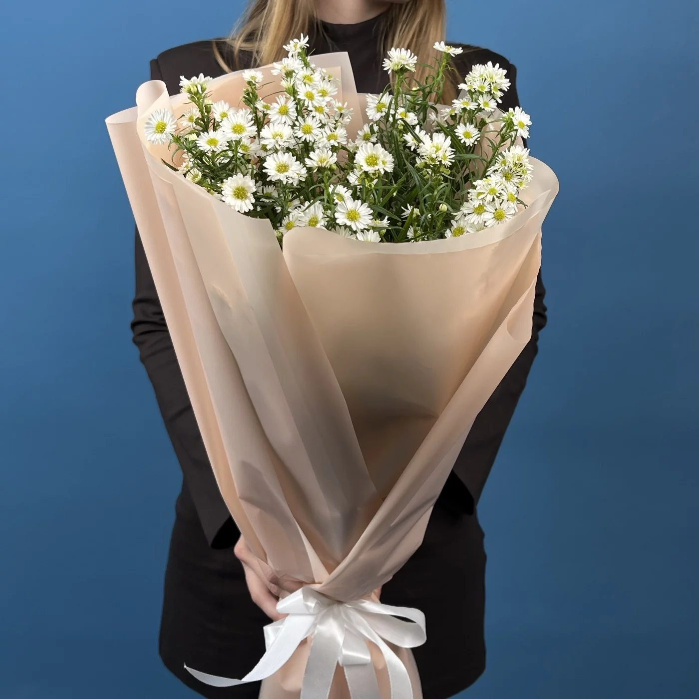 Этот утончённый букет состоит из 15 чистых белых астр — символов чистоты, невинности и искренних чувств.