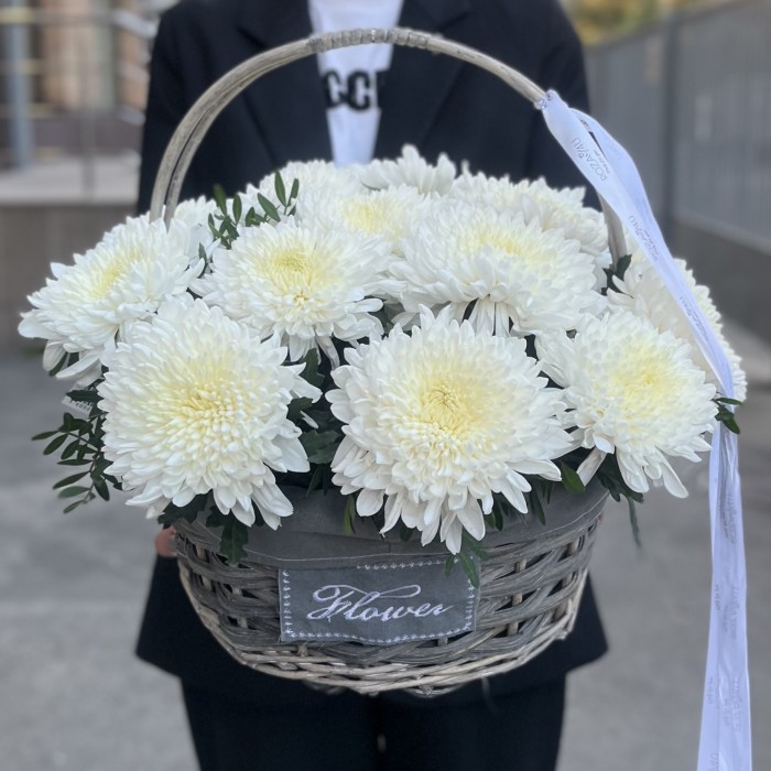 15 белых хризантем в корзине — это очень красивый и нежный подарок. Такие цветы символизируют радость, благополучие и дружеские чувства.