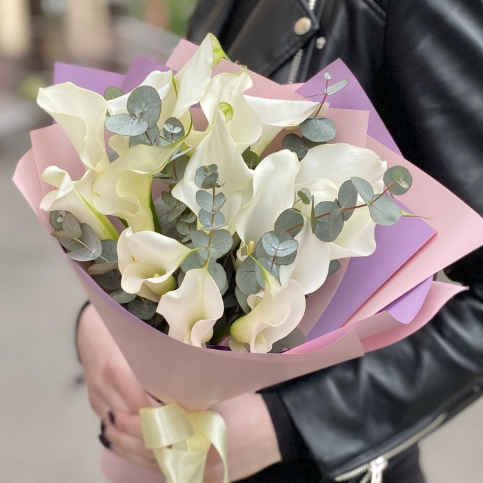 Букет из 15 белых калл с ароматным эвкалиптом - приятный сюрприз для вашей любимой.