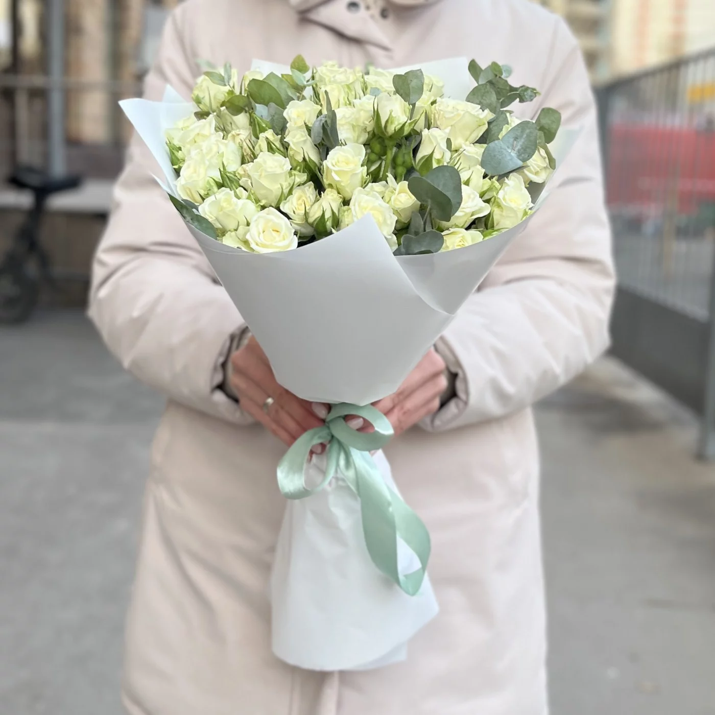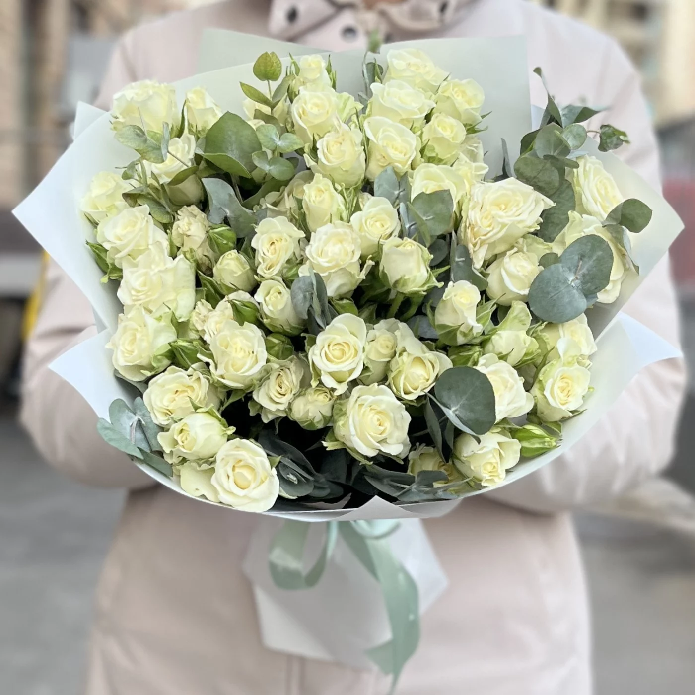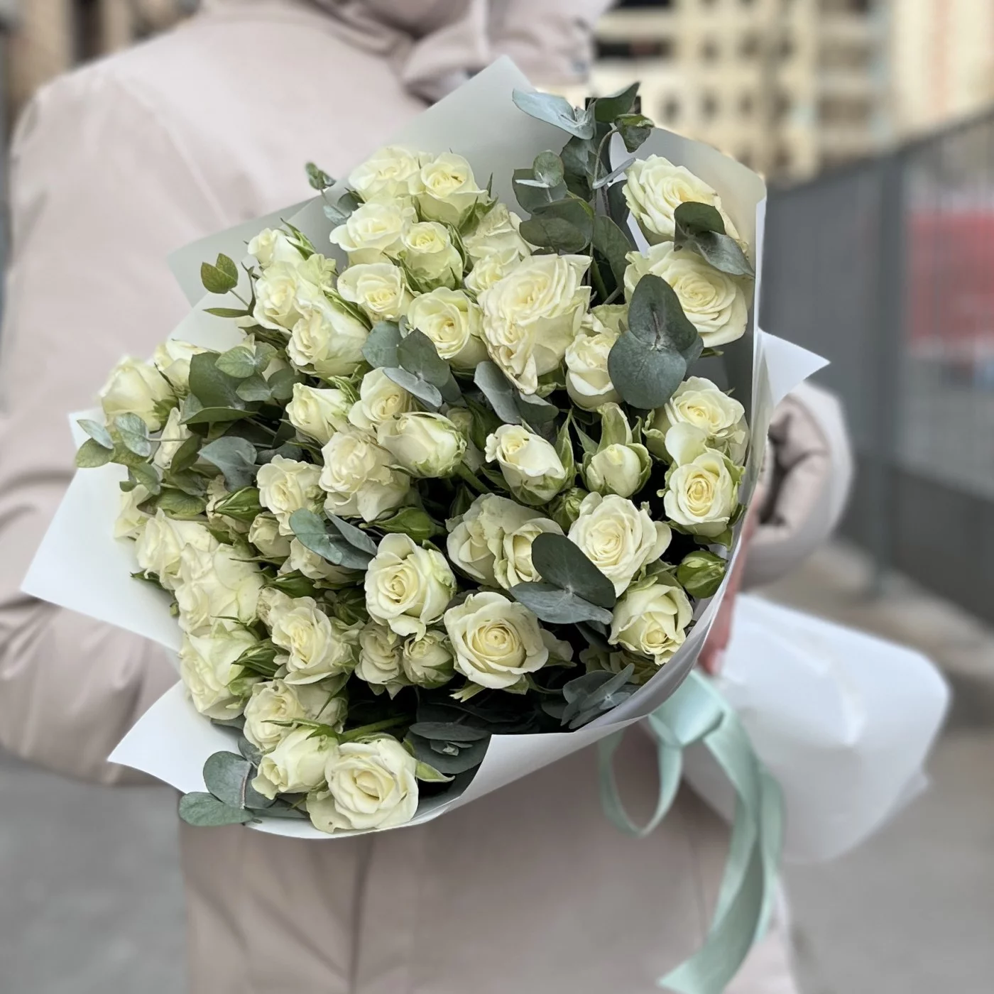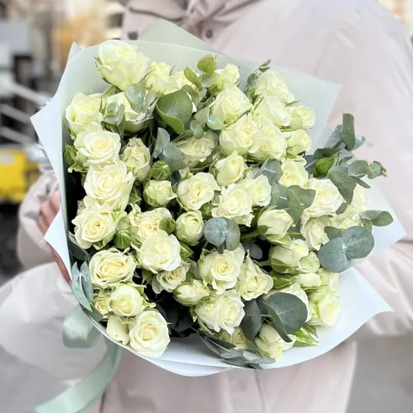 15 белых кустовых роз Сноуфлейк с эвкалиптом