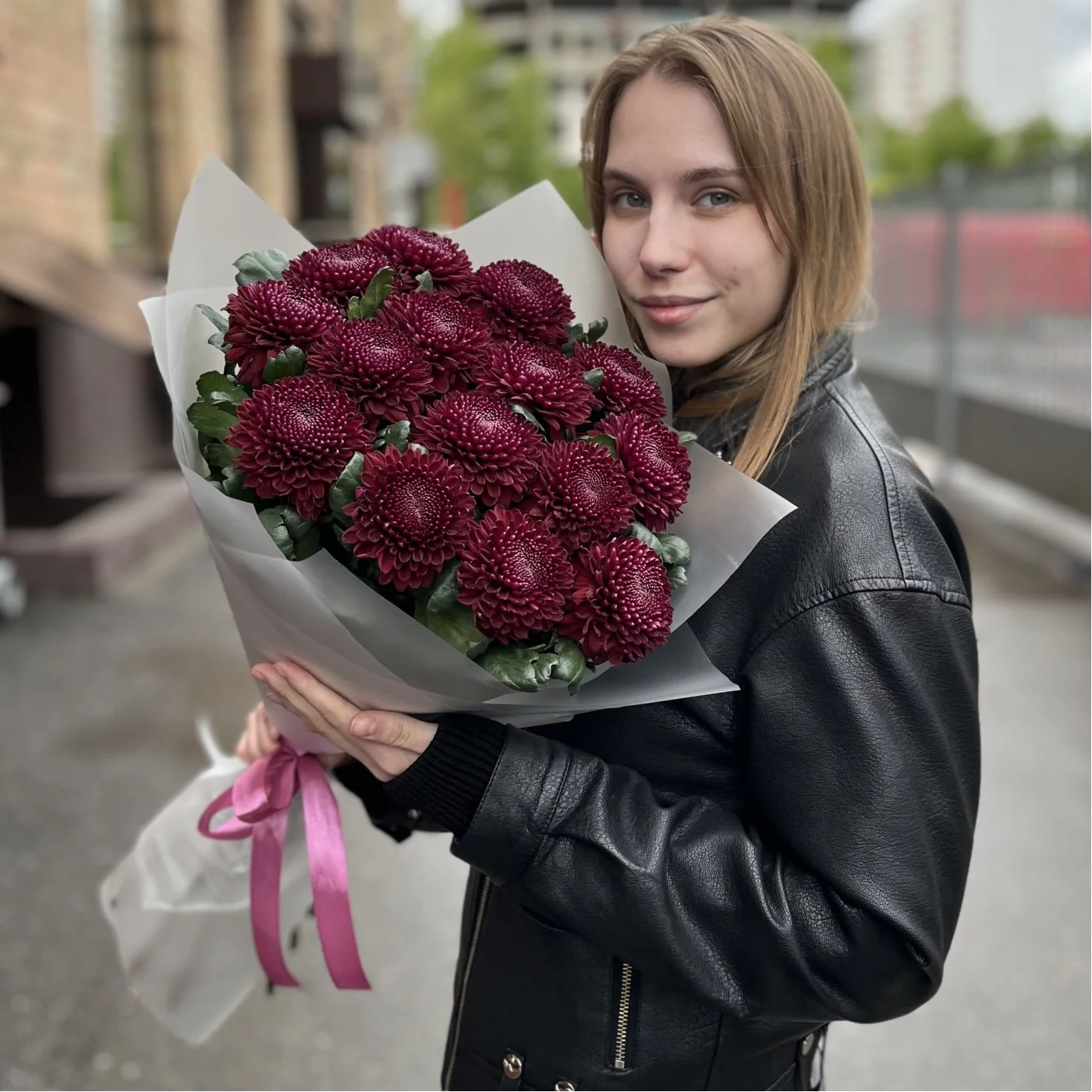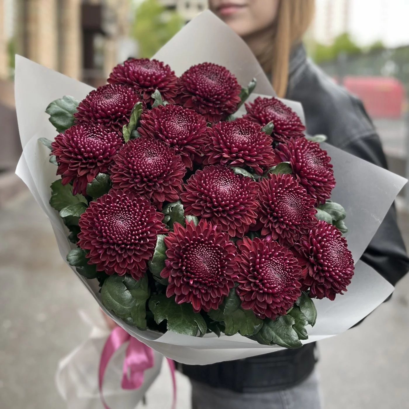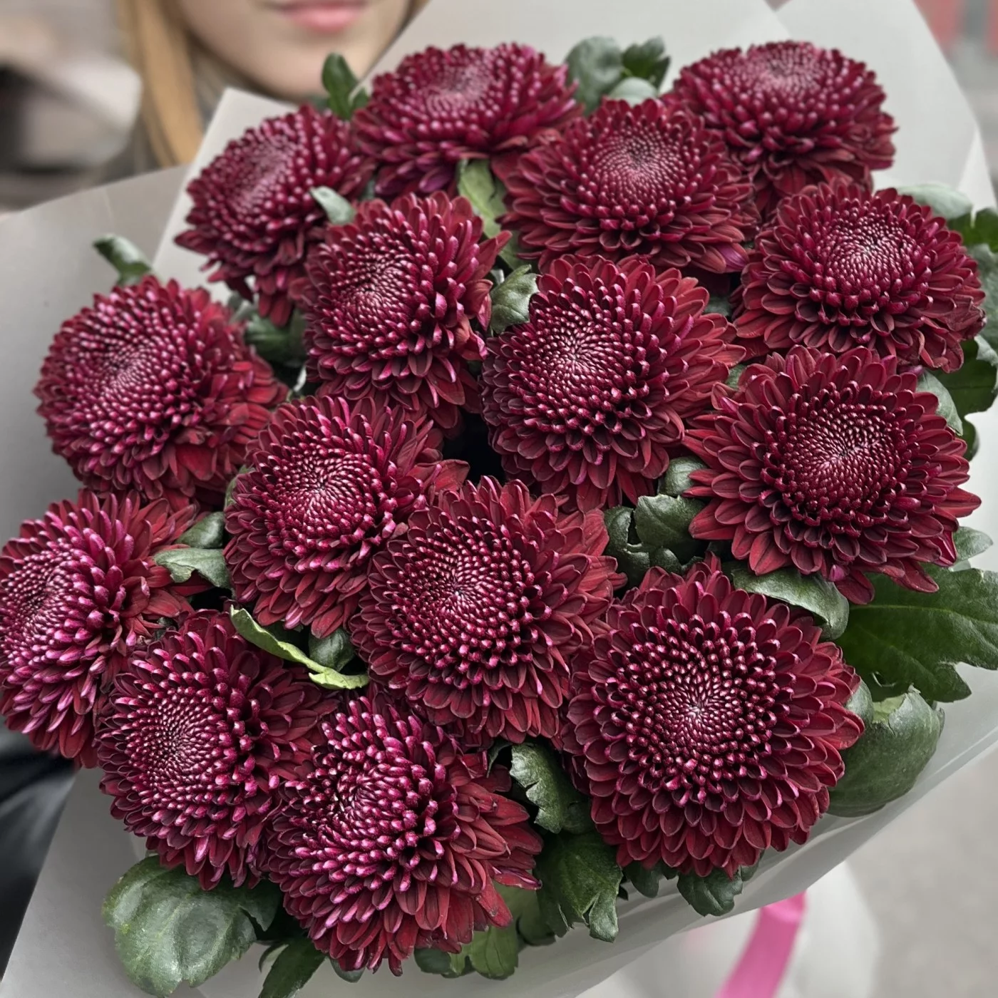 15 бордово-фиолетовых хризантем сорта Покер. В этом сочетании насыщенных бордовых и фиолетовых оттенков каждый цветок выглядит роскошно и выразительно, а аккуратное расположение создает гармоничную композицию.