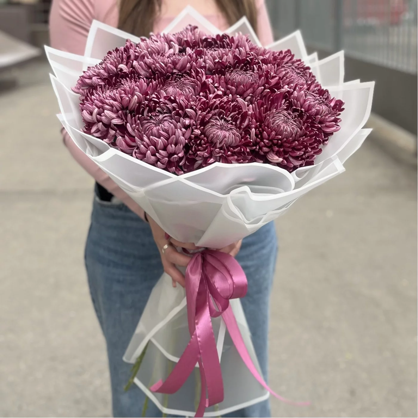 Букет из 15 крупных фиолетовых хризантем не оставит свою получательницу равнодушной.