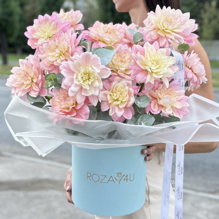 Нежная композиция из 15 розово-кремовых георгин с ароматным эвкалиптом отличный вариант подарка на День рождения, свадьбу или юбилей.