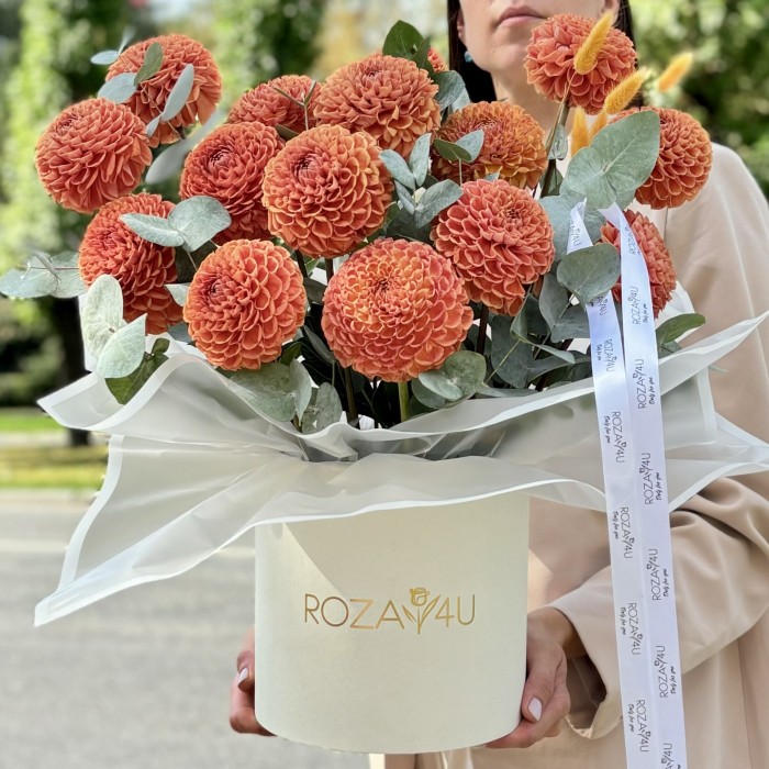 Яркая композиция из 15 коричнево-желтых георгин с ароматным эвкалиптом отличный вариант подарка на День рождения или юбилей.