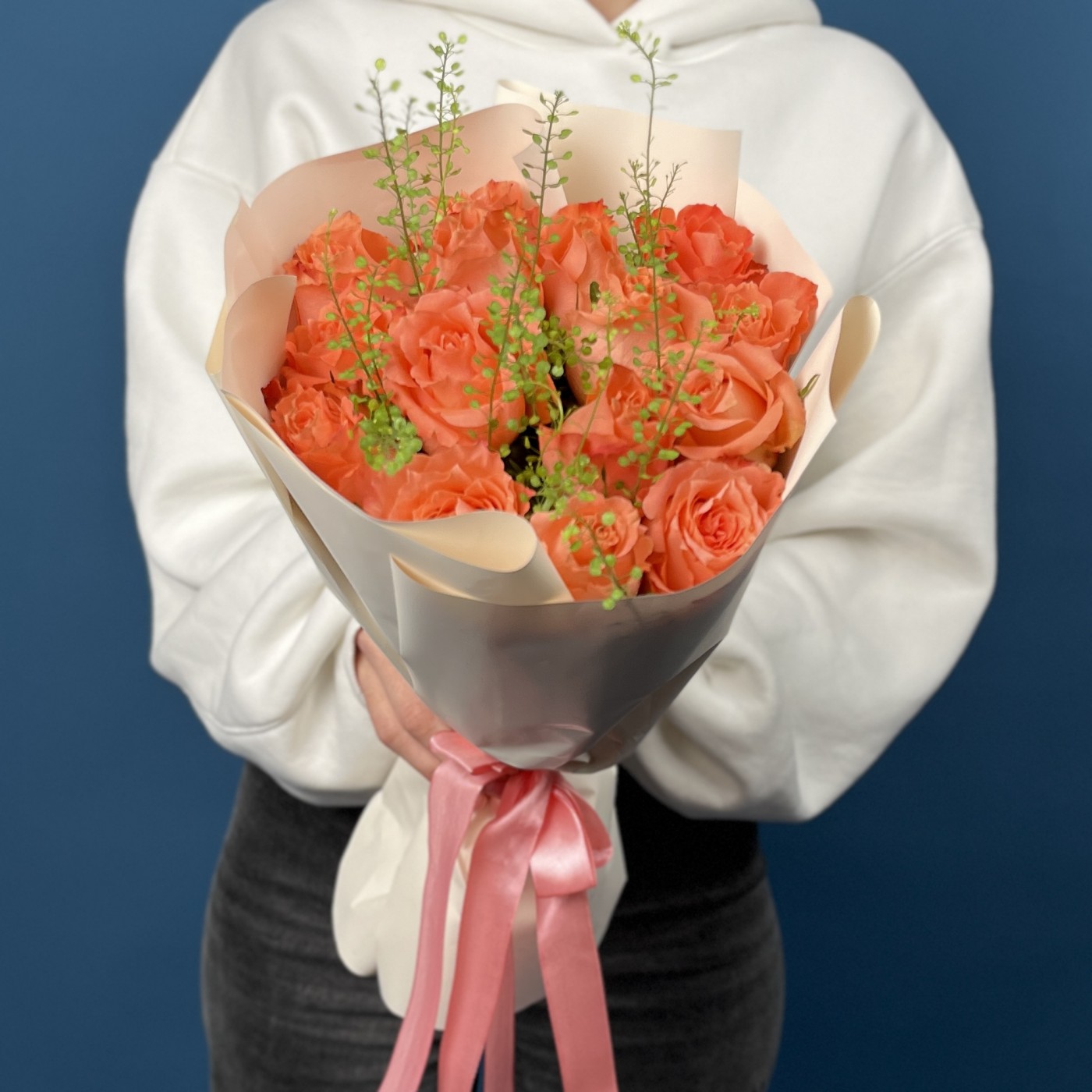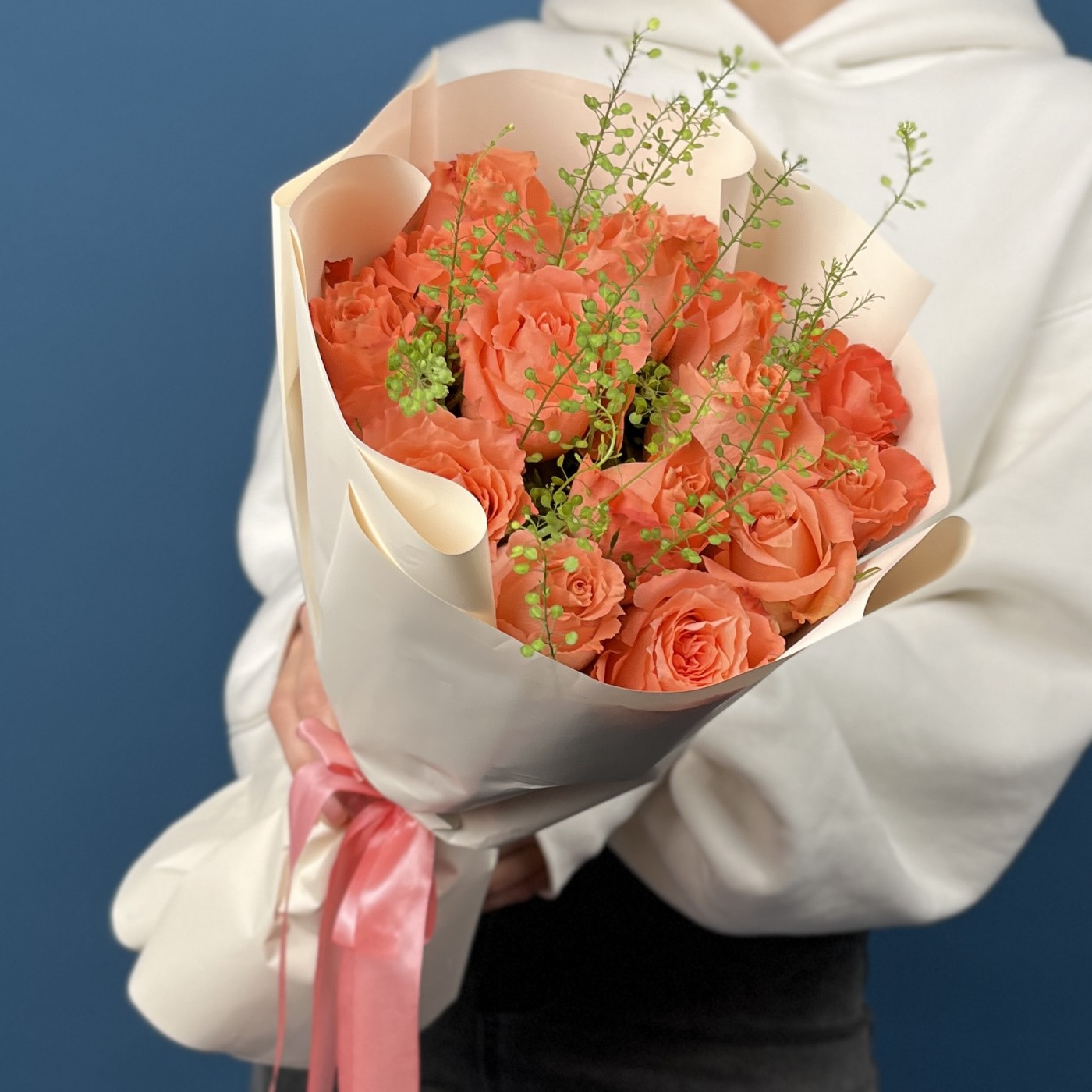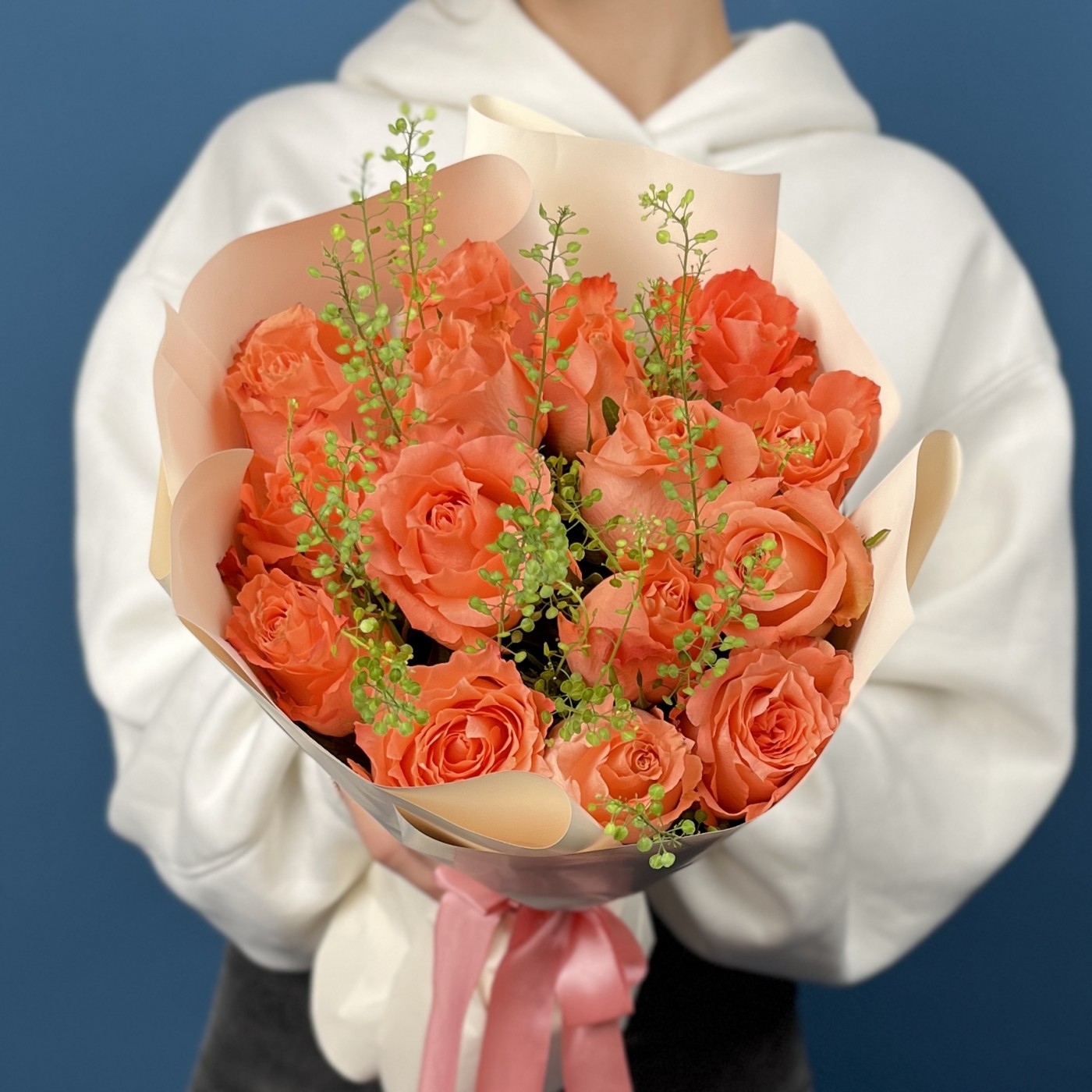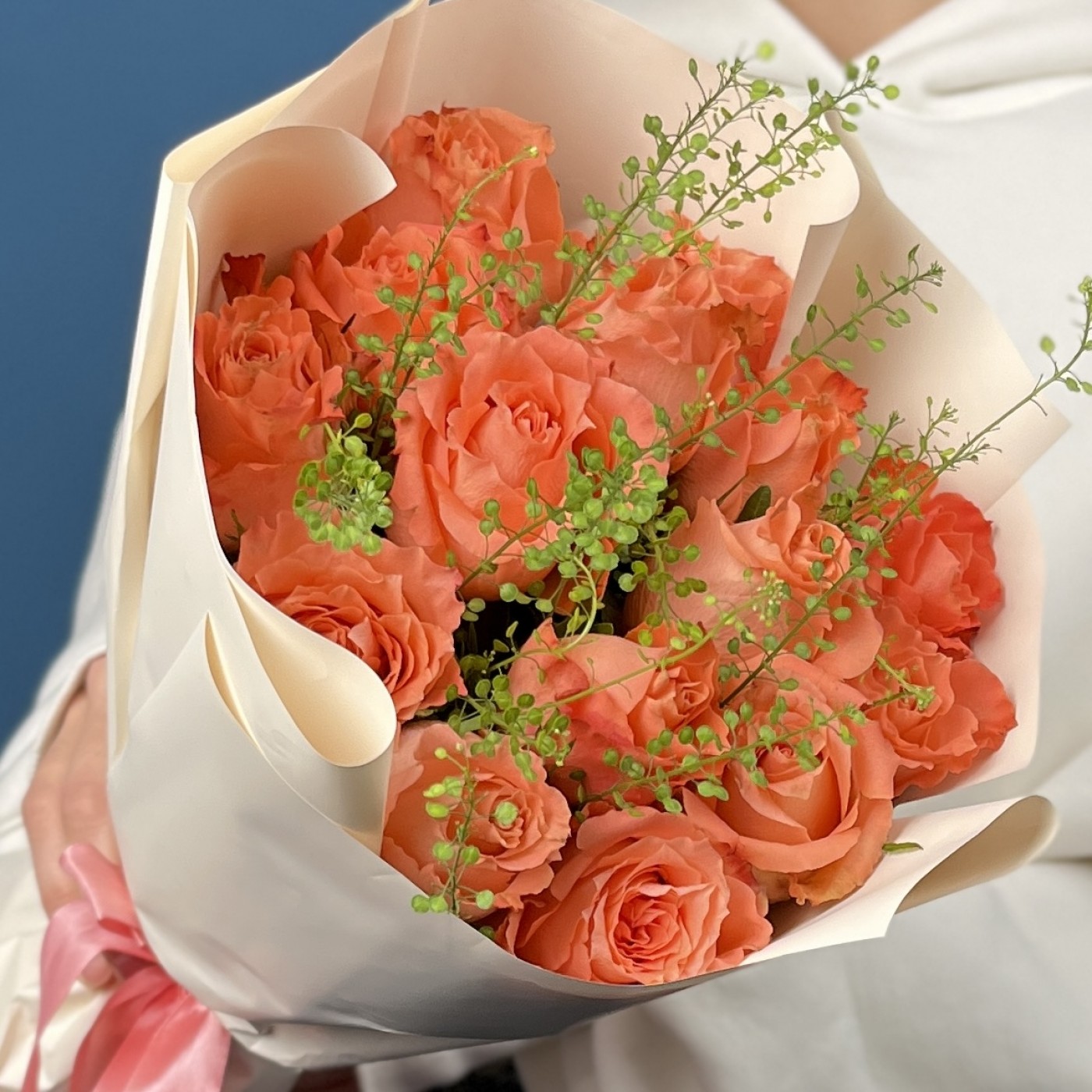 Элегантный букет из 15 коралловых роз сорта Юлечка с длиной стебля 40 см. Яркие и насыщенные оттенки создают теплую и праздничную атмосферу. Отличный выбор для подарка или оформления особого события, символизируя радость и нежность.