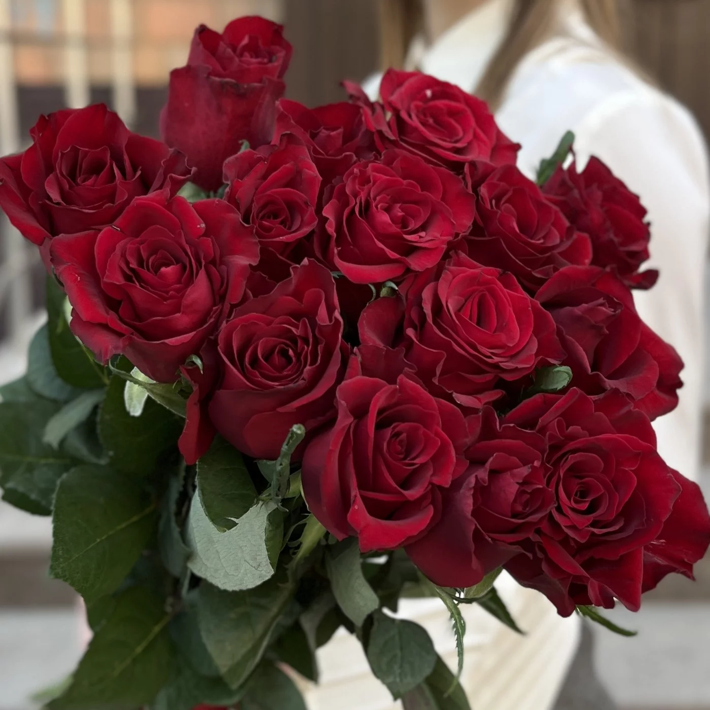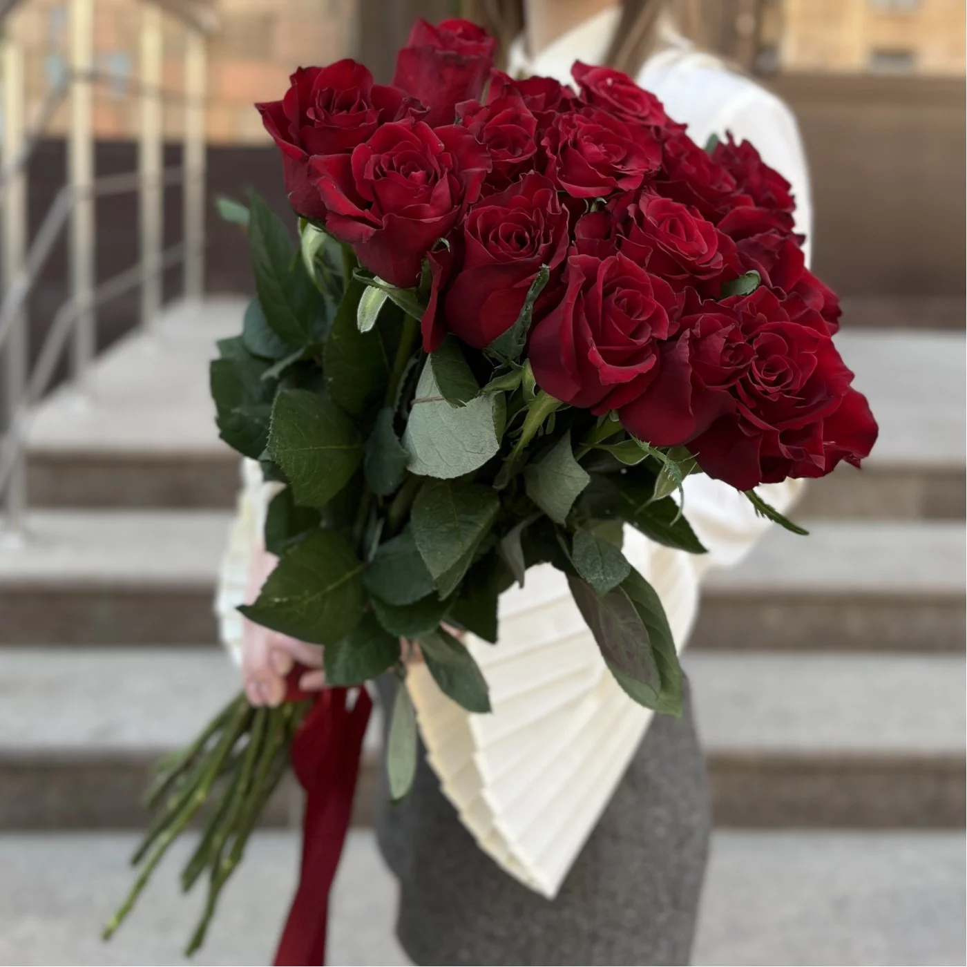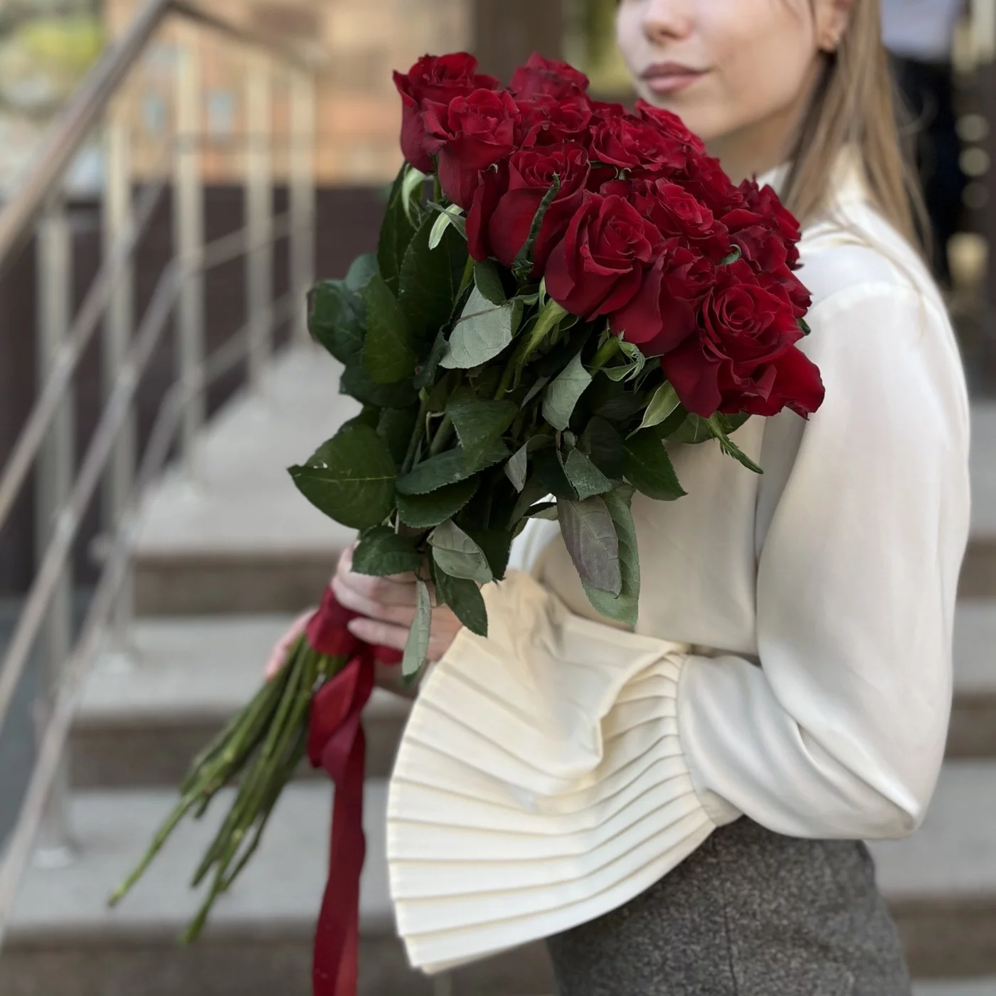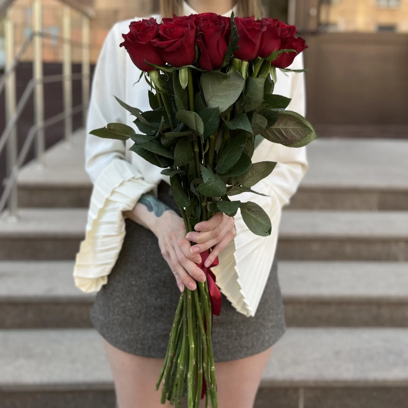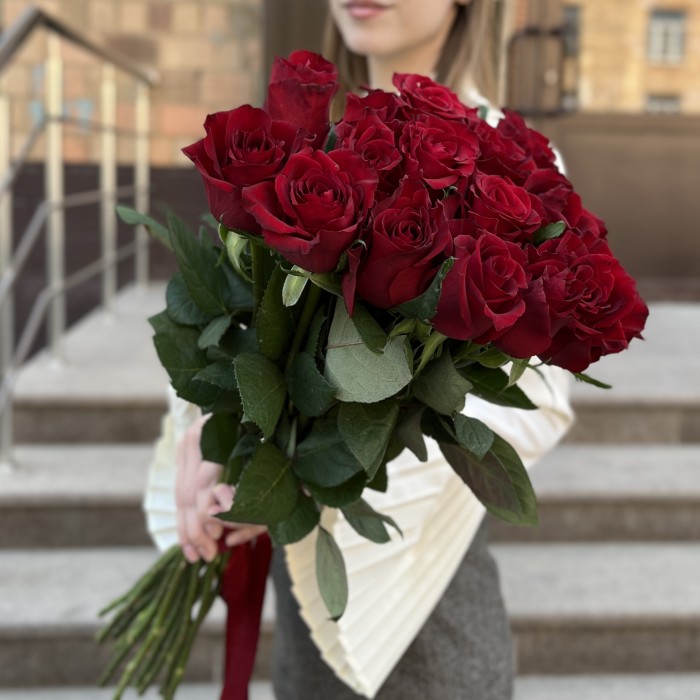Букет из 15 красных роз Эвер Ред 70 см выглядит очень стильно и элегантно. Он станет прекрасным дополнением к свадьбе, юбилею или другому торжественному событию.