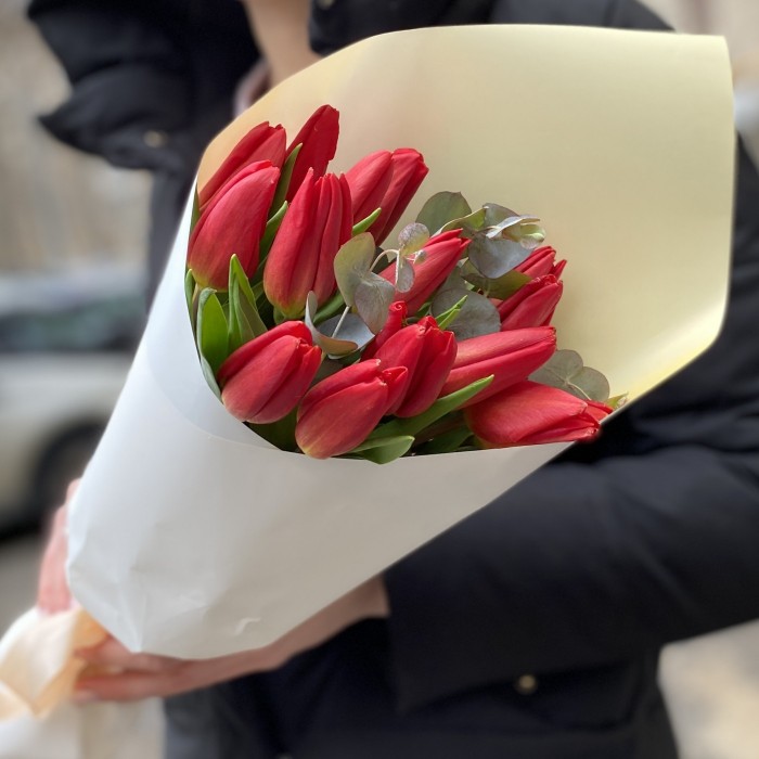 Корпоративный букет из весенних тюльпанов красного цвета и зелени эвкалипт. Букет