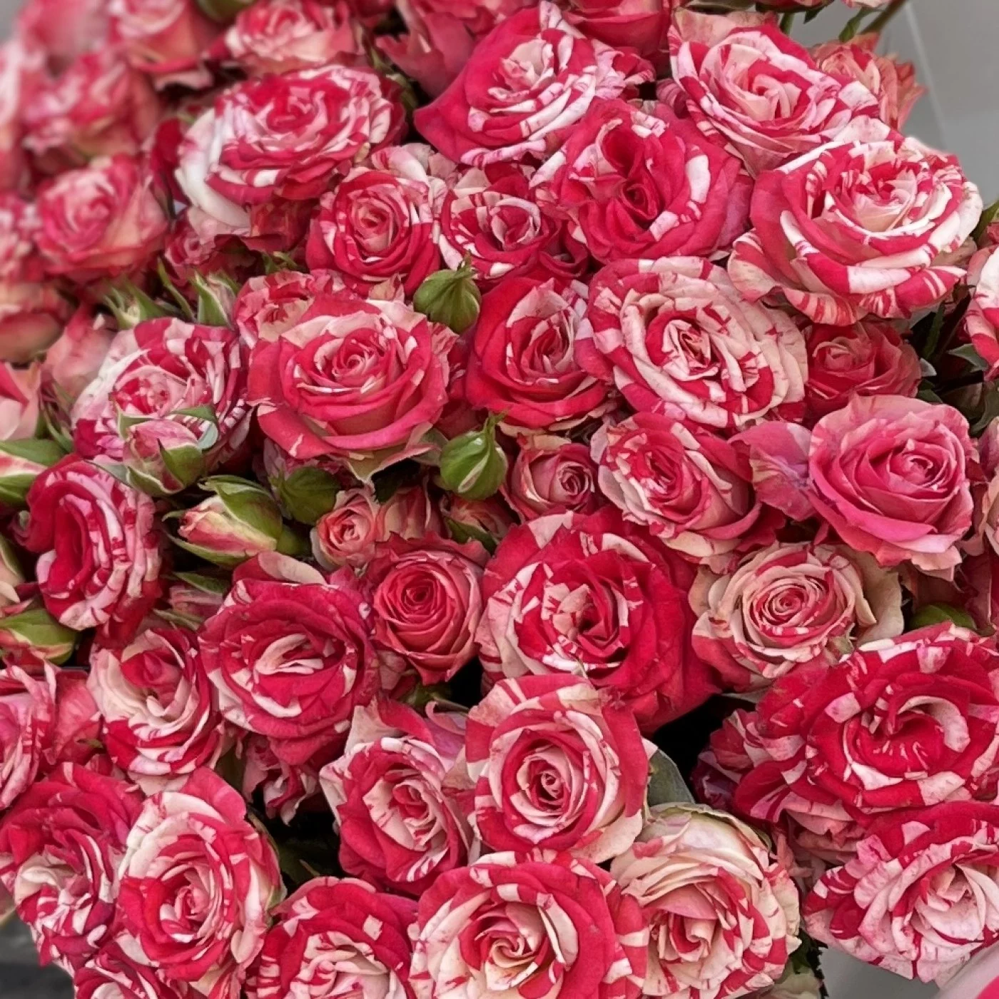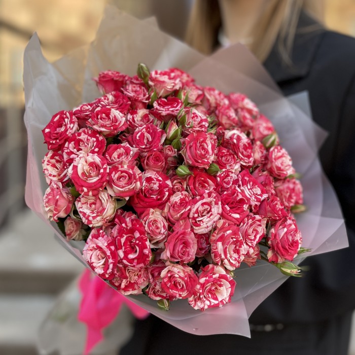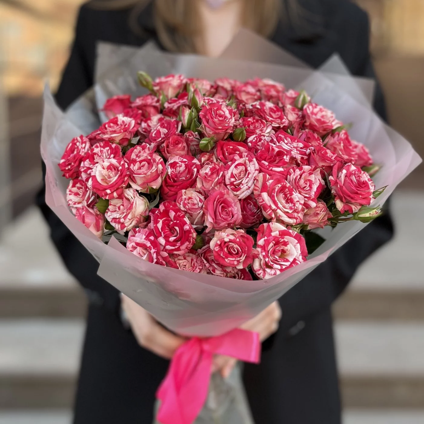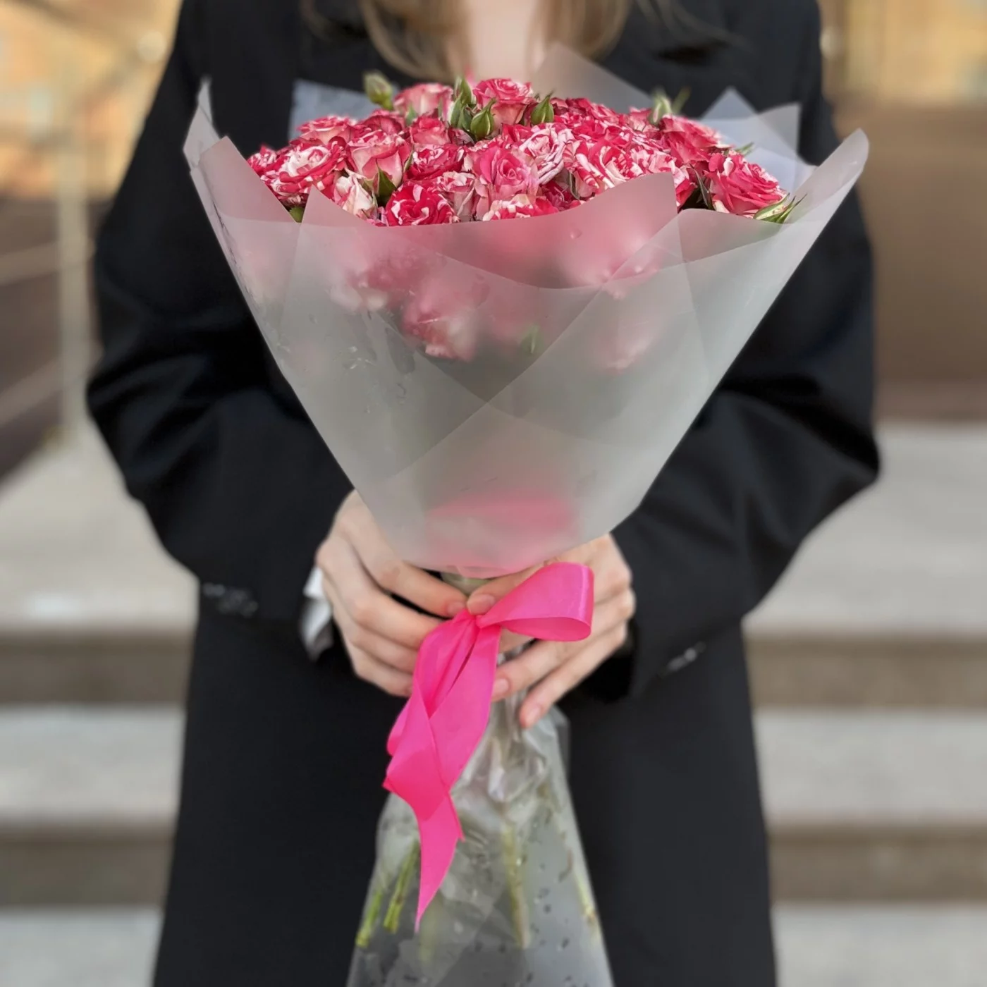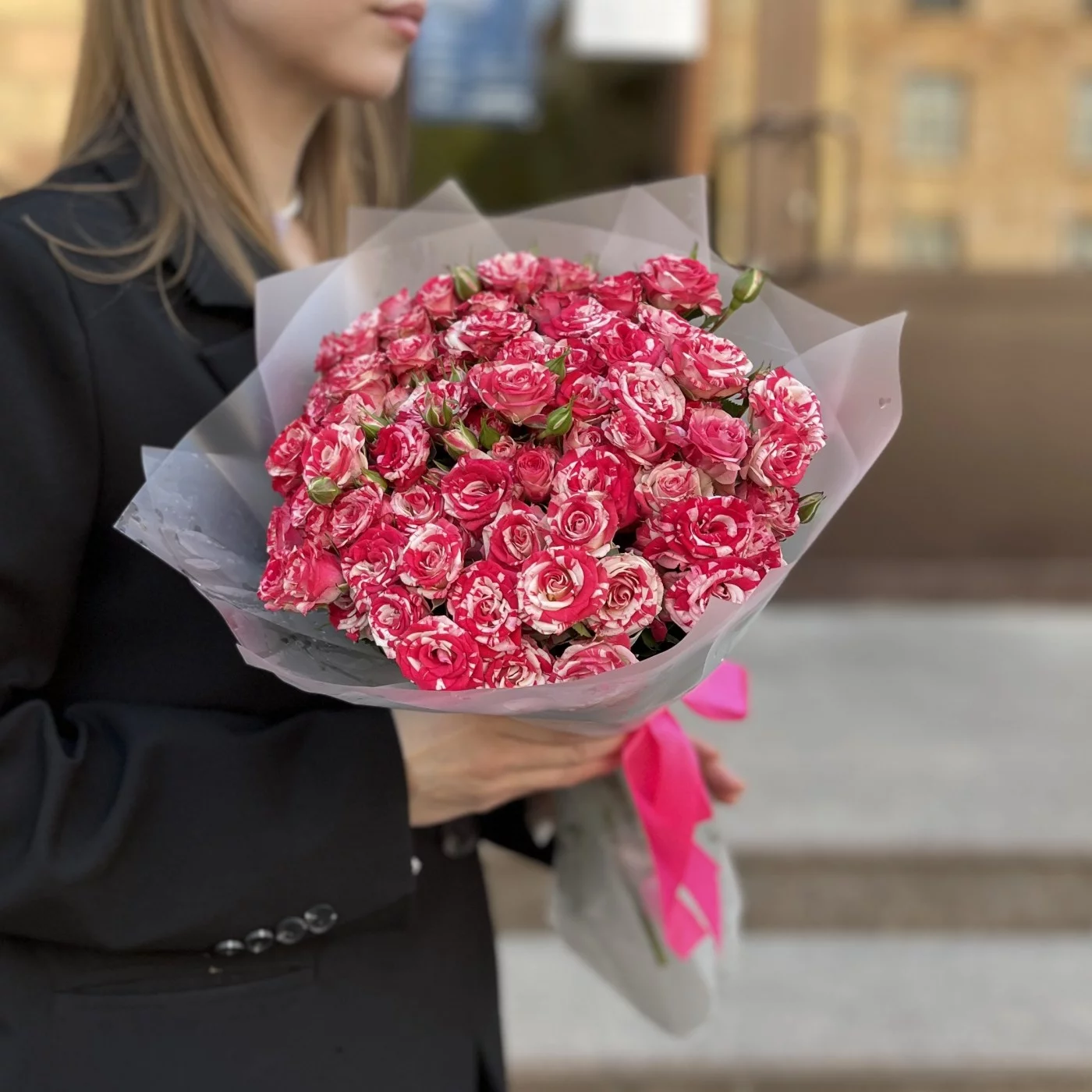15 кустовых бело-малиновых роз Файрворкс 40 см - прекрасный подарок подруге или коллеге в день рождения!