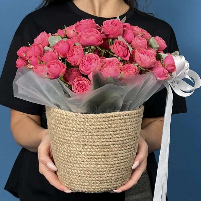 Изысканная композиция из 15 кустовых малиновых роз Гранд Трендсеттер, аккуратно размещенных в стильном кашпо. Насыщенный малиновый цвет и пышная пионовидная форма создают яркое и эффектное украшение для интерьера или приятный подарок. Такая аранжировка подчеркнет торжественность любого события и добавит уют и красоту в дом.