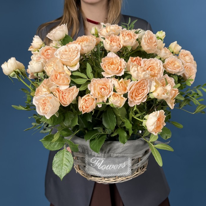 Композиция из 15 кустовых пионовидных роз Минеола в корзине — нежное сочетание утончённости и природного очарования. Персиково-розовые бутоны с бархатистыми лепестками распускаются мягкими волнами, излучая тепло и уют. Корзина добавляет естественности, делая композицию по-домашнему тёплой и по-настоящему очаровательной.